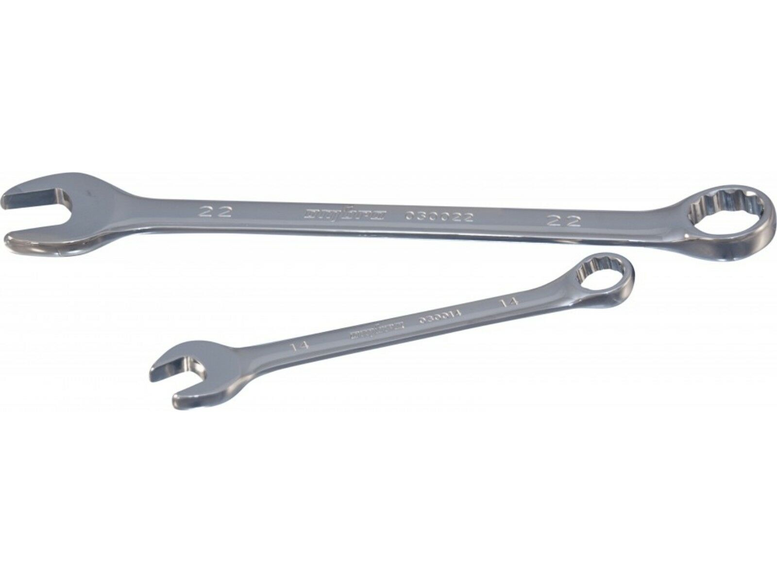 Самый распространенный гаечный ключ представляет собой конструкцию, объединяющую рожковую и накидную части. Инструмент изготовлен из высоколегированной стали, по стандарту ANSI/ASME B107.6 и соответствует требованиям ГОСТ 2838-80. Чечевичное сечение рукоятки с увеличенной толщиной ребра позволяет развить более высокий крутящий момент по сравнению с ключами двутаврового сечения европейского типа. Устойчивое к механическому воздействию и агрессивным средам зеркальное, трехслойное, хромоникелевое покрытие облегчает удаление загрязнений с инструмента после работы. Сочетание двух одноразмерных профилей компенсируют недостатки каждого в отдельности, обеспечивая передачу максимально возможной нагрузки на крепеж, при использовании накидной части и удобство использования рожковой части в труднодоступных местах. Область применения Ключи гаечные комбинированные ключи - универсальные гаечные ключи, совмещающие в себе функционал и преимущества рожковых и накидных ключей. Зевы комбинированных ключей имеют одинаковые размеры. Именно сочетание сильных сторон рожковых и накидных ключей и нивелирование сторон слабых делают комбинированные ключи исключительно широко востребованными со стороны потребителей и применяемыми в самых разных сферах - производственной, ремонтной, авторемонтной, бытовой и других. Ключи гаечные с открытым и кольцевым зевами предназначены для монтажа либо демонтажа резьбовых соединений. Размеры