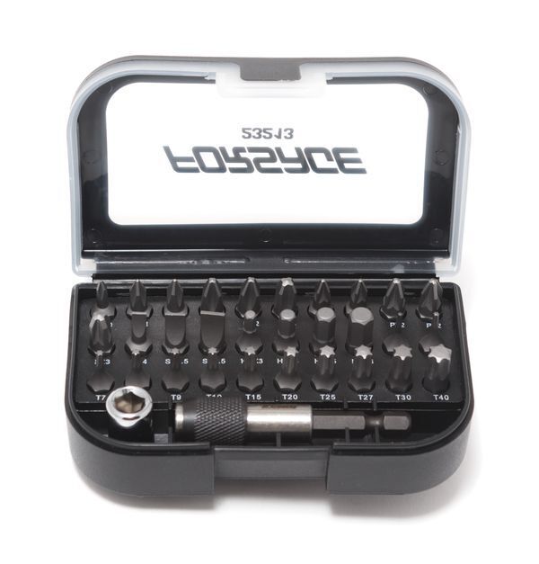 Посадочный квадрат 1/4". Комплектация: биты 1/4"HEX 25 мм: 3, 4, 5, 6 мм; биты 1/4"TORX 25 мм: T5, T6, T7, T8, T9, T10, T15, T20, T 25, T27, T30, T40; биты 1/4"SL 25 мм: 4, 5.5, 6.5; биты 1/4"РН 25 мм: РН.0, РН.1*2, РН.2*2, РН3; биты 1/4"PZ 25 мм: PZ.1*2, PZ.2*2, PZ.3; битодержатель под шуруповерт магнитный с цанговым зажимом 60 мм; битодержатель 1/4"(F)*1/4"(F) (HEX). В пластиковом футляре.