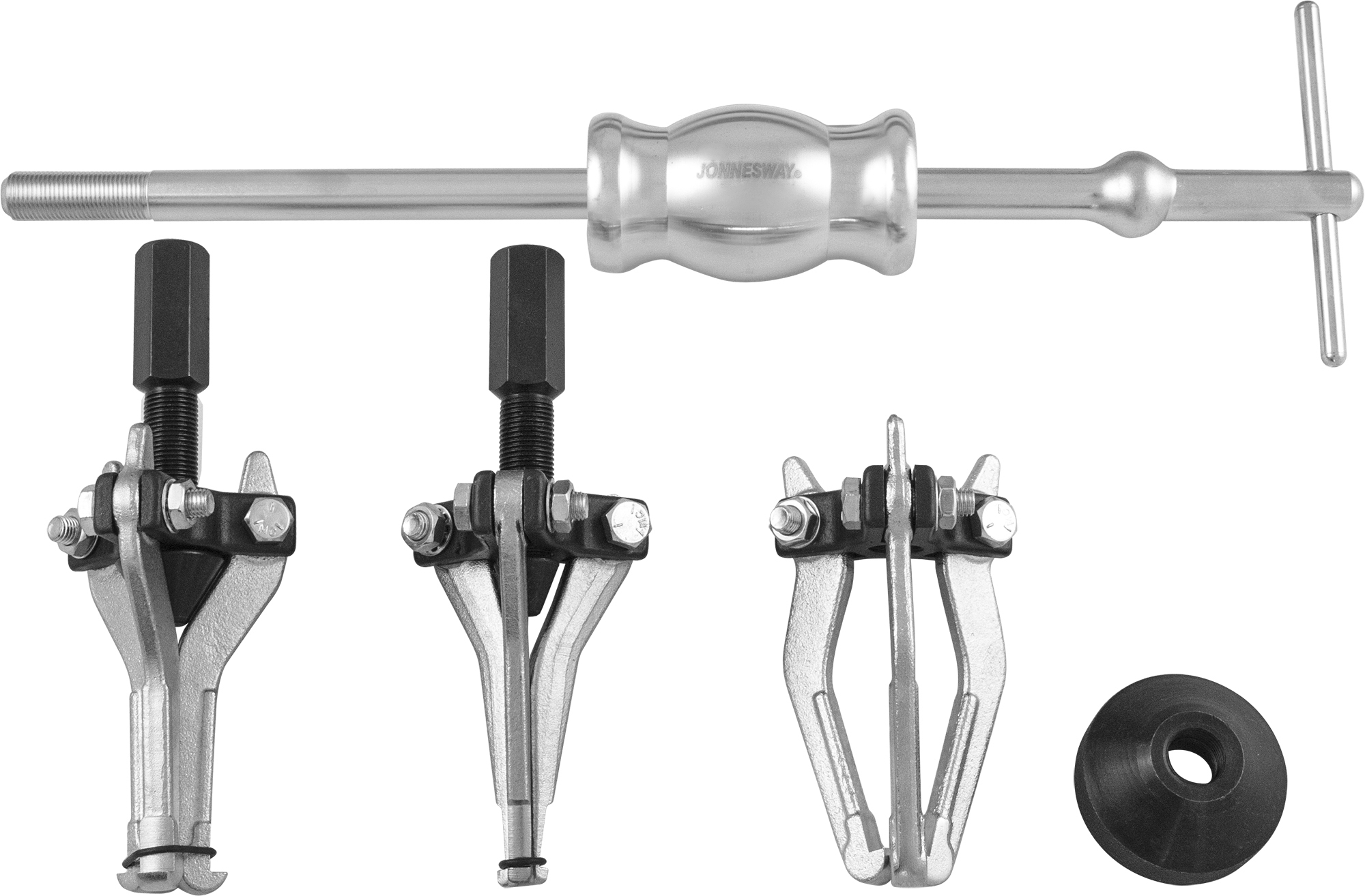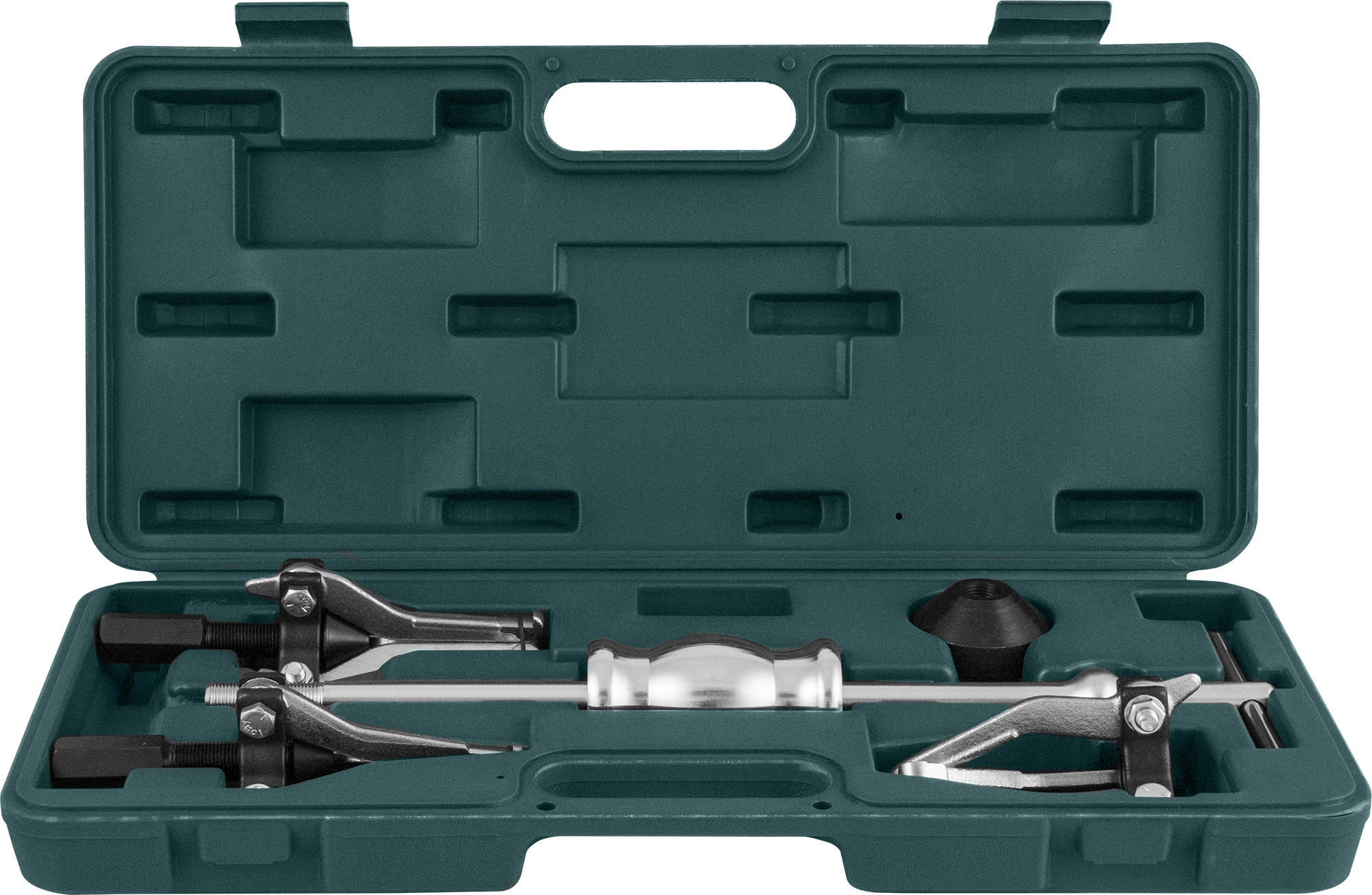Содержание: Съемник с внутренними захватами малый, диапазон 15-30 мм.; Съемник с внутренними захватами большой, диапазон 30-80 мм.; Съемник с внешними захватами, диапазон 15-80 мм.; Конический фиксатор; Штанга L = 425 мм.; Боек массой 1.2 кг.; Пластиковый кейс.