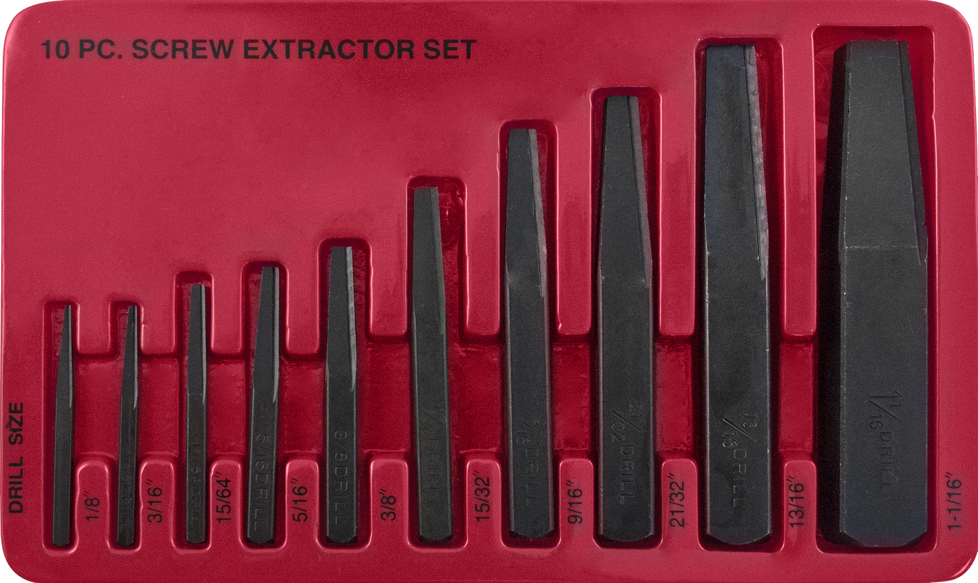 СОДЕРЖАНИЕ: Экстракторы № 1 для шпилек, диаметром 3 мм (1/8”) № 2 для шпилек, диаметром 5 мм (3/16”) № 3 для шпилек, диаметром 6 мм (15/64”) № 4 для шпилек, диаметром 8 мм (5/16”) № 5 для шпилек, диаметром 10 мм (3/8”) № 6 для шпилек, диаметром 12 мм (15/32”) № 7 для шпилек, диаметром 14 мм (9/16”) № 8 для шпилек, диаметром 16 мм (21/32”) № 9 для шпилек, диаметром 20 мм (13/16”) № 10 для шпилек, диаметром 26 мм (1-1/16”)