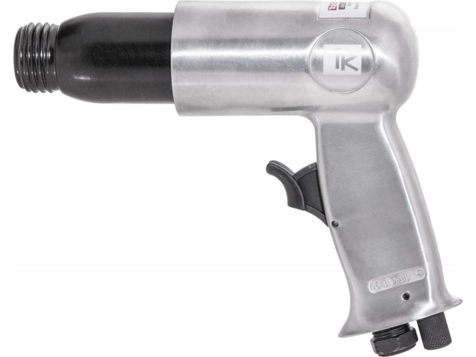 Молоток пневматический 190 мм в наборе с насадками, 9 пр. Область применения Молоток пневматический THORVIK применяется для резки, рубки, разрушения материалов различной твердости и пластичности в зависимости от используемой насадки в мастерских и цехах, оборудованных воздушной магистралью с давлением воздуха не ниже 6 атм. или компрессором, такой же мощности персоналом, имеющим соответствующую квалификацию, знакомым с правилами техники безопасности, условиями эксплуатации и навыками работы с пневмомеханическим инструментом. Технические характеристики Инструкция по эксплуатации Перед началом работы необходимо прикрутить штуцер для последующего присоединения к пневмомагистрали и произвести смазку изделия, для этого нанесите 4-5 капель лубрикаторного масла во внутрь изделия через штуцер подачи воздуха. Для удобства проведения такой процедуры, используйте масленку, входящую в комплектацию данного набора. Продуйте соединительный шланг сильным напором воздуха для удаления конденсата, подсоедините инструмент к воздушному шлангу, установите нужное давление в магистрали на входе (не более 6,3 атм. (кгс/смкв.) при включенном инструменте), при работе с шлангом, длинной более 8 м., давление в магистрали можно увеличить.