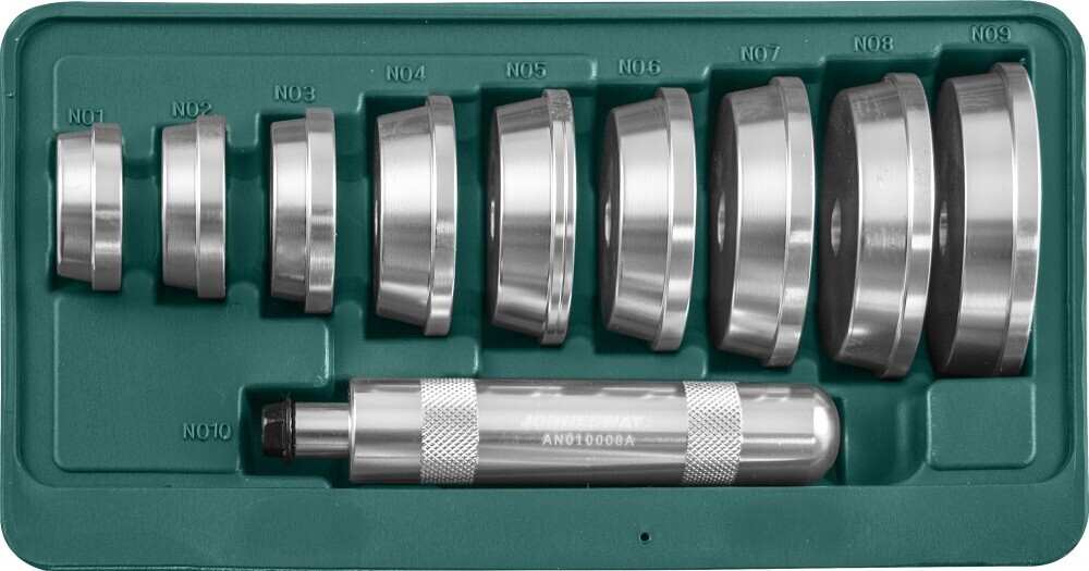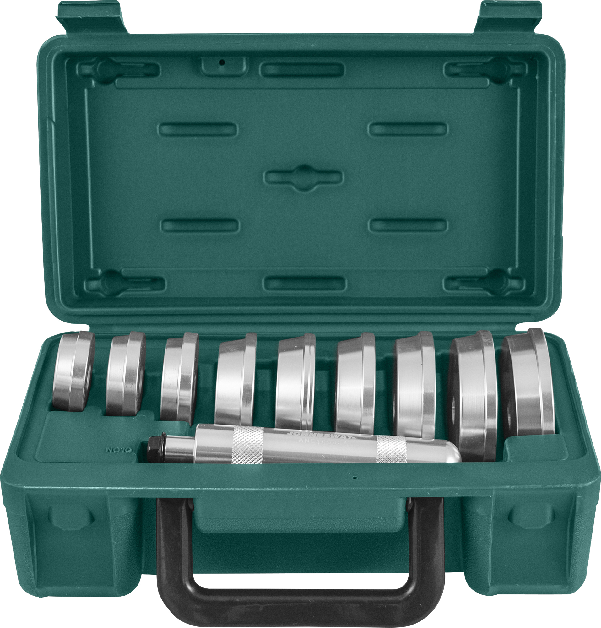 Содержание: Оправки конические с буртом 9 шт: Ø 40, 45, 50, 60, 63, 65, 71, 76, 81 мм.; Установочная рукоятка; Пластиковый кейс.