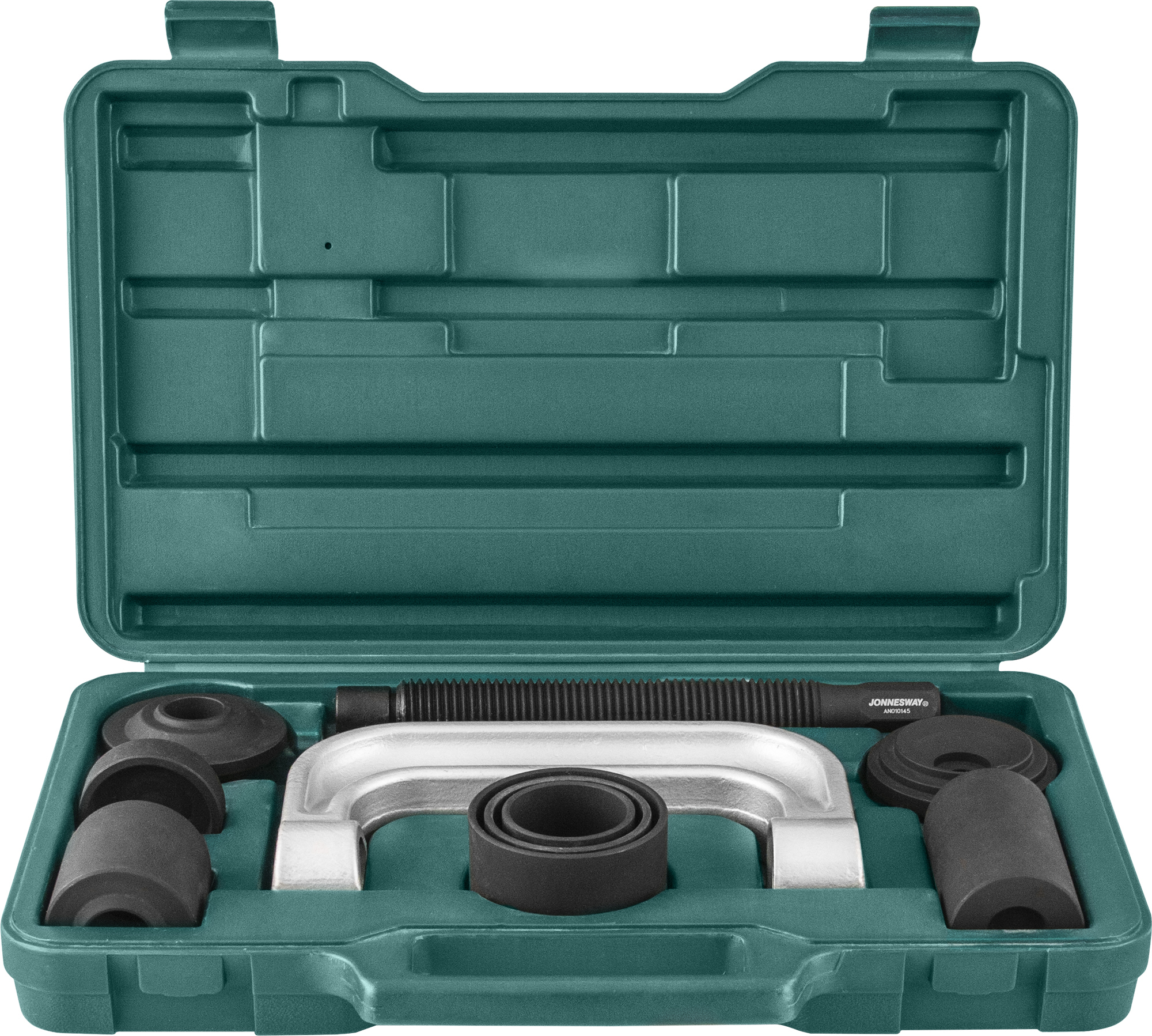 Содержание: Струбцина; Ходовой винт; Установочный адаптер (устанавливается в верхнюю часть струбцины и упирается в палец шарового шарнира); Приемные втулки, размерами: 50, 63, и 76 мм. (устанавливаются под рычаг при демонтаже шаровой опоры и на рычаг, при монтаже); Адаптер-толкатель (устанавливается на втулку ходового винта); Установочный адаптер «глухой»; Дополнительная приемная втулка (устанавливается на втулку ходового винта без адаптера); Дополнительная приемная втулка L= 90 мм. (устанавливается на втулку ходового винта без адаптера).