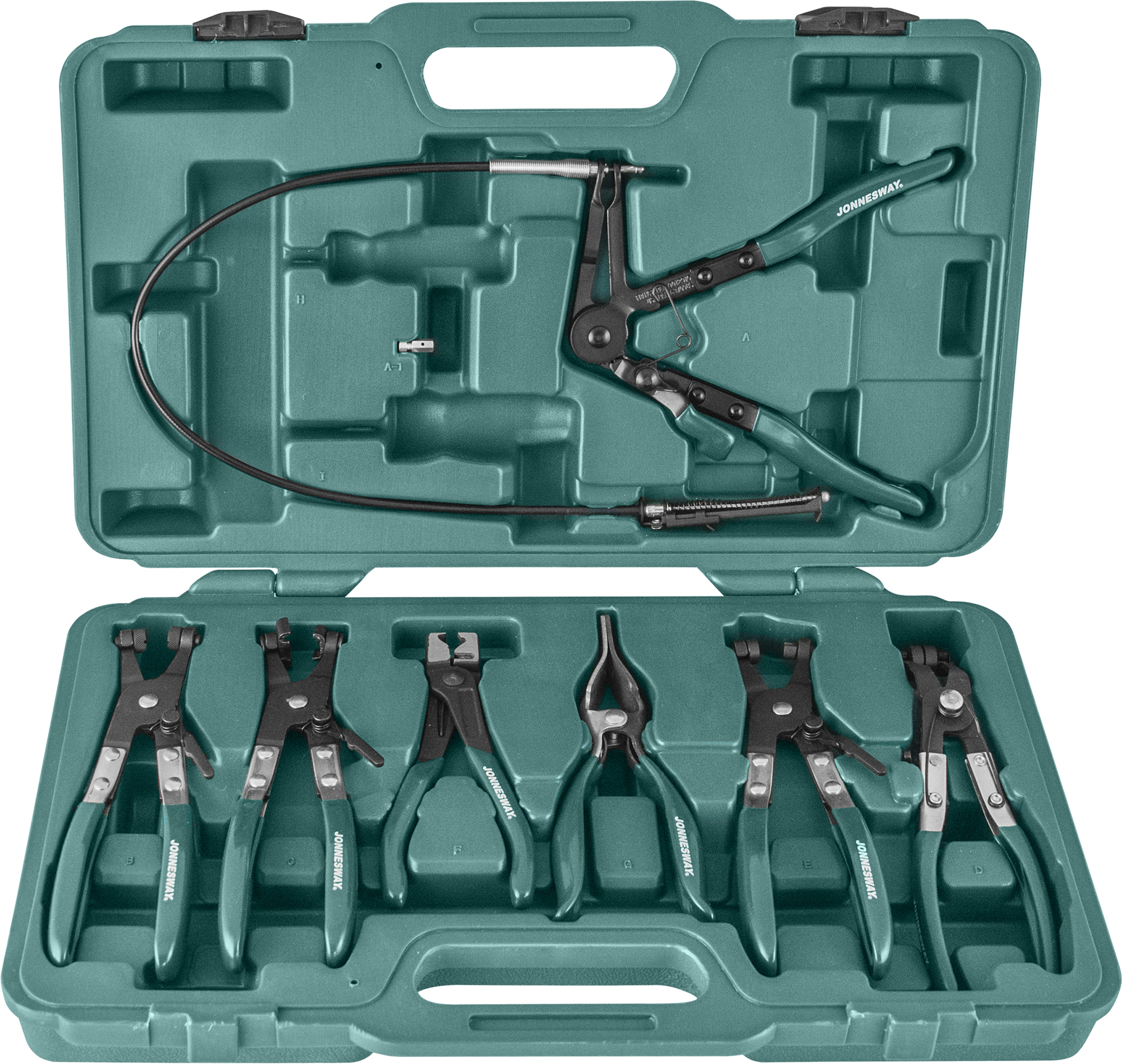 Содержание: Съемник хомутов с V-образными канавками захватов; Съемник хомутов с крестообразными канавками захватов; Съемник хомутов с коробчатыми захватами; Съемник хомутов с V-образными канавками захватов, изогнутые; Зажим с тросом для труднодоступных хомутов; Щипцы для замковых хомутов типа CLIC-R; Инструмент для демонтажа шлангов; Пластиковый кейс.