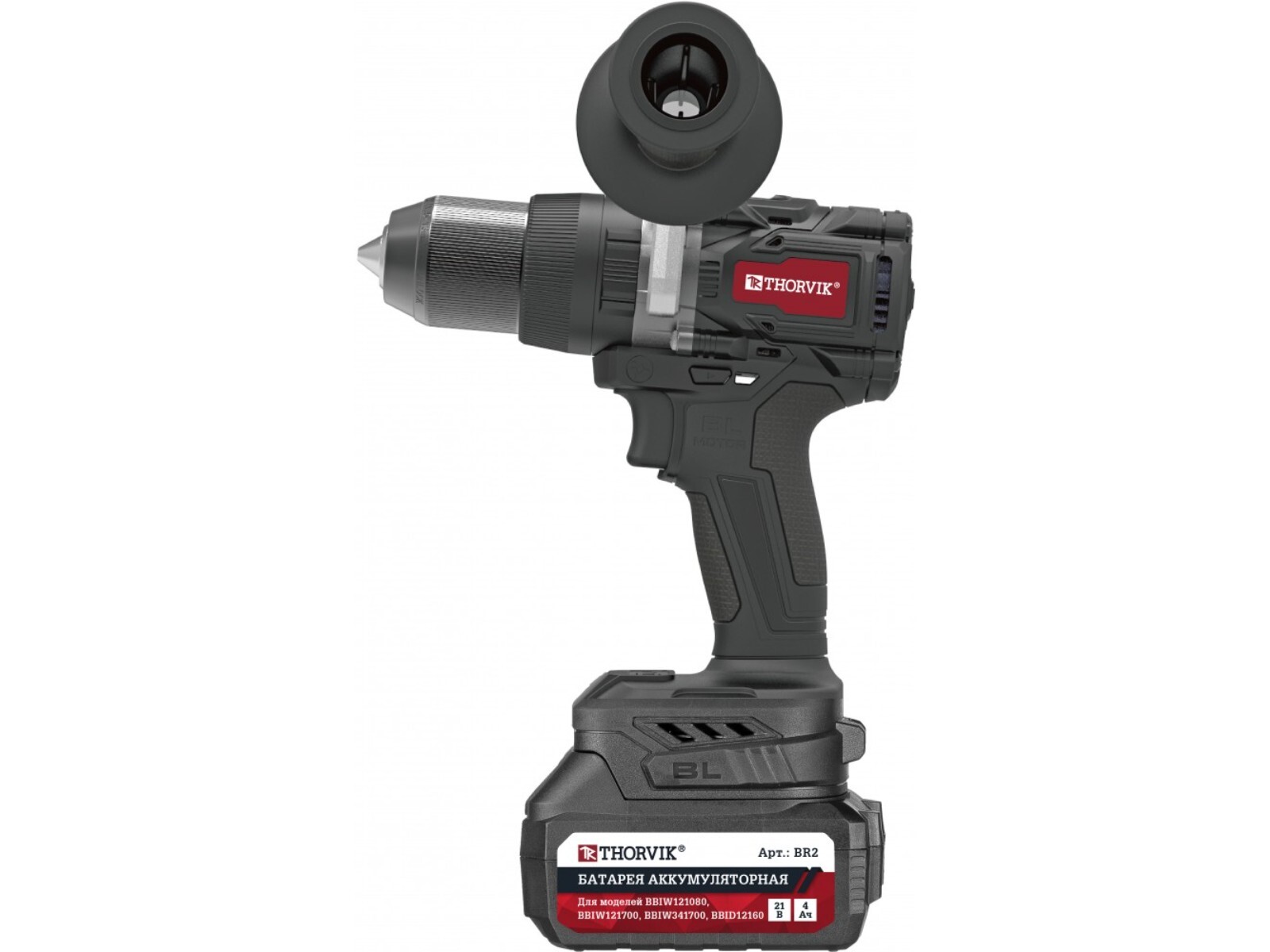 Ударная дрель-шуруповерт с самозажимным патроном до 13 мм, ударным механизмом и максимальным усилием затяжки резьбовых соедтинений до 160 Нм. Ударопрочная рукоятка с полимерными бензо-маслостойкими вставками и дополнительная удлиненная рукоятка с антивибрационным покрытием. Блок управления скоростями и автостопом со световой индикацией. Литий-ионная аккумуляторная батарея с индикацией заряда. Область применения Аккумуляторные дрели-шуруповерты Thorvik предназначены для выполнения работ по обработке отверстий в мастерских, цехах и производственных помещениях, персоналом, имеющему соответствующую квалификацию и навыки работы с электроинструментом, знакомым с правилами техники безопасности, условиями эксплуатации. Технические характеристики