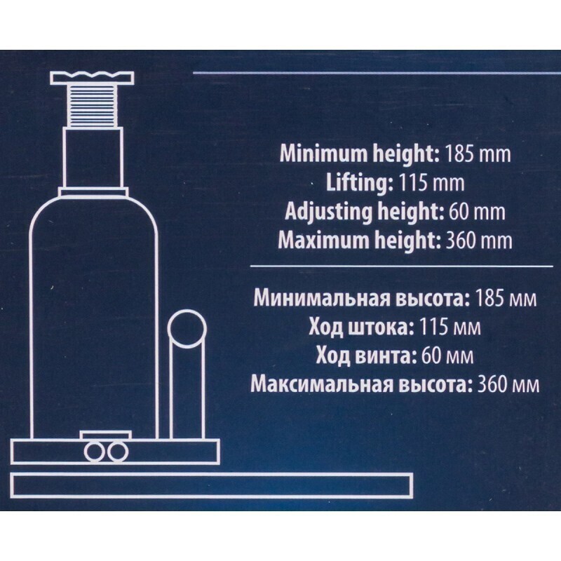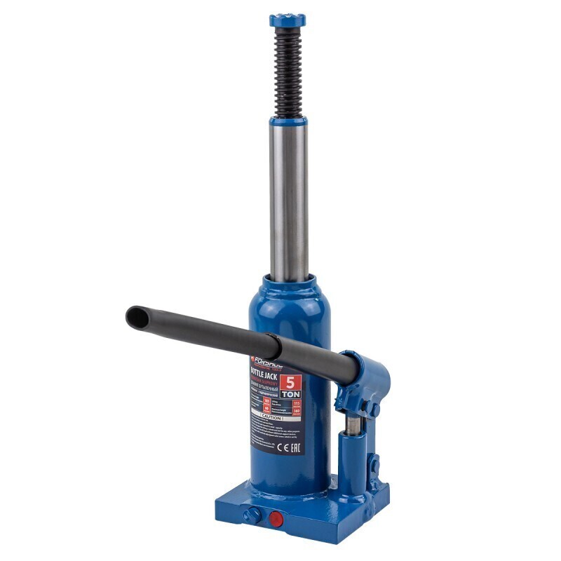 Домкрат бутылочный гидравлический с клапаном широко применяется на производствах, шиномонтажах, станциях технического обслуживания, а также в частных гаражах. Позволяет эффективно и безопасно поднять транспортное средство или иной груз с целью проведения ремонтных работ. Преимущества бутылочного домкрата: При относительно небольшом прикладываемом усилии имеет достаточно большую грузоподъемность и высокий КПД. Отличная точность фиксации груза, плавность хода штока. Домкрат оснащен специальным предохранительным клапаном для защиты от перегрузки. Компактные размеры, мобильность и легкость транспортировки (обязательно сохранять вертикальное положение устройства для предотвращения утечки масла). Грузоподъемность 5 тонны. Высота подхвата - 185 мм. Высота подъема - 360 мм. Ход штока: 115 мм. Ход винта: 60 мм.
