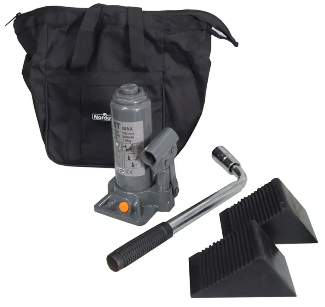 Домкрат бутылочный 4т с клапаном(подхват-195мм, подъем-380мм, ход штока-130мм, ход выкручиваемого винта-55мм),в комплекте с балонным ключом и упорами