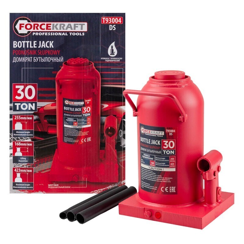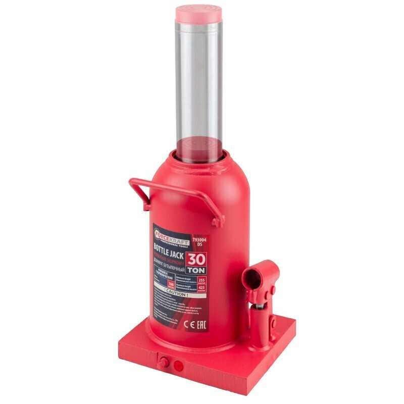 Домкрат бутылочный гидравлический с клапаном широко применяется на производствах, шиномонтажах, станциях технического обслуживания, а также в частных гаражах. Позволяет эффективно и безопасно поднять транспортное средство или иной груз с целью проведения ремонтных работ. Преимущества бутылочного домкрата: При относительно небольшом прикладываемом усилии имеет достаточно большую грузоподъемность и высокий КПД. Отличная точность фиксации груза, плавность хода штока. Компактные размеры, мобильность и легкость транспортировки (обязательно сохранять вертикальное положение устройства для предотвращения утечки масла). Высота подъема - 465 мм. Высота подхвата - 255 мм. Грузоподъемность 30 тонн. Домкрат оснащен специальным предохранительным клапаном для защиты от перегрузки.