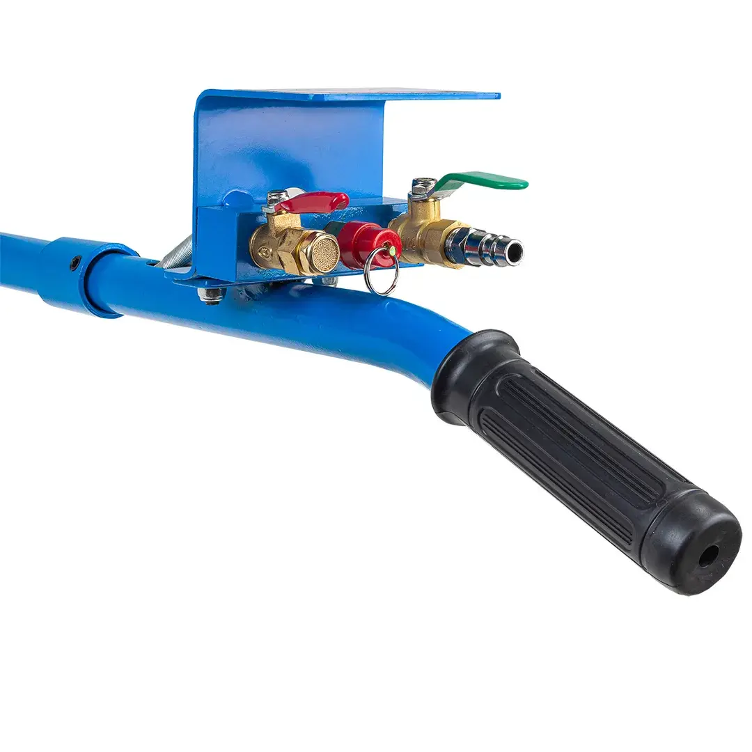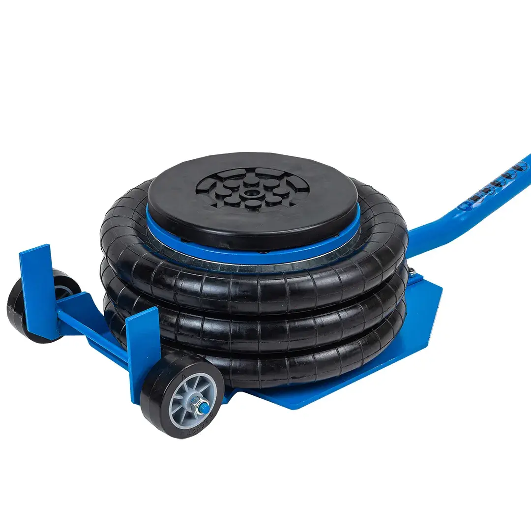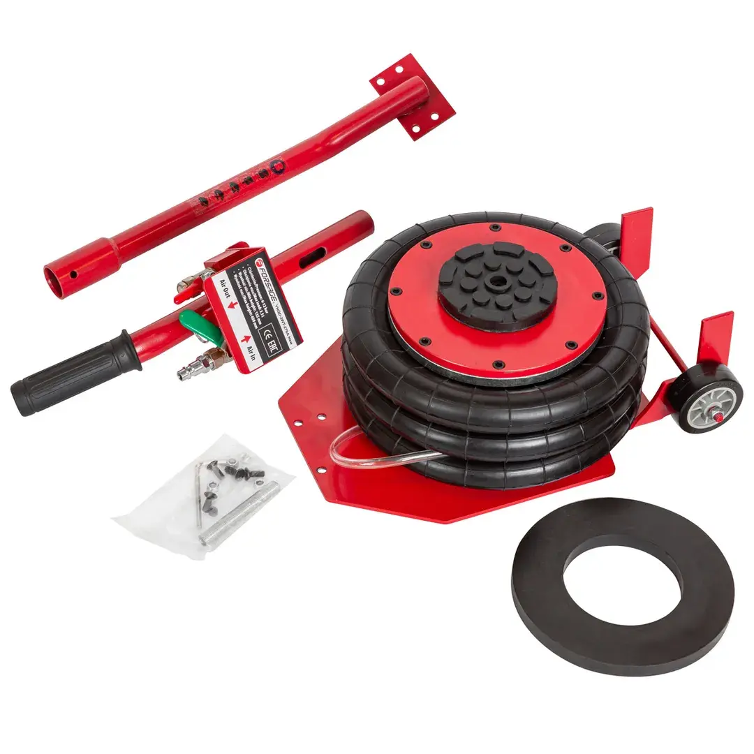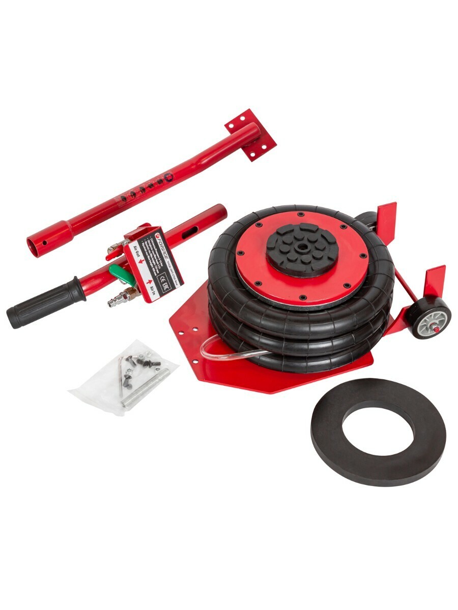 Профессиональный 3-камерный пневматический домкрат позволяет производить быстрый демонтаж и установку колес легковых автомобилей, а также необходимый местный ремонт подвески, узлов рулевого управления и тормозной системы. Домкрат подкатной пневматический имеет грузоподъемность 3.5 тонны и рассчитан на подключение к компрессору, подающему сжатый воздух под давлением от 6 до 12 бар. Устройство приводится в действие путем открытия крана подачи, расположенного на конце управляющей рукоятки. Конструкция данной модели включает три распорные резиновые подушки диаметром 270 мм, обеспечивающие максимальную высоту подъема объекта до 420 мм. Значение минимальной высоты подхвата (дорожный просвет автомобиля) составляет 135 мм. Если домкрат применяется в процессе ремонтных работ, поднятую сторону автомобиля следует зафиксировать при помощи дополнительных опор. Устройство рекомендовано для использования в гаражах, на СТО и в шиномонтажных мастерских. Рабочая температура: -60 ℃ ~ 50 ℃.