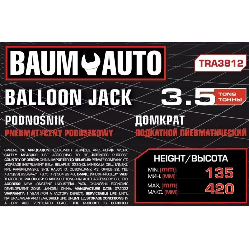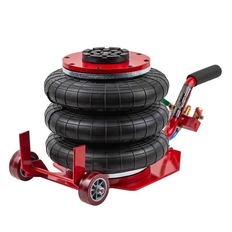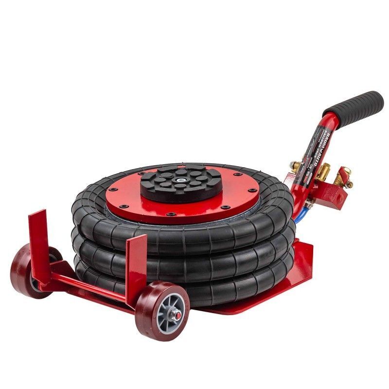 Домкрат автомобильный пневматический с грузоподъемностью до 3,5 тонн. Максимальная высота подъема 420 мм, уровень подхвата 135 мм. Позволяет производить быстрый демонтаж и установку колес легкового транспорта, а также необходимый местный ремонт подвески, узлов рулевого управления и тормозной системы. Домкрат подкатной имеет грузоподъемность 3,5 тонн и рассчитан на подключение к компрессору, подающему сжатый воздух под давлением от 6 до 12 бар. Устройство приводится в действие путем открытия крана подачи, расположенного на конце управляющей рукоятки. Конструкция данной модели включает три распорные резиновые подушки диаметром 270 мм.