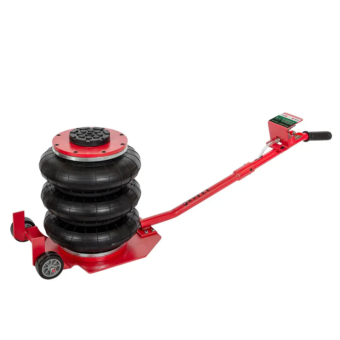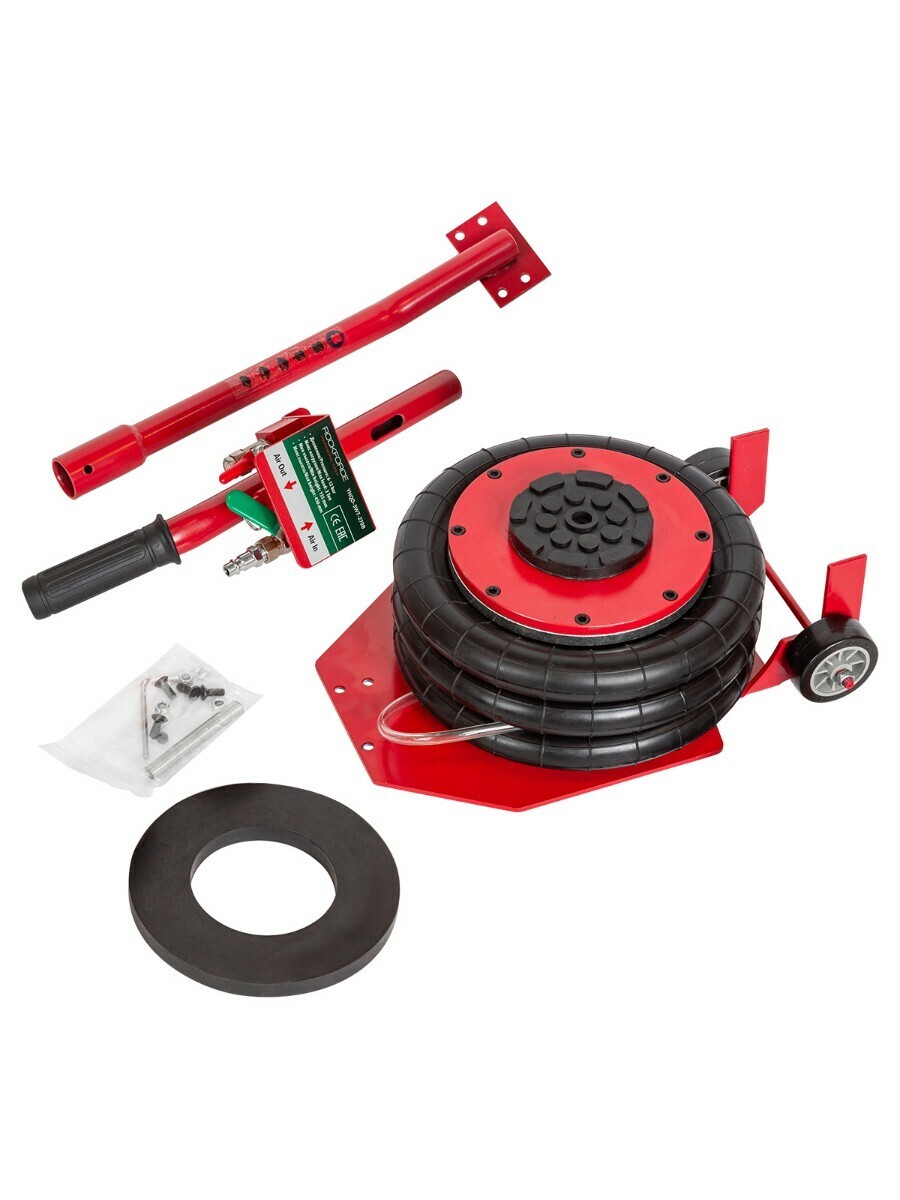 Профессиональный 3-камерный пневматический домкрат позволяет производить быстрый демонтаж и установку колес легковых автомобилей, а также необходимый местный ремонт подвески, узлов рулевого управления и тормозной системы. Домкрат подкатной пневматический имеет грузоподъемность 3 тонны и рассчитан на подключение к компрессору, подающему сжатый воздух под давлением от 6 до 12 бар. Устройство приводится в действие путем открытия крана подачи, расположенного на конце управляющей рукоятки. Конструкция данной модели включает три распорные резиновые подушки диаметром 270 мм, обеспечивающие максимальную высоту подъема объекта до 450 мм. Значение минимальной высоты подхвата (дорожный просвет автомобиля) составляет 135 мм. Если домкрат применяется в процессе ремонтных работ, поднятую сторону автомобиля следует зафиксировать при помощи дополнительных опор. Устройство рекомендовано для использования в гаражах, на СТО и в шиномонтажных мастерских. Рабочая температура: -60 ℃ ~ 50 ℃.