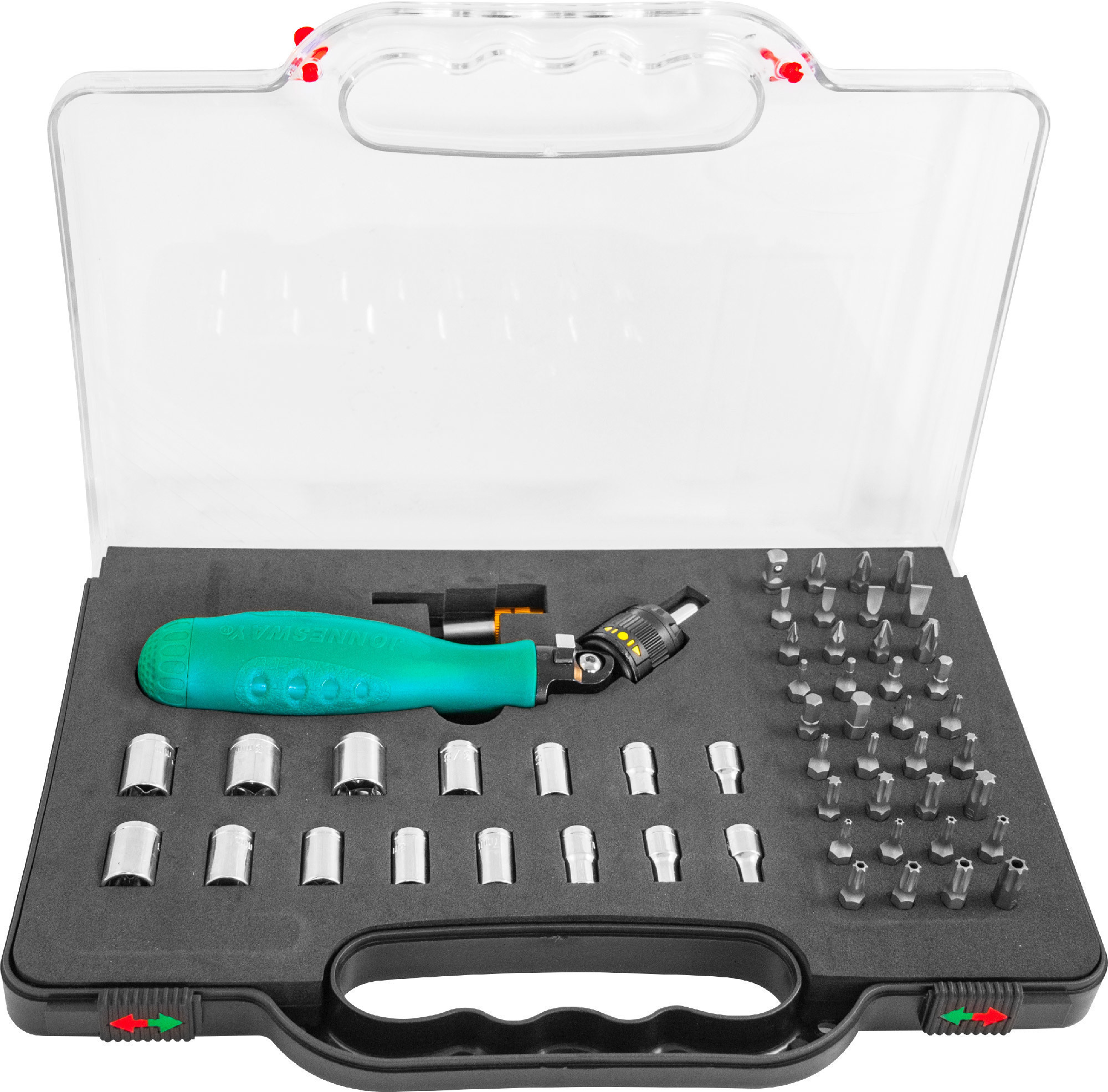 Содержание: - Гибкая отверточная рукоятка с храповым механизмом и реверсом; - Вставки-биты 25 мм.: - PZ: #0, #1, #2, #3; - PH: #1, #2, #3; - SL: 3, 4, 5.5, 7 мм.; - TORX:T6,T8,T9,T10,T15,T20,T25,T30,T40; - T/TORX: T8,T10,T15,T20,T25,T27,T30,T40; - HEX: 2, 2.5, 3, 4, 5, 6 мм.; -Головки торцевые 1/4''DR, 15 шт.: 5,5.5,6,7,8,9,10,11,12,13 мм., 3/16'',1/4'',5/16'',3/8'',1/2''; - Держатель для бит магнитный; - Пластиковый бокс.