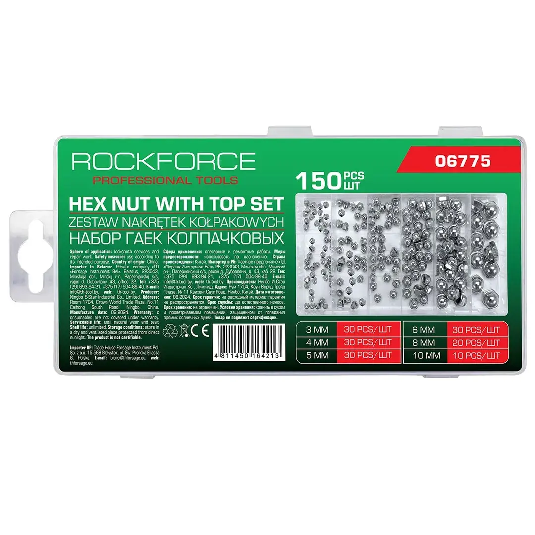 Гайки нержавеющие колпачковые 3-10мм, набор 150пр. RockFORCE RF-06775