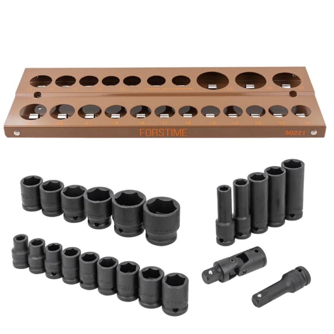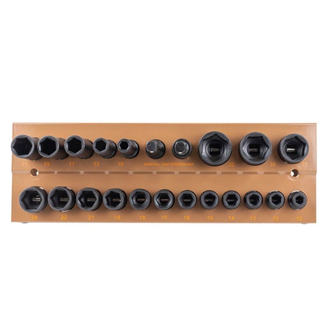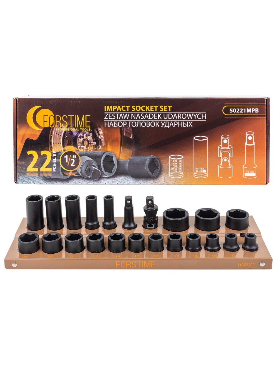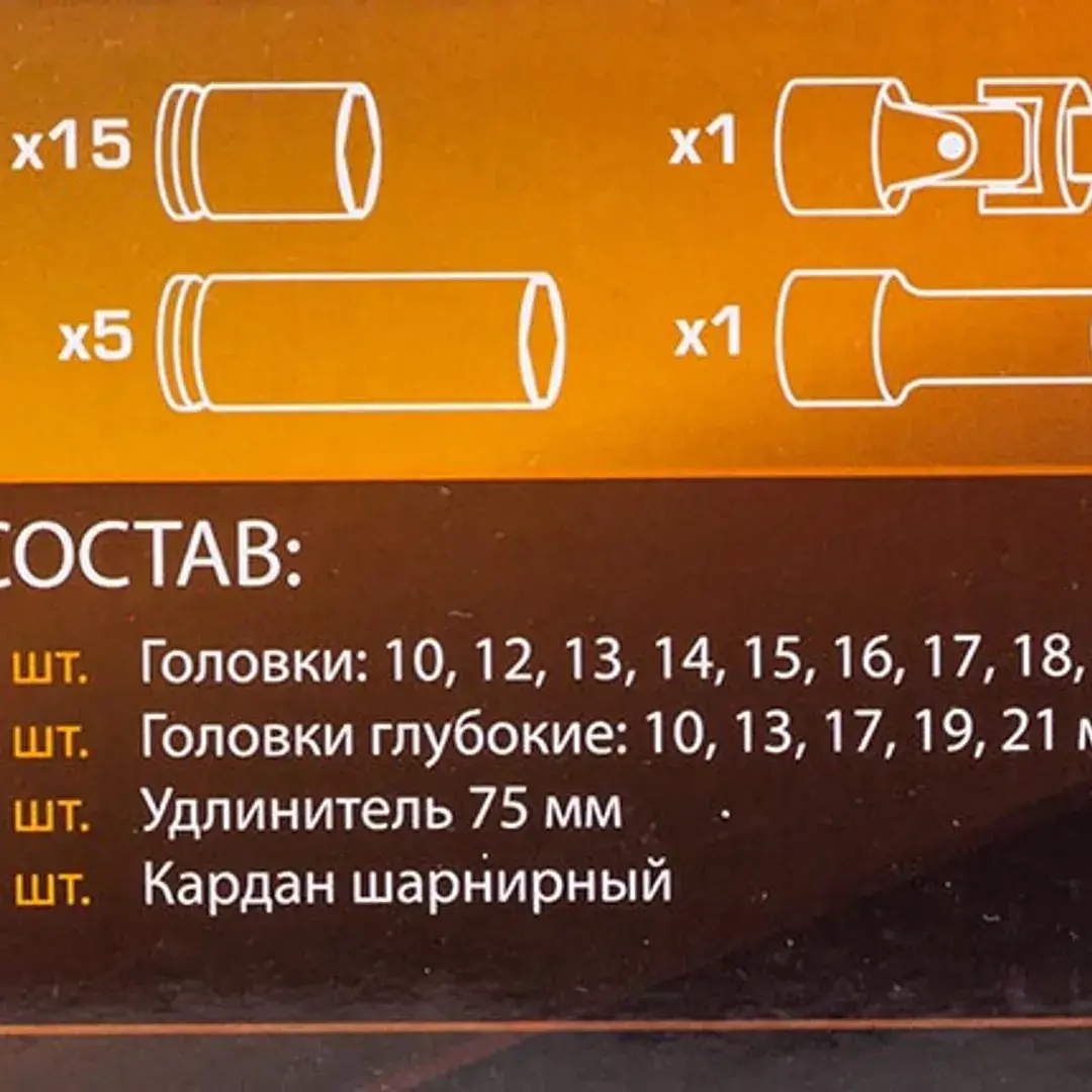 Набор шестигранных головок с посадочным квадратом 1/2", 22 предмета, изготовлен из высококачественной хроммолибденовой стали, что обеспечивает долговечность и надежность инструмента. Комплект включает головки шестигранные короткие (10, 12, 13, 14, 15, 16, 17, 18, 19, 21, 22, 24, 27, 30, 32 мм.), головки шестигранные глубокие (10, 13, 17, 19, 21 мм.), удлинитель 75 мм и кардан шарнирный. Такое разнообразие размеров позволяет выполнять различные задачи по работе с гайками и болтами. Идеально подходит для использования механиками, автомеханиками и электриками при работе с автомобилями, мотоциклами и другими механизмами.