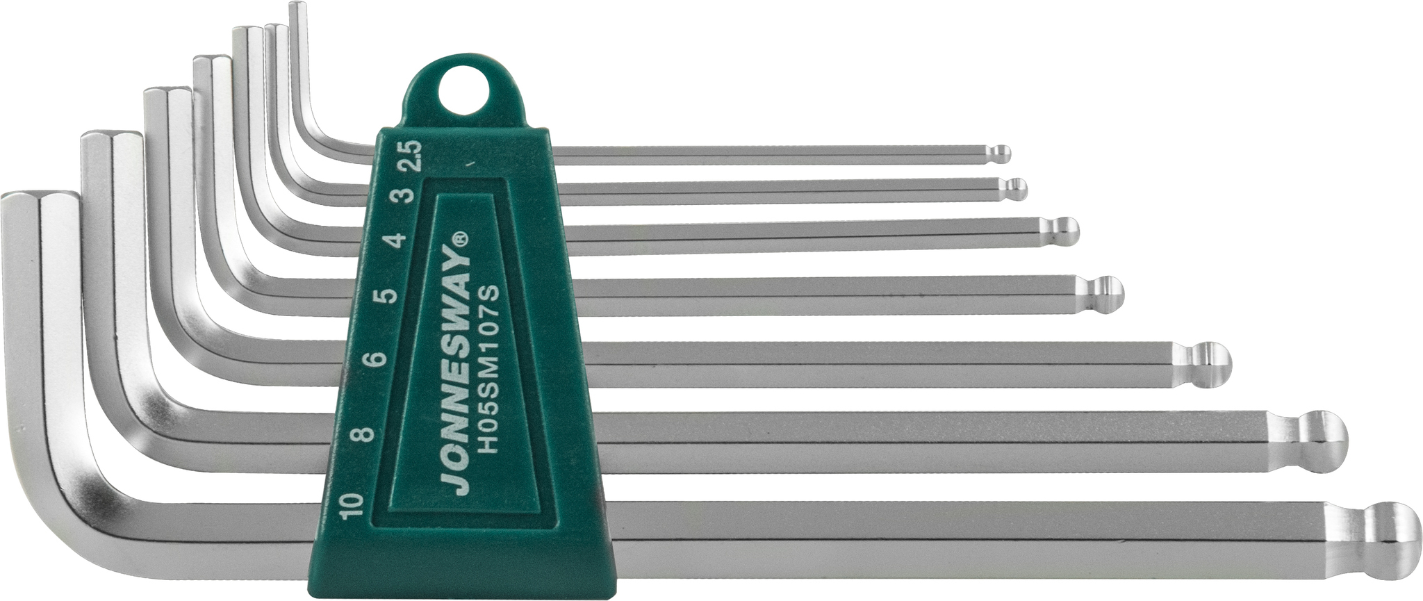 Комплект угловых шестиграников LONG с шаром 2,5-10мм, 7 предметов. Согнутый под углом 90град. стержень с рабочими профилями одного размера на обоих концах, сочетает в себе относительное удобство использования с возможностью приложения значительных рабочих нагрузок, когда в качестве ручки используется длинная часть и работу в труднодоступных местах, когда в качестве воротка используется короткая. Комплект угловых шестигранников удлиненных "H05SM107S" изготовлен из стали S2 в соответствии с требованиями ГОСТ 11737-93, имеет матовое хромоникелевое покрытие. Наличие шарового наконечника на длинной части инструмента позволяет дополнительно использовать инструмент под углом до 20град. к оси вращения крепежной детали.