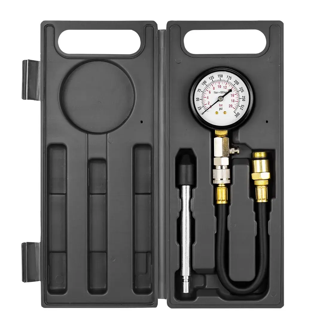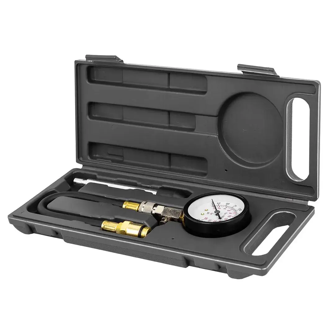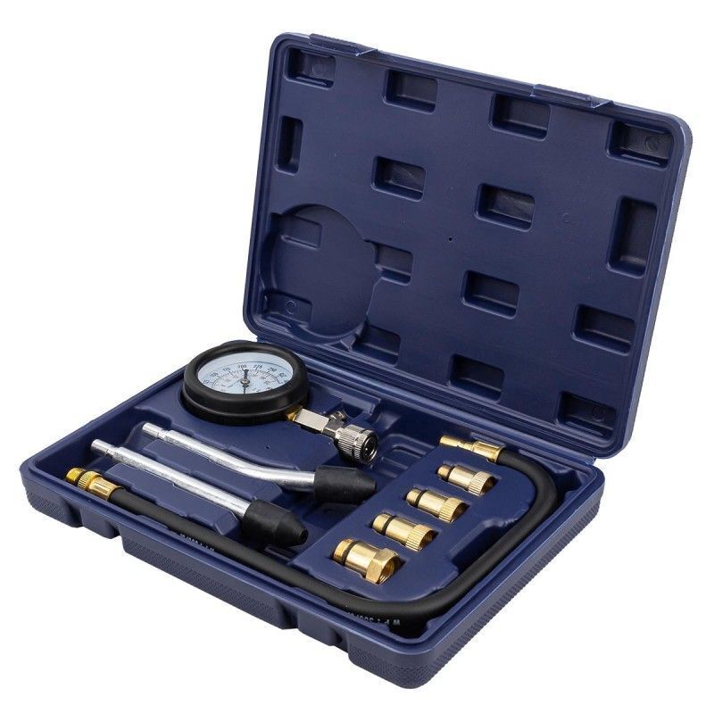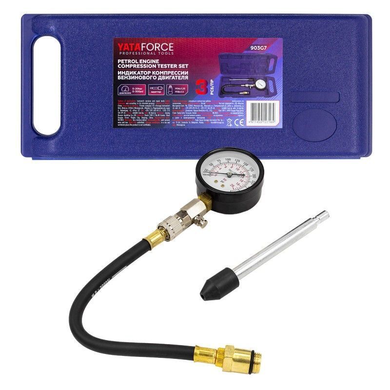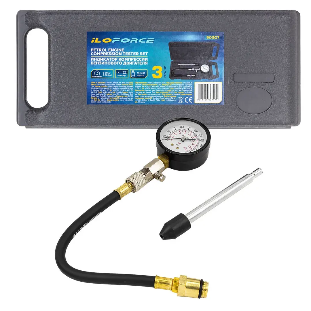 Набор с индикатором компрессии бензинового двигателя из 3 предметов, в кейсе - это прибор, который позволяет измерить давление в цилиндрах двигателя автомобиля. Он состоит из манометра, жесткого прижимного адаптера-переходника 150мм и набора адаптеров для различных типов двигателей. Манометр имеет диапазон измерений от 0 до 20 бар и точность измерения ±0,25 бар. Жесткий прижимной адаптер обеспечивает надежное крепление индикатора на двигателе и предотвращает его смещение во время измерения. Набор адаптеров позволяет использовать индикатор для различных типов бензиновых двигателей, включая двигатели с резьбой M14х1.25 и M18х1.5. Каждый адаптер имеет свою резьбу и подходит только для определенного типа двигателя. Компрессометр бензинового двигателя поставляется в кейсе для удобства хранения и транспортировки.