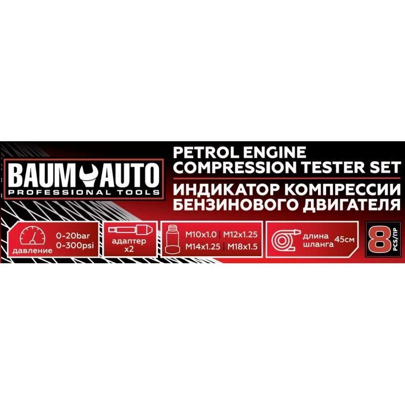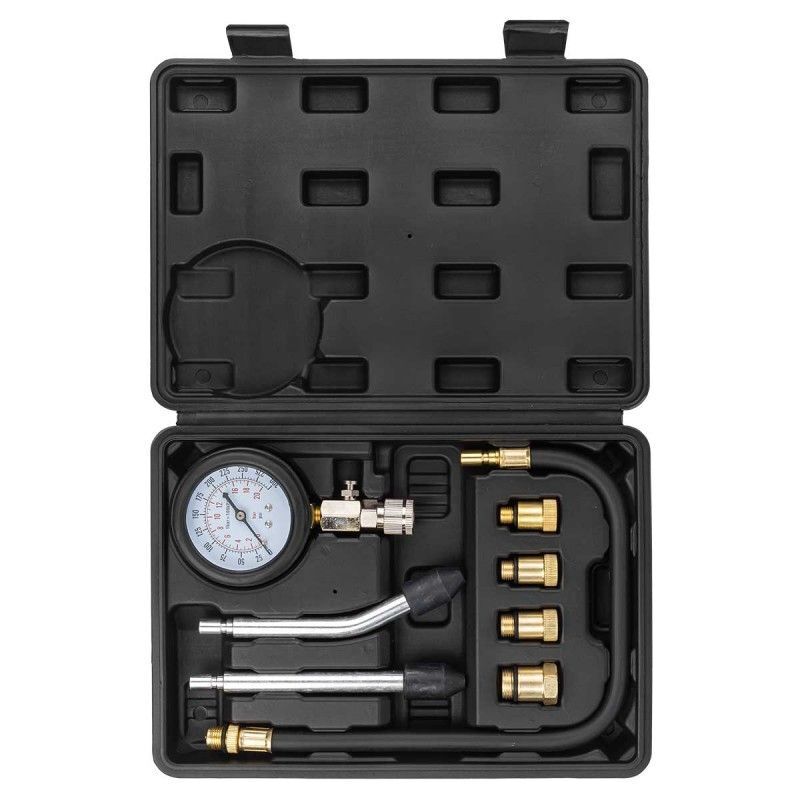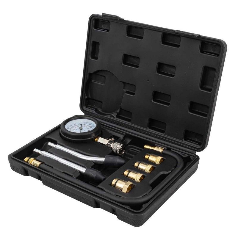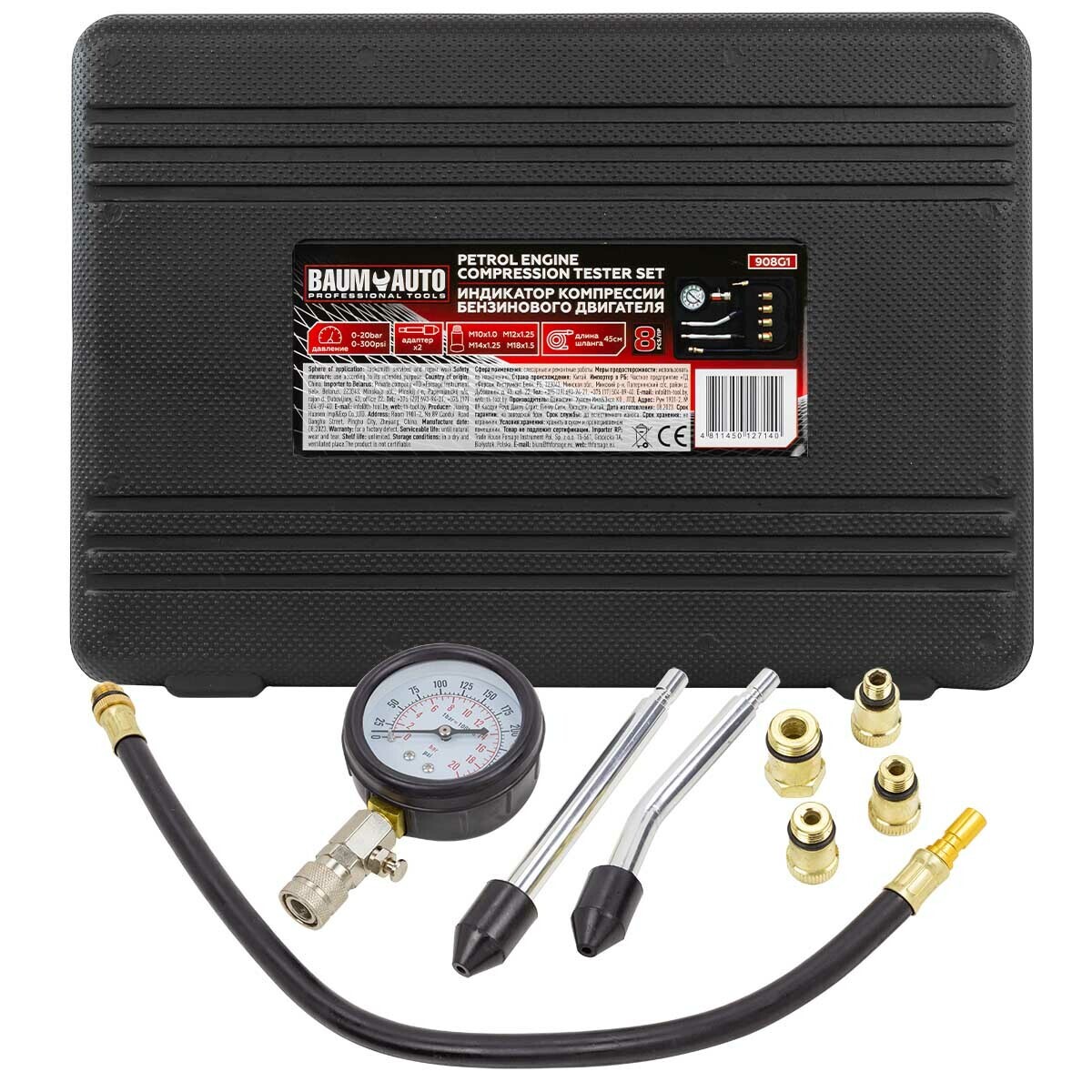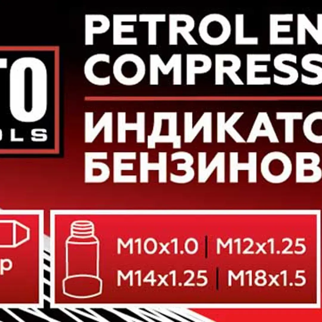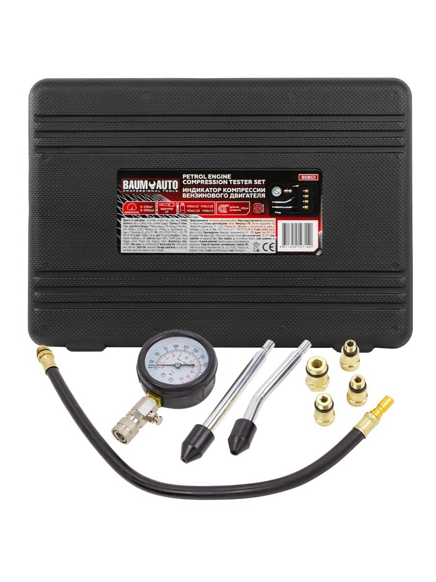 Набор с индикатором компрессии бензинового двигателя из 8 предметов в кейсе. Является профессиональным инструментом для определения давления в цилиндрах бензинового двигателя. Он состоит из манометров с диапазоном измерения 0-21 bar и точностью ±0.25 bar, жёстких прижимных адаптеров и адаптеров с различными резьбовыми соединениями (М10, М12, М14, М18). Благодаря такому набору, можно быстро и удобно измерить давление в любом бензиновом двигателе. Все инструменты находятся в прочном кейсе, что обеспечивает удобство хранения и транспортировки набора.