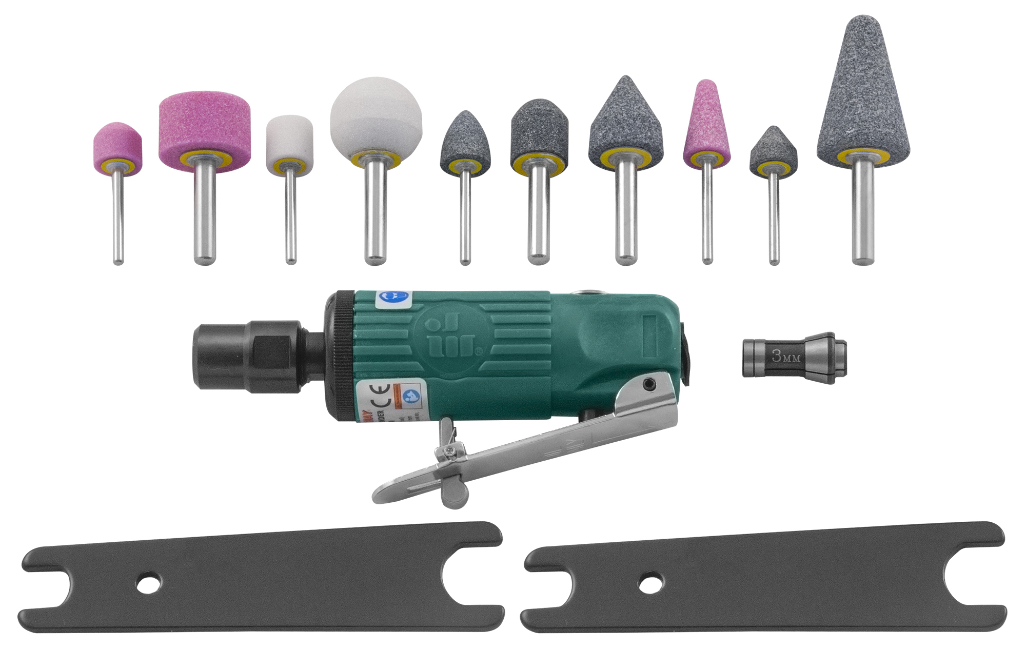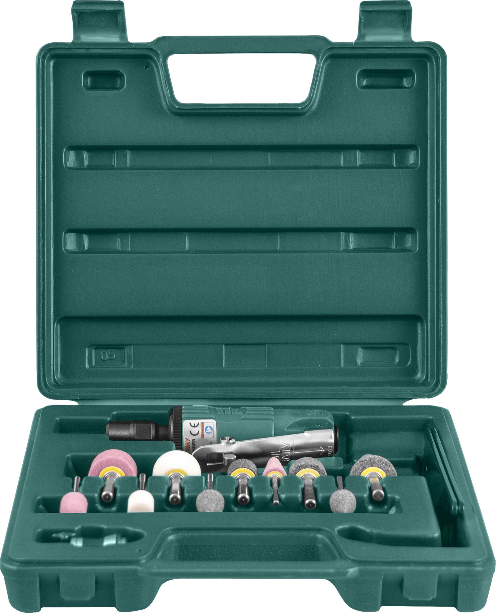 Бормашинка пневматическая JONNESWAY® JAG-0903FM Шлифовальные камни с хвостовиком 6 мм, 5 шт. Шлифовальные камни с хвостовиком 3 мм, 5 шт. Цанга сменная, под хвостовик Ø 3 мм. Ключи сервисные 2 шт. Кейс пластиковый