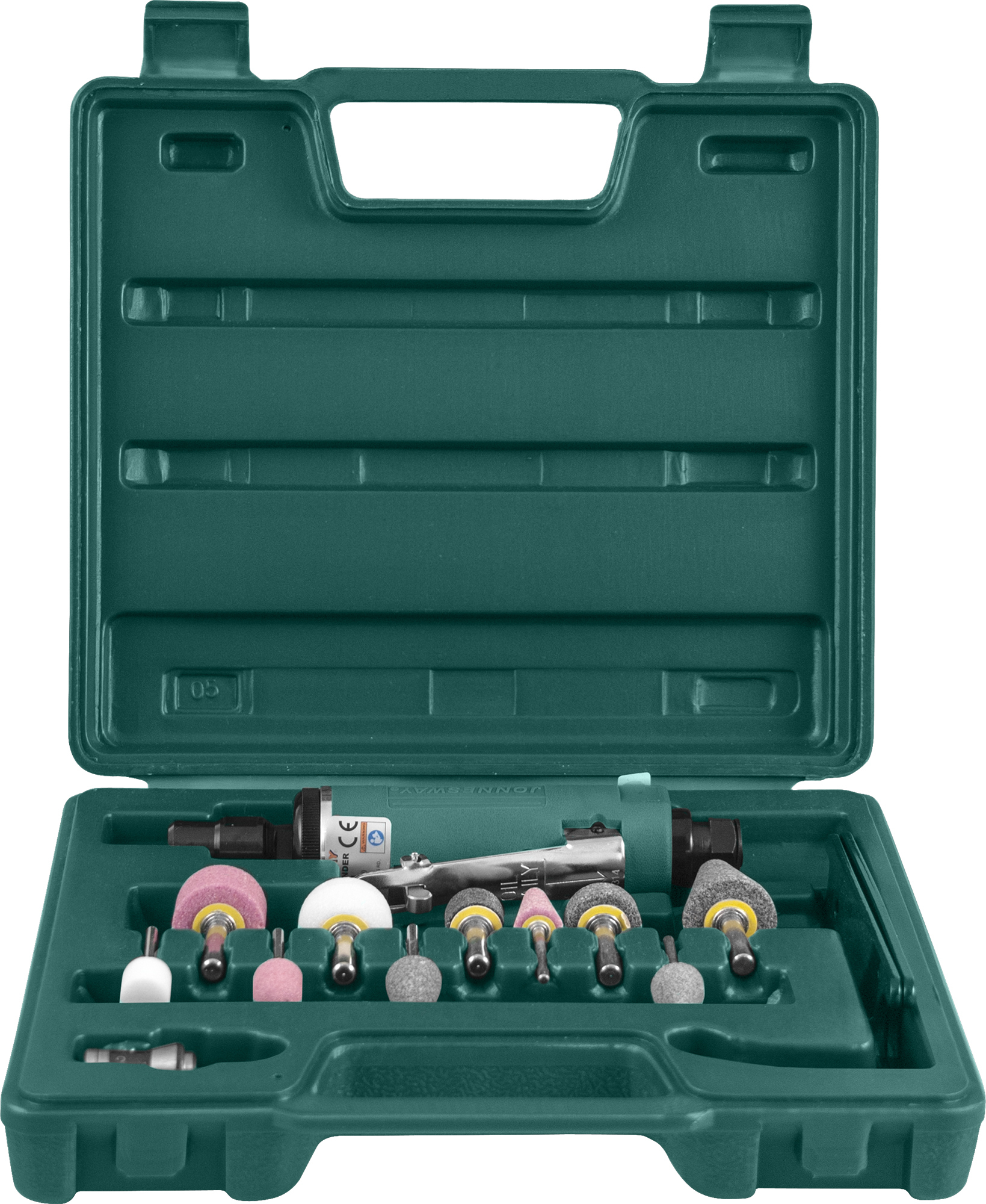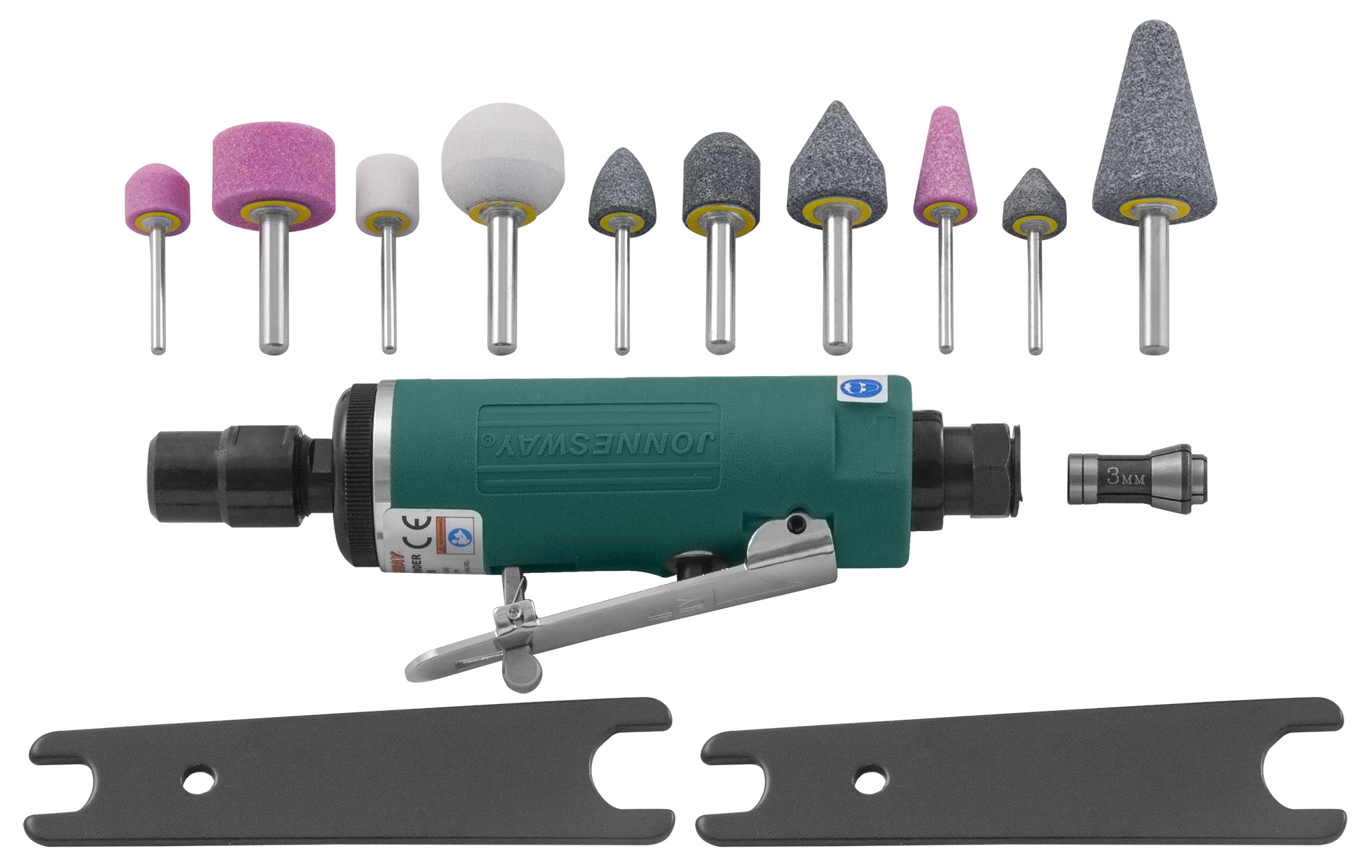 Бормашинка пневматическая JONNESWAY® JAG-0903RM Шлифовальные камни с хвостовиком 6 мм, 5 шт. Шлифовальные камни с хвостовиком 3 мм, 5 шт. Цанга сменная, под хвостовик Ø 3 мм. Ключи сервисные 2 шт. Кейс пластиковый.
