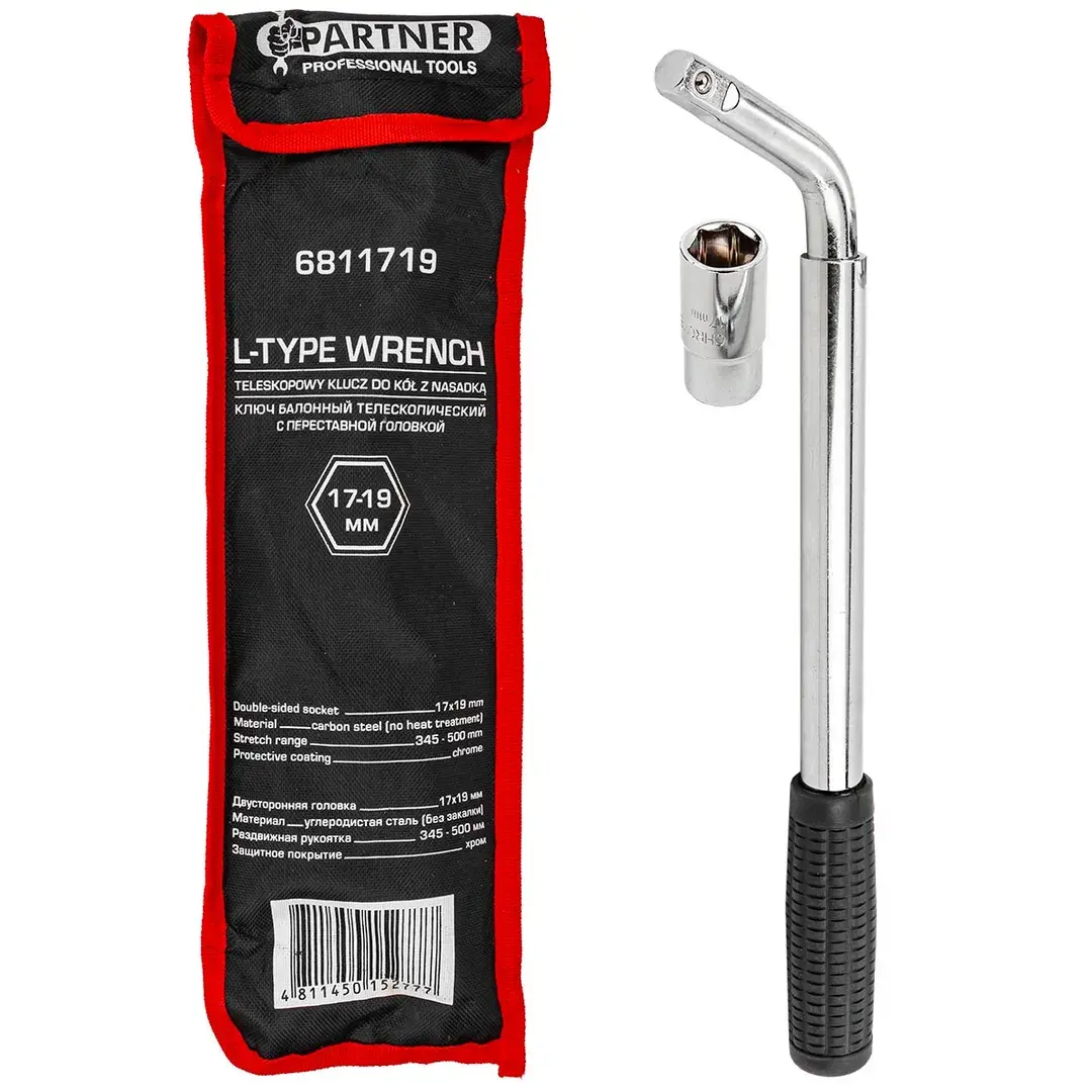 Ключ балонный Г-образный телескопический является необходимым и даже незаменимым инструментом для ремонта колеса. Баллонным ключом называется гаечный ключ торцового типа, которым откручивают или закручивают гайки при работе с автомобильными колесами. С помощью него водитель сможет самостоятельно поменять колесо, затянуть и установить крепёж (болты, гайки). Данный инструмент изогнут на 120 градусов. Телескопическая конструкция позволяет осуществлять работу с крепежом в труднодоступных местах, а также позволяет прикладывать большее усилие при закручивании/откручивании за счет увеличенной длины рычага. С одной стороны Г-образного ключа расположен посадочный квадрат 1/2", с другой - прорезиненная рукоятка, которая обеспечивает комфорт при использовании. Ключ можно также применять и при сборке различных конструкций с применение болтовых (резьбовых) соединений, при ремонте других деталей авто. Гаечный ключ пригоден для использования как в собственном гараже и в быту, так и на специализированной СТО. В комплекте с к