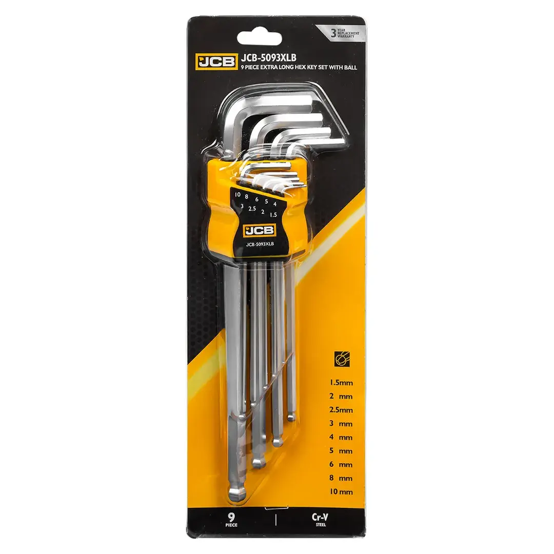 Ключи Г-образные 6-гранные экстра длинные с шаром, набор 9пр. (1.5-6, 8, 10мм) JCB JCB-5093XLB