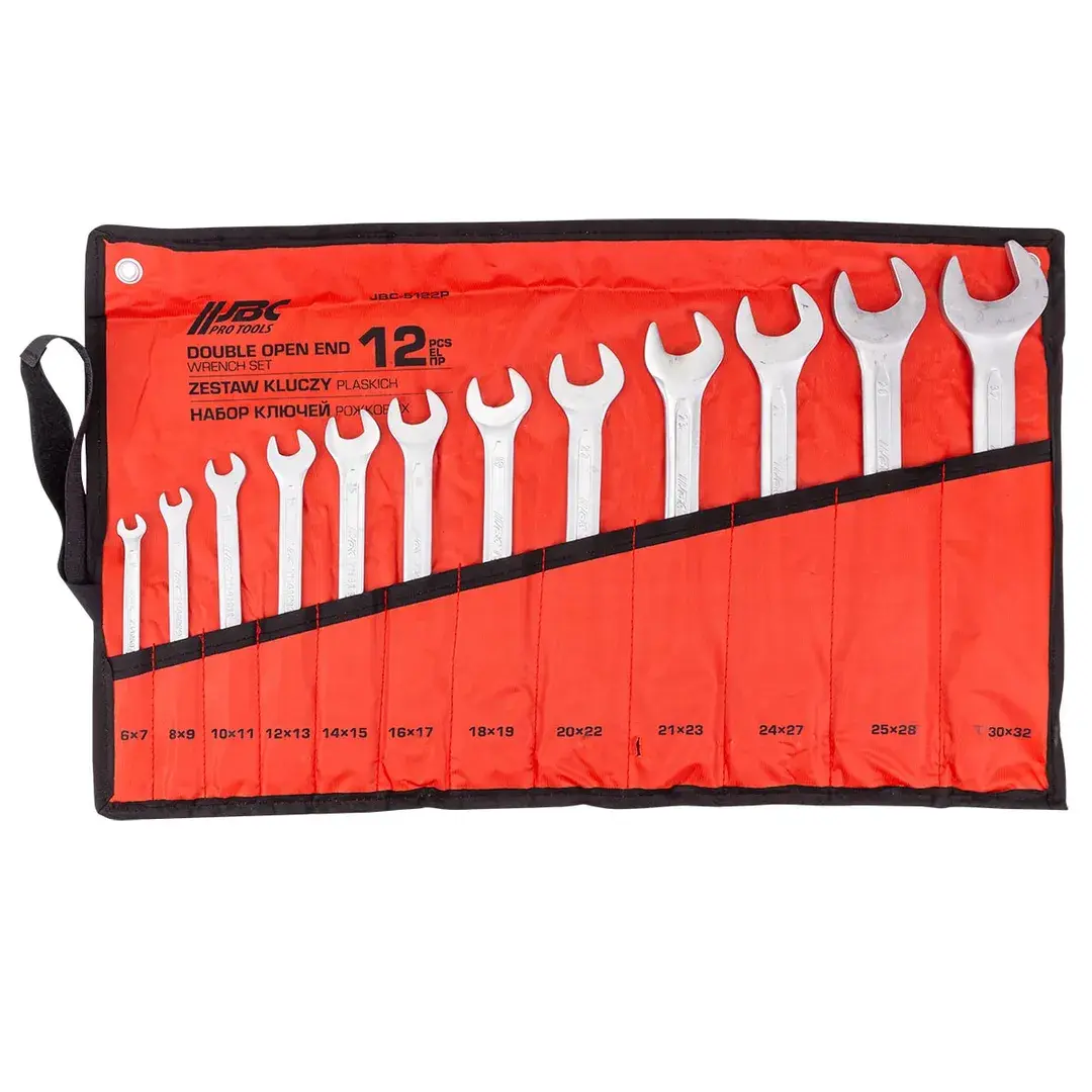 Набор ключей рожковых, 12 предметов, на полотне. Гаечные ключи с открытым зевом. Для того чтобы произвести монтаж или демонтаж 6-гранных гаек, болтов и прочих крепежных изделий, вам понадобится гаечный ключ рожкового типа. Этот инструмент может обладать одной или двумя рабочими головками с открытым зевом. Такой ключ позволяет работать, когда над гайкой мало места, а вокруг гайки свободно. Он незаменим, когда торец гайки или болта недоступен и к граням можно подобраться только с боку, надвигая ключ. Захват осуществляется рожками - отсюда и название "рожковый ключ". Несмотря на простоту конструкции, гаечный ключ применяется практически во всех областях техники для сборки механизмов различных уровней сложности. Этот инструмент традиционно широко представлен на рынке, востребован потребителями и присутствует в арсенале промышленных предприятий, организаций ЖКХ, в автосервисе, на СТО.¶Размеры ключей : 6х7, 8х9, 10х11, 12х13, 14х15, 16х17, 17х19, 18х19, 21х23, 22х24, 24х27, 30х32мм