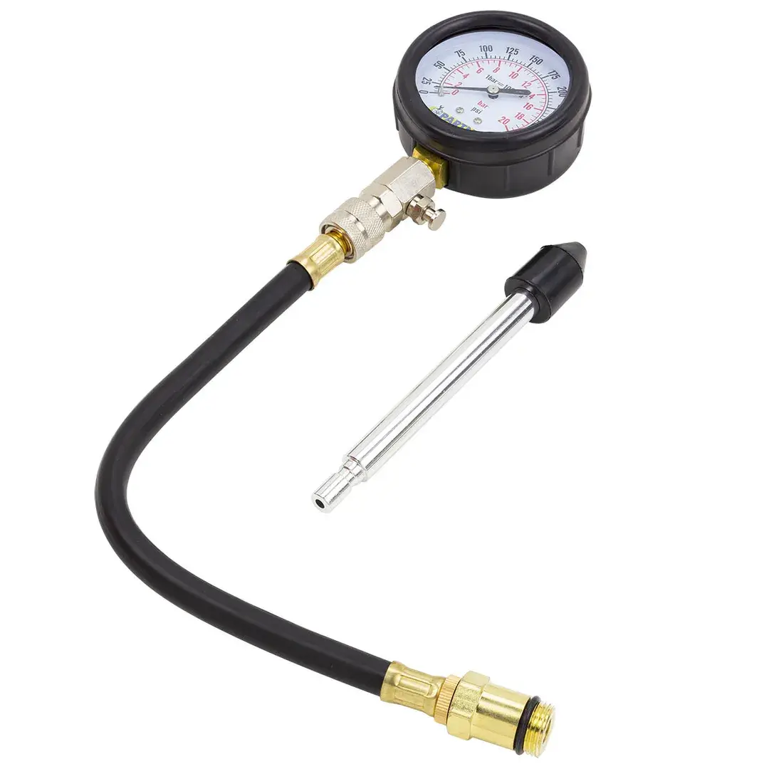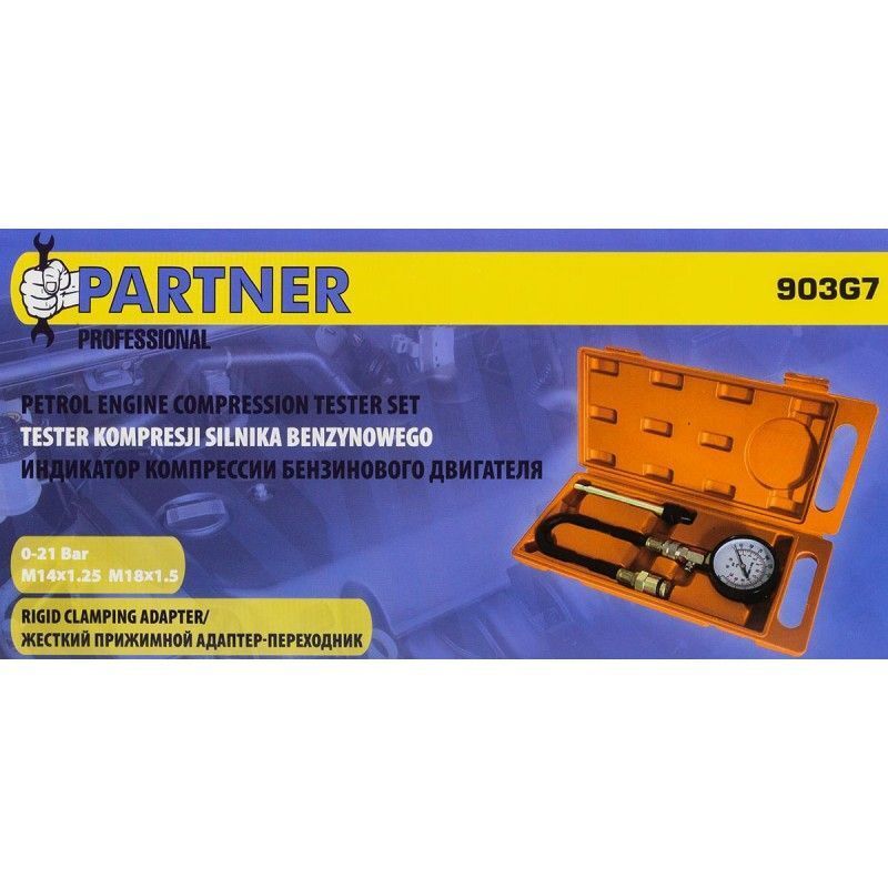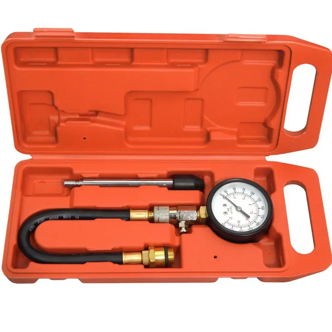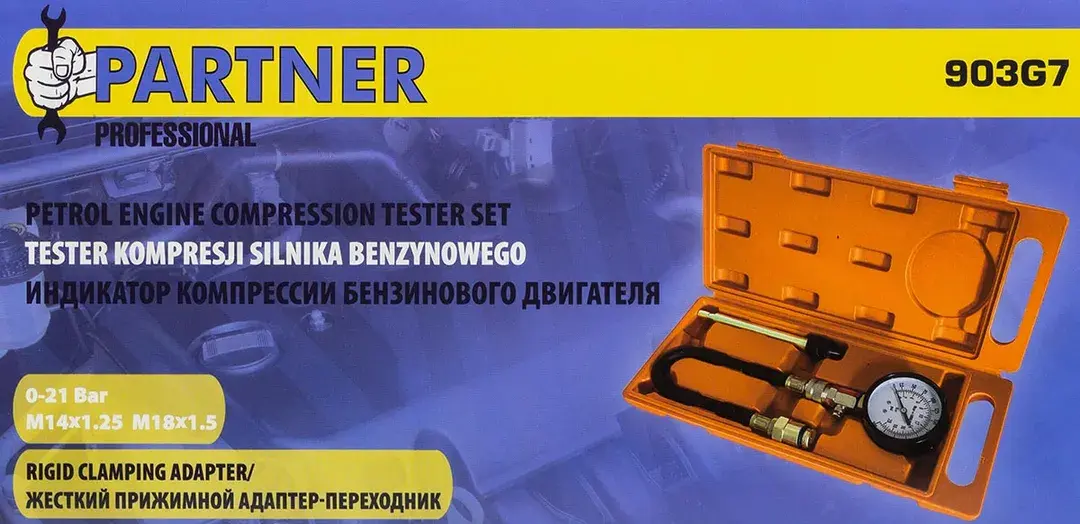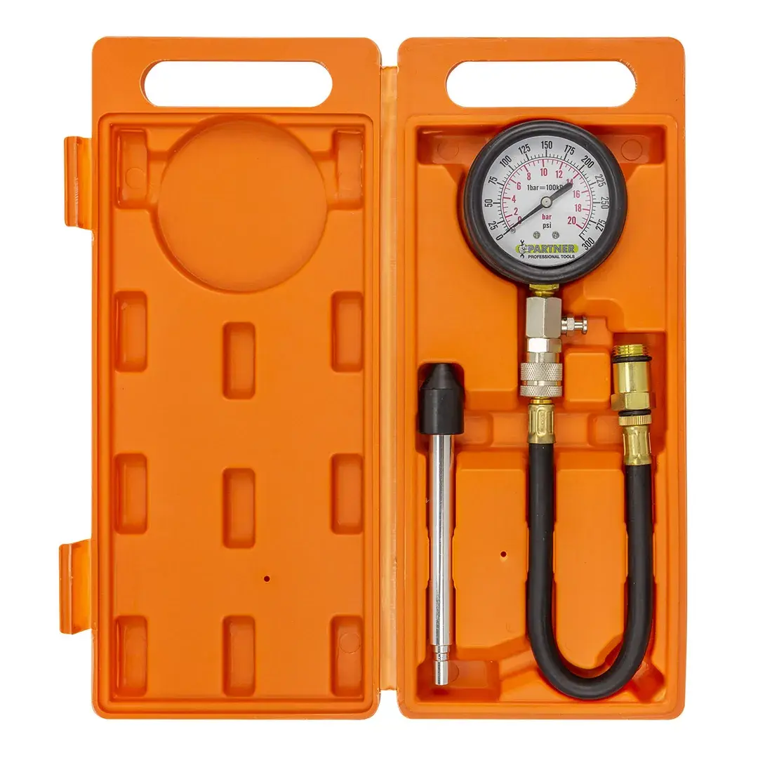 Набор с индикатором компрессии бензинового двигателя из 3 предметов, в кейсе - это прибор, который позволяет измерить давление в цилиндрах двигателя автомобиля. Он состоит из манометра, жесткого прижимного адаптера-переходника 150мм и набора адаптеров для различных типов двигателей. Манометр имеет диапазон измерений от 0 до 20 бар и точность измерения ±0,25 бар. Жесткий прижимной адаптер обеспечивает надежное крепление индикатора на двигателе и предотвращает его смещение во время измерения. Набор адаптеров позволяет использовать индикатор для различных типов бензиновых двигателей, включая двигатели с резьбой M14х1.25 и M18х1.5. Каждый адаптер имеет свою резьбу и подходит только для определенного типа двигателя. Компрессометр бензинового двигателя поставляется в кейсе для удобства хранения и транспортировки.