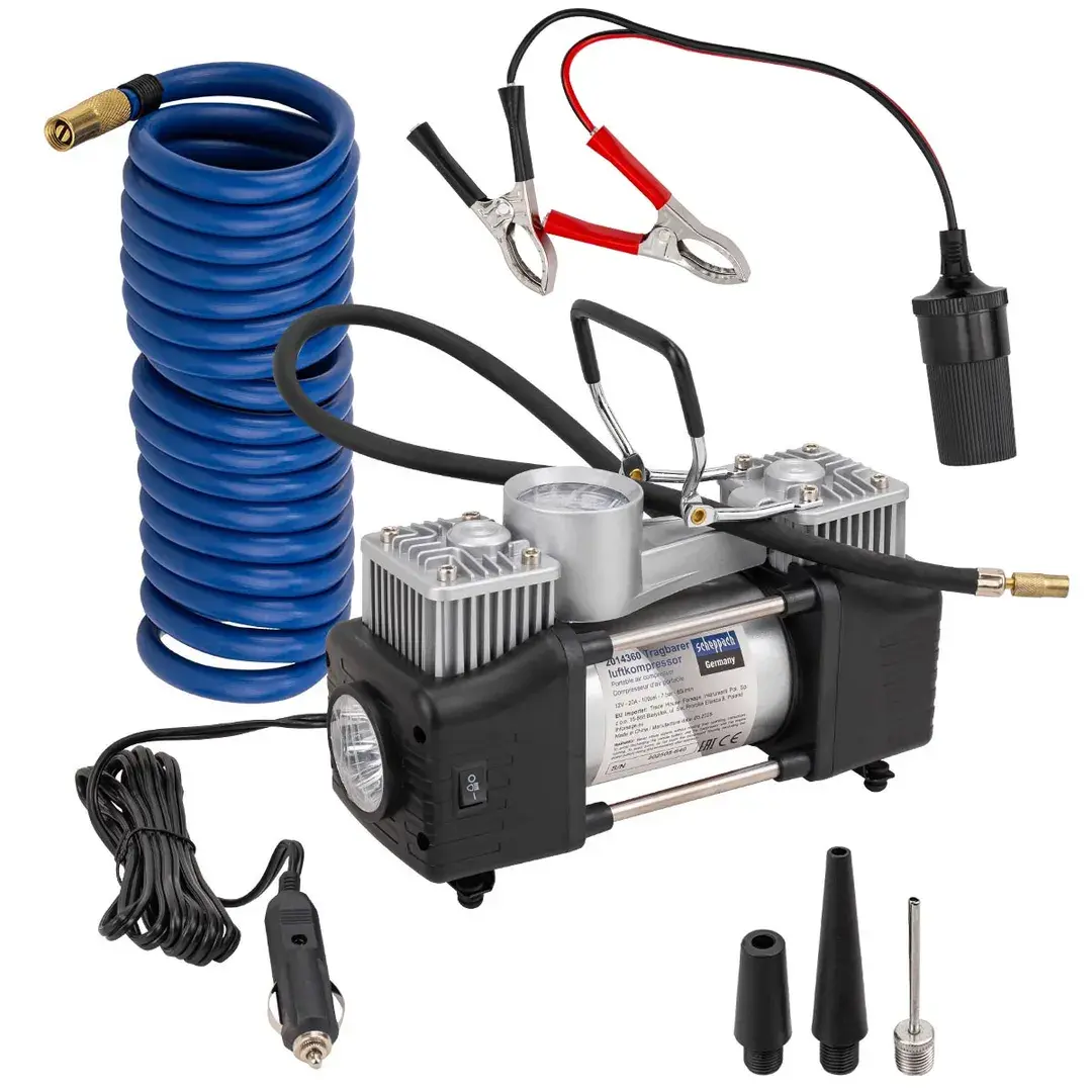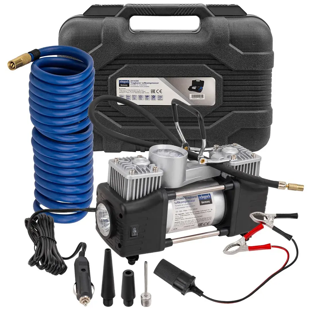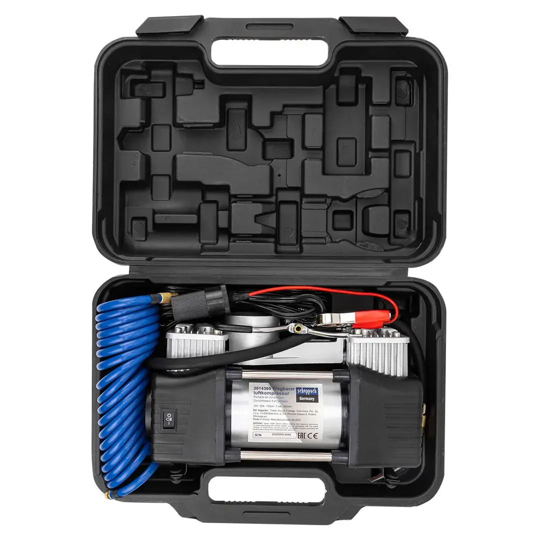 Компрессор поршневой автомобильный двухцилиндровый в пластиковом кейсе с аналоговым манометром - это лучшее решение для быстрой и удобной подкачки шин в дорожных условиях. Насос рассчитан на длительную эксплуатацию в различных климатических условиях. Компрессор оснащен встроенным фонариком, что позволяет использовать его в условиях пониженной освещенности. Прочный пластиковый кейс дает возможность удобно переносить и хранить компрессор, а также надежно защищает его от различных механических повреждений. В комплекте представлены не только сам поршневой двухцилиндровый компрессор, но и воздушный шланг, а также различные сменные насадки, что позволяет использовать насос также и для накачки резиновых лодок, мячей и надувных матрасов. Напряжение 12В, Ток 20А, Производительность 65л/мин, Рабочее давление 7бар, Диаметр цилиндров 30мм, Длина сетевого кабеля 3м, Время непрерывной работы 20мин, Диапазон рабочих температур -30 - +50 °С, Длина резинового шланга 0.6м, Длина витого шланга 3м.