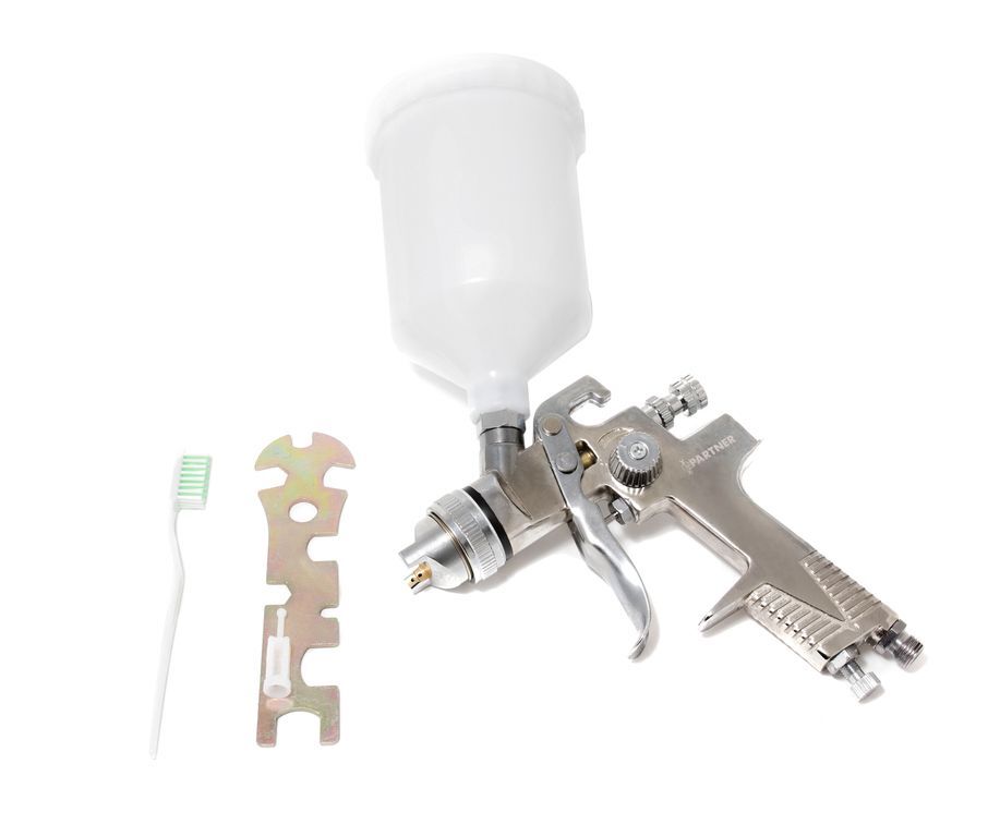Тип: краскопульт пневматический. Технические характеристики: - диаметр сопла 1.7 мм; - рабочее давление 3.5 бар; - емкость бачка 600 мл; - расход воздуха 100-128 л/мин; - присоединительня резьба под штуцер 1/4"с внутренней резьбой; - аксессуары для чистки краскопульта в комплекте.