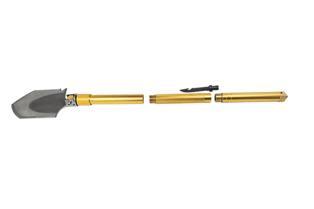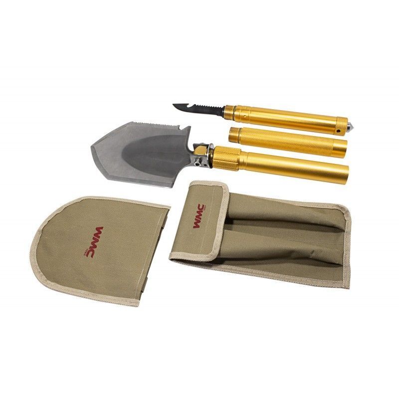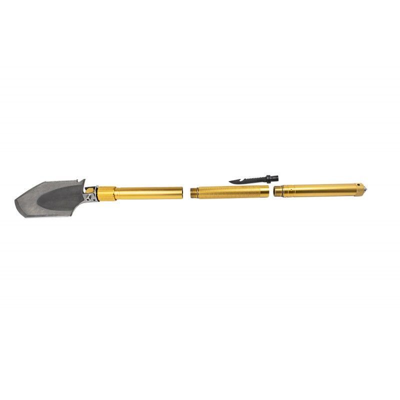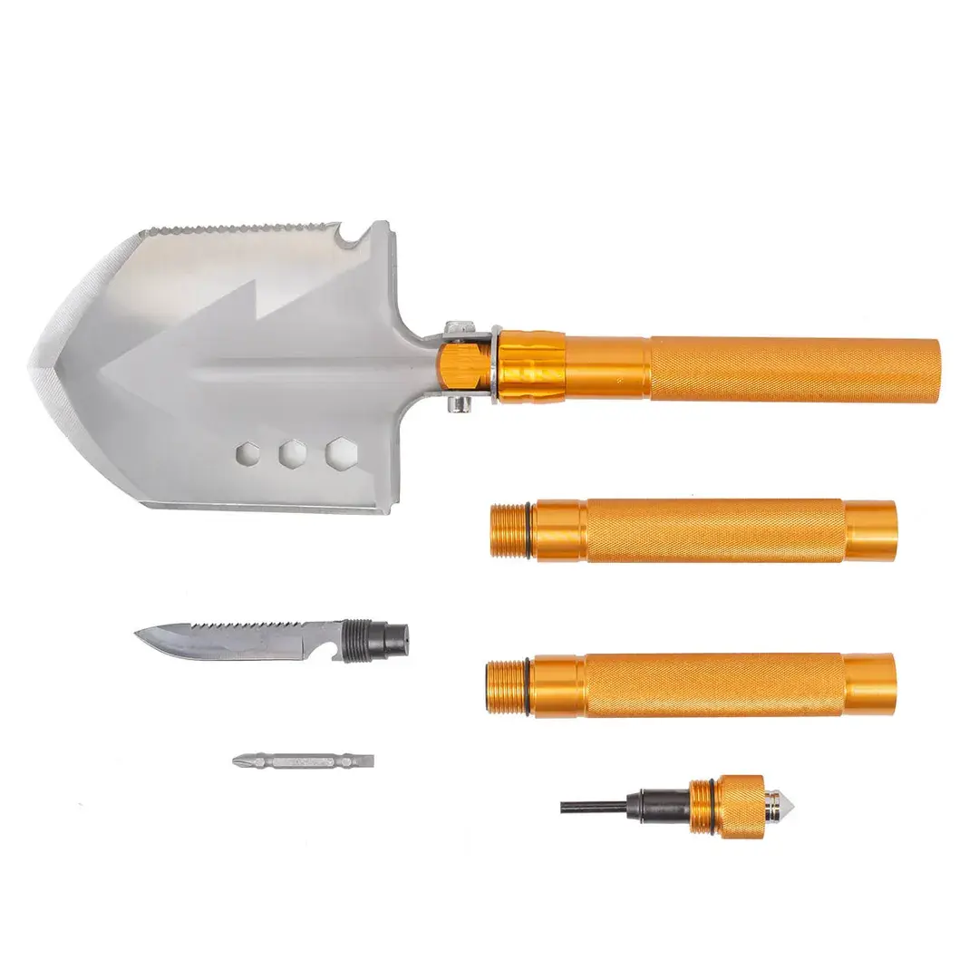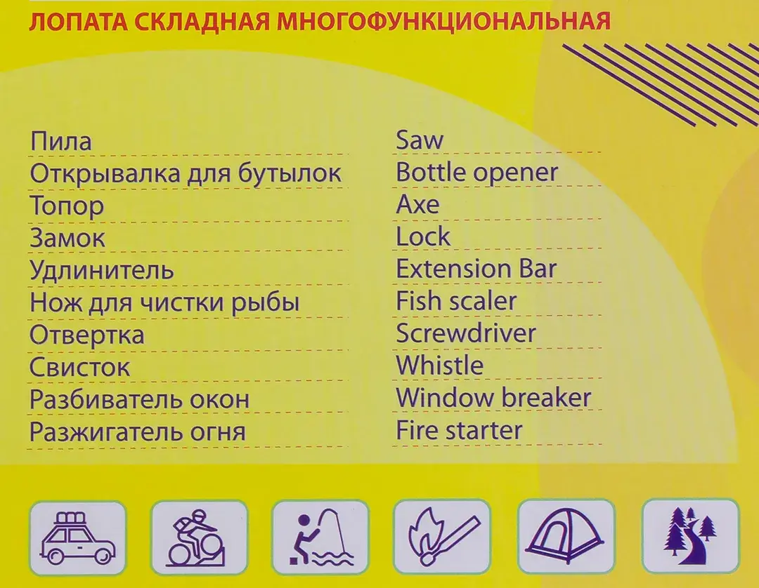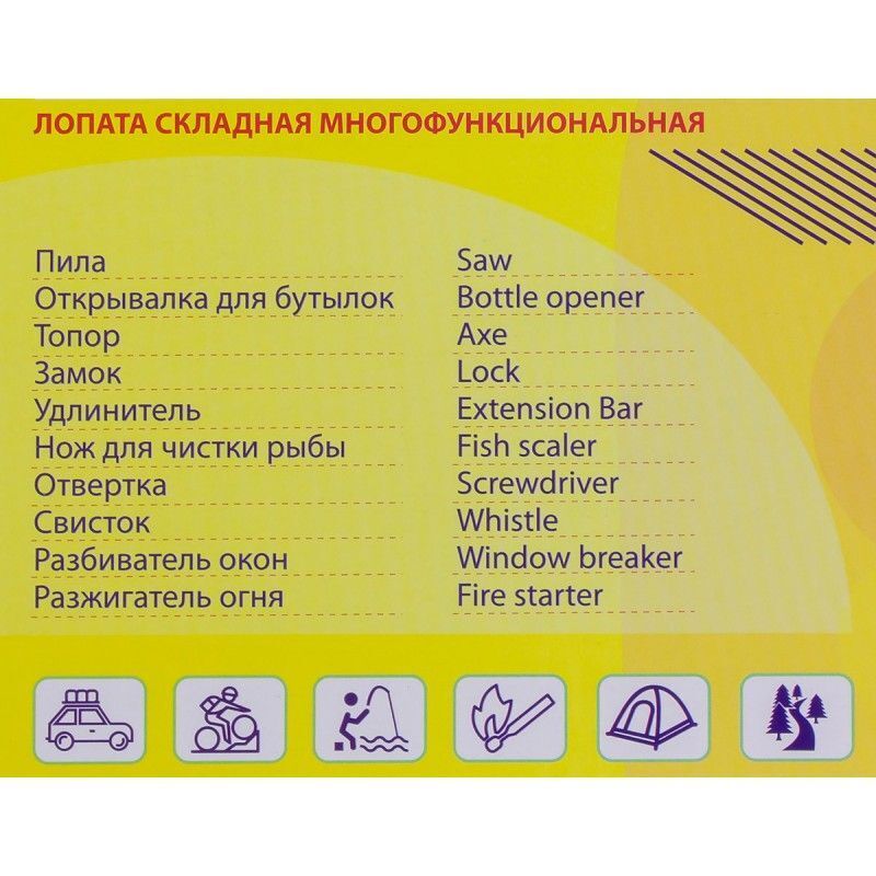 Лопата многофункциональная туристическая. Помимо использования по прямому назначению - как штыковую лопату, есть ещё множество других функций. На одной из сторон зубчатая поверхность, позволяющая использовать лопату в качестве ручной пилы. Другая кромка заточена, благодаря чему лопату можно использовать в качестве топора, где не справляется пила. Специальные отверстия в шестигранный форме способны открутить гайки. Туристическая лопата состоит из нескольких частей, которые включают в себя дополнительные функции. В одной из частей рукоятки располагается огниво, свисток и двухсторонняя бита, шлицевая плоская и крестовая. С одного края этой части рукоятки располагается отверстие под биты, а с другой - аварийный молоток или стеклобой. Во второй части рукоятки располагается тактический нож. У его основания расположена открывашка для бутылок. С обратной от лезвия стороны находится зубчатая кромка, которую можно так же использовать в качестве ручной пилы. У основания ножа есть специальная резьба, которую можно вкрутить в рукоятку и получится полноценный и удобный туристический нож. Тактическая лопата отлично пригодится в походе или просто при выезде на природу. Набор поставляется в картонной упаковке, а сама лопата и её составные части находятся в специальном чехле.