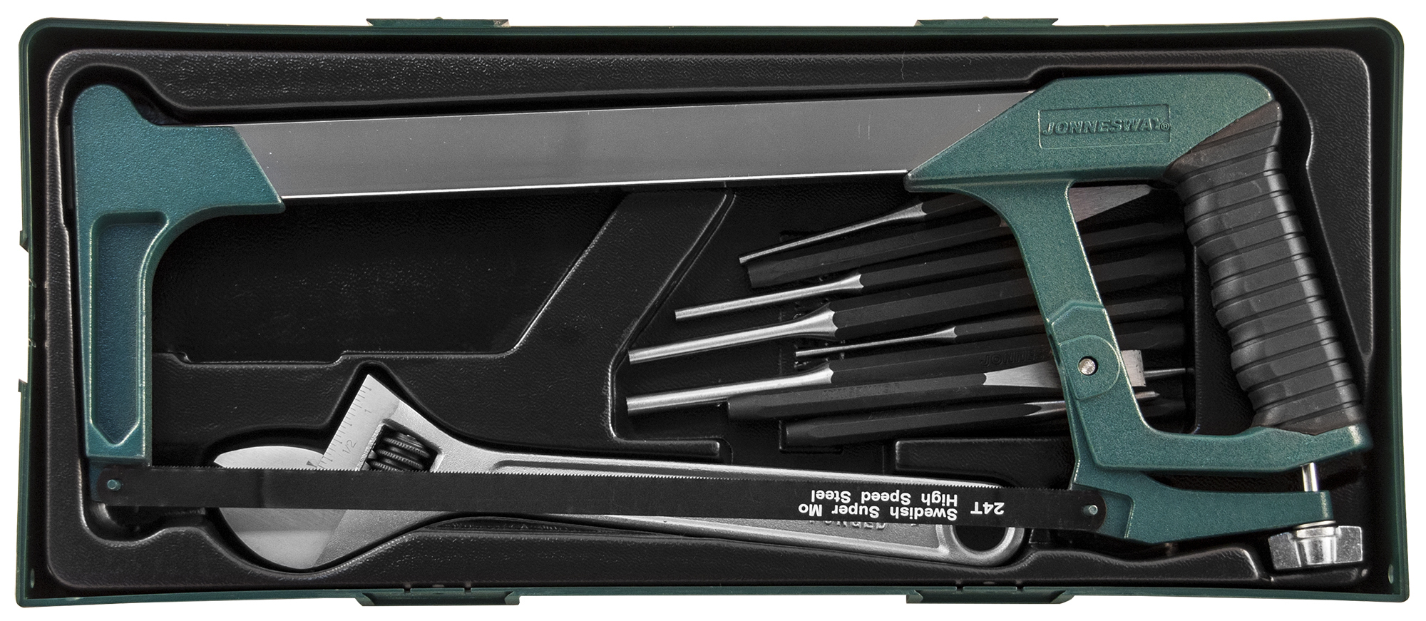 Содержание: Набор выколоток (М63106S): 2х8х115 мм; 3х8х125 мм; 4х9.5х150 мм; 5х9.5х165 мм; 6х12.7х180 мм; 8х12.7х180 мм; Набор ударно-режущего инструмента: Кернер №2х120 мм; Бородок 3х120 мм; Зубило 12х130 мм; Крейцмейсель 5х130 мм; Выколотка 4х150 мм (М64105S); Ключ разводной 250 мм (W27AS10); Ножовка по металлу 300 мм (MHS100AG).