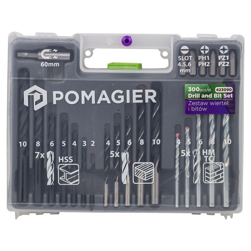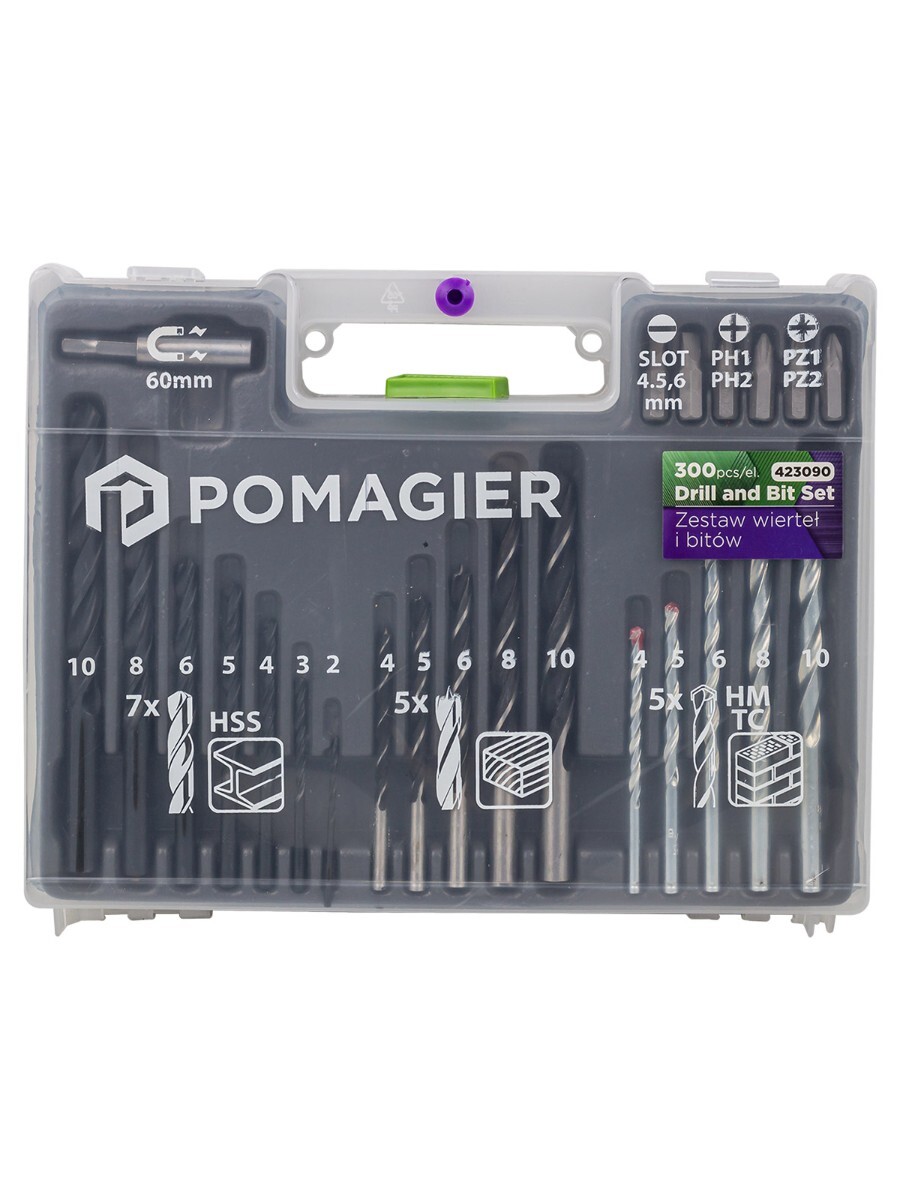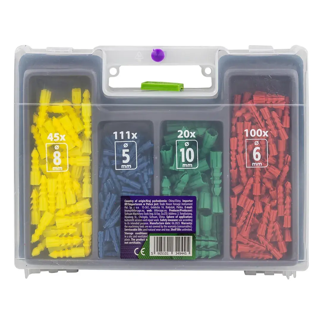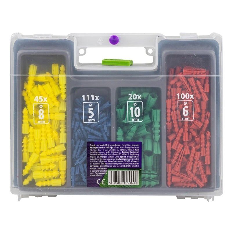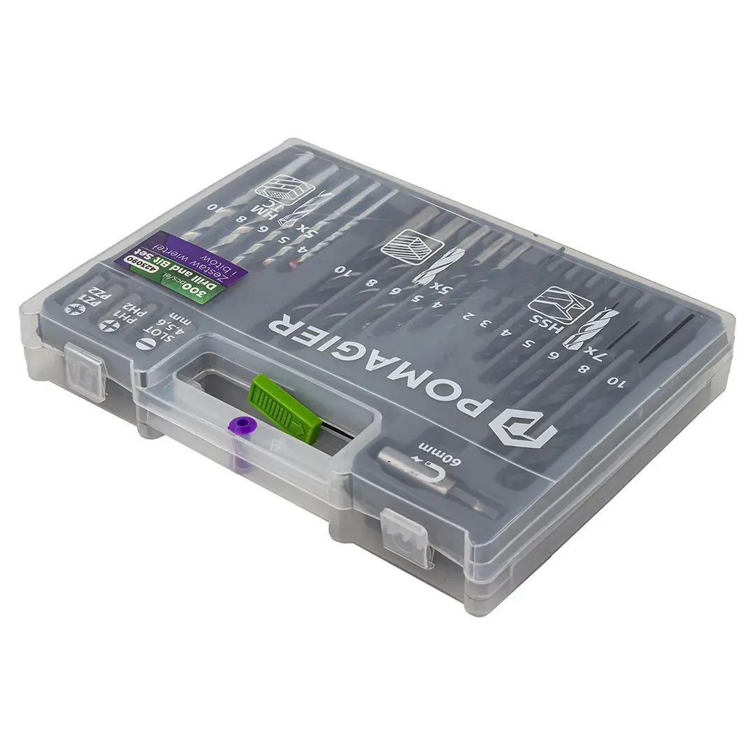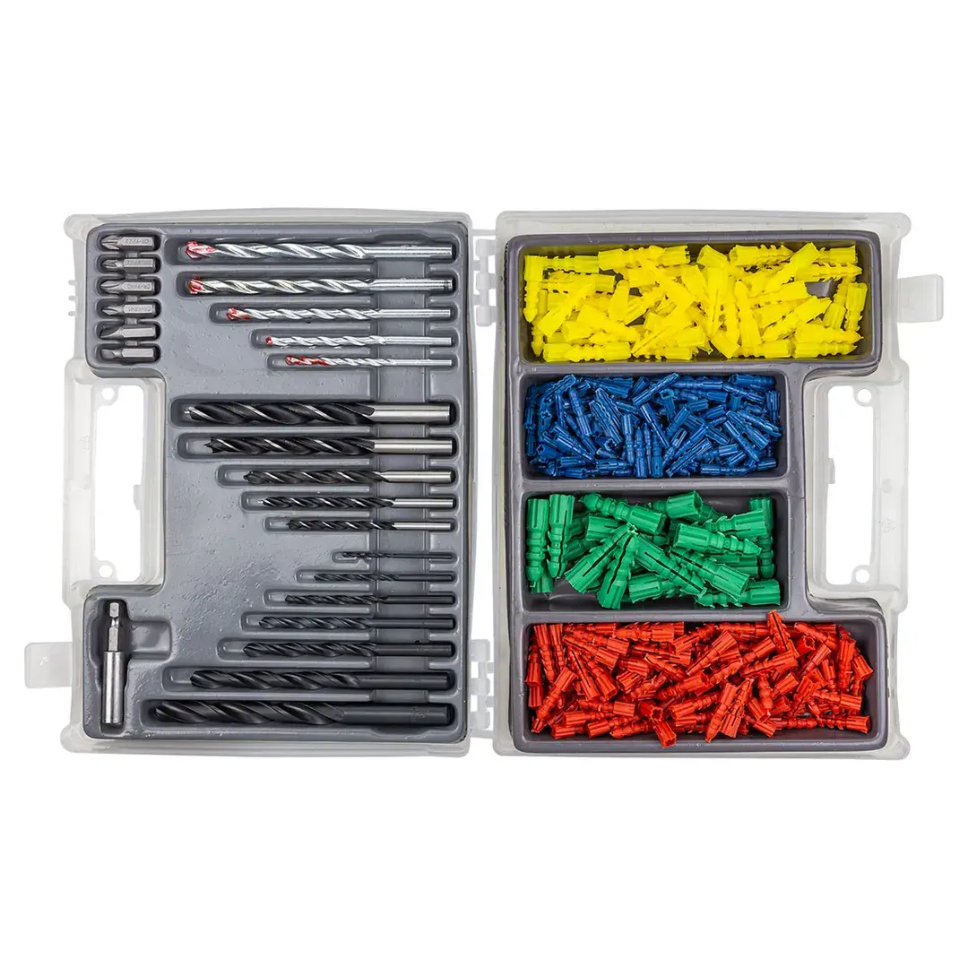 Комплектация: Свёрла по металлу: 2-3-4-5-6-8-10 мм; Свёрла по дереву: 4-5-6-8-10 мм; Свёрла по бетону: 4-5-6-8-10 мм; Магнитный держатель для бит 1/4"длина 60мм; Биты 1/4": SL4,5x30, SL6x30, PH1x30, PH2x30, PZ1x30, PZ2x30; Крепежи 5мм 111шт.; Крепежи 6мм 100шт; Крепежи 8 мм 45шт.; Крепежи 10мм 20 шт.