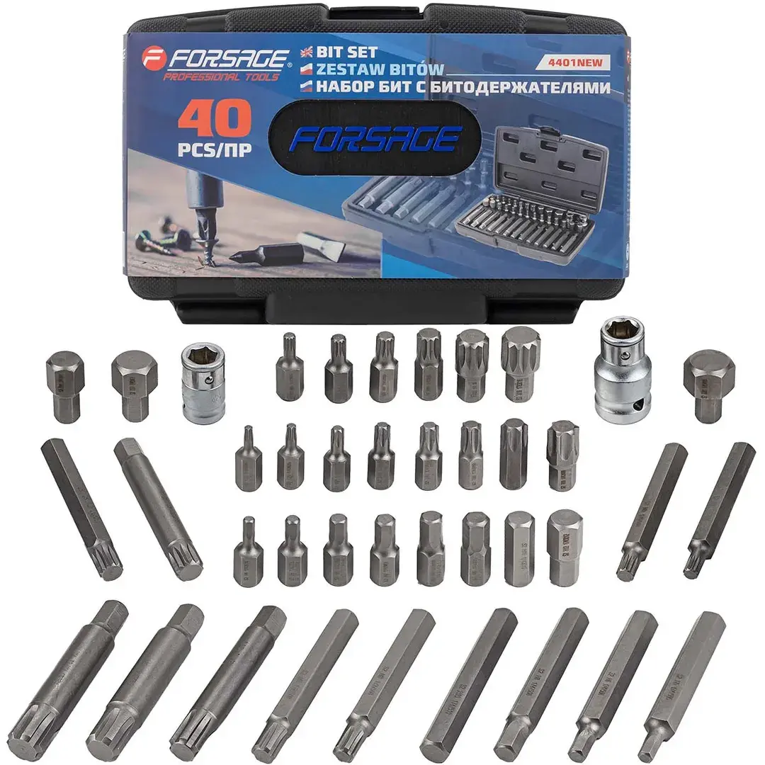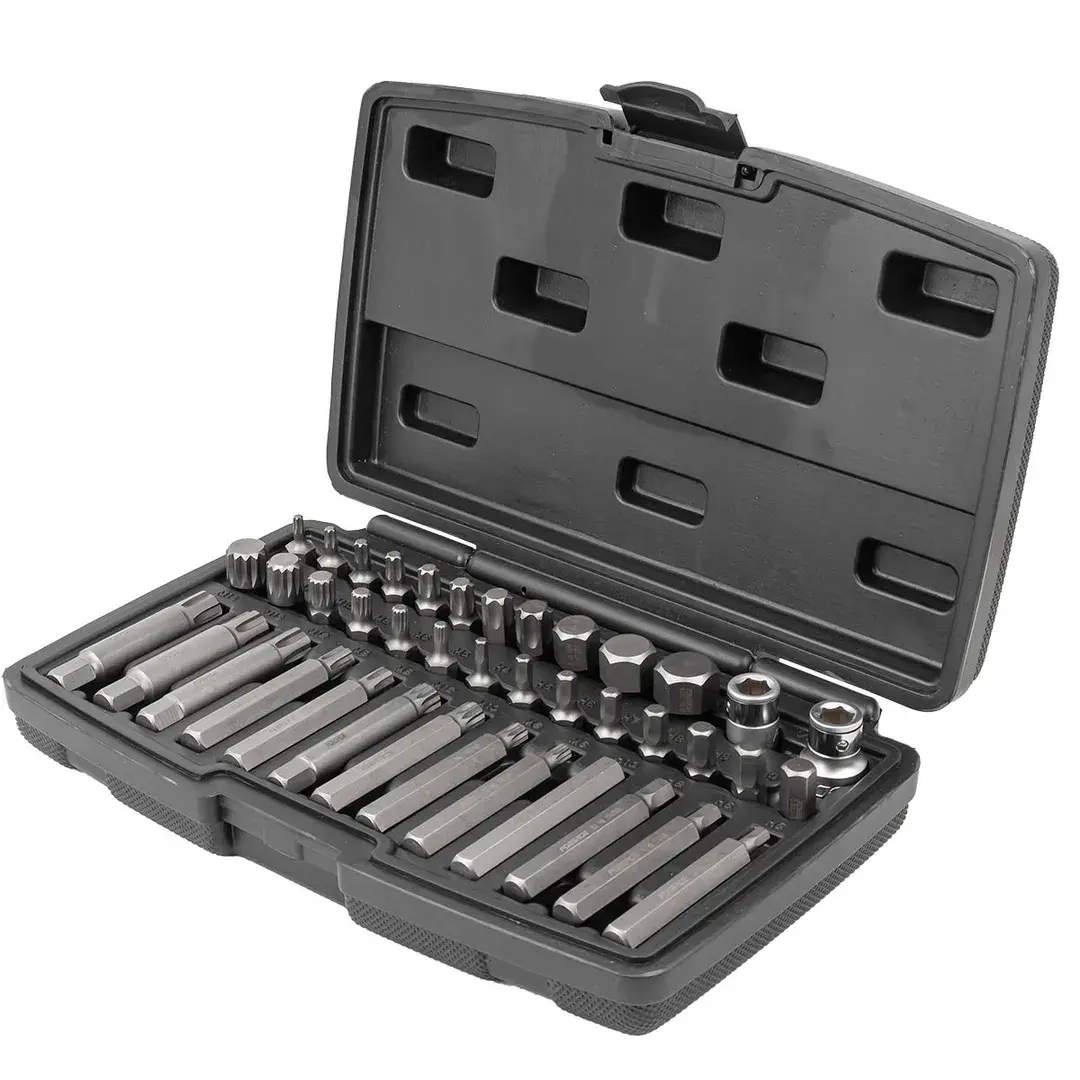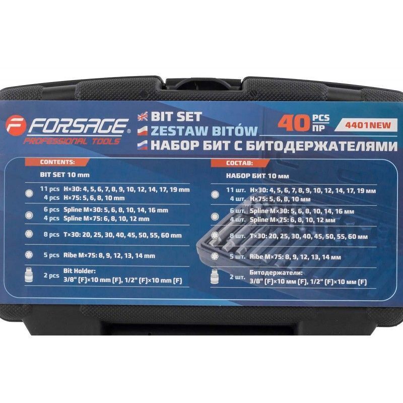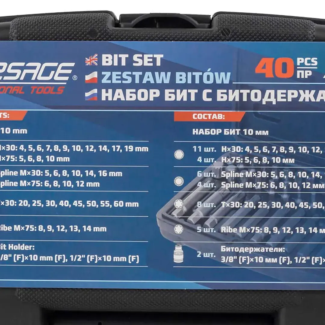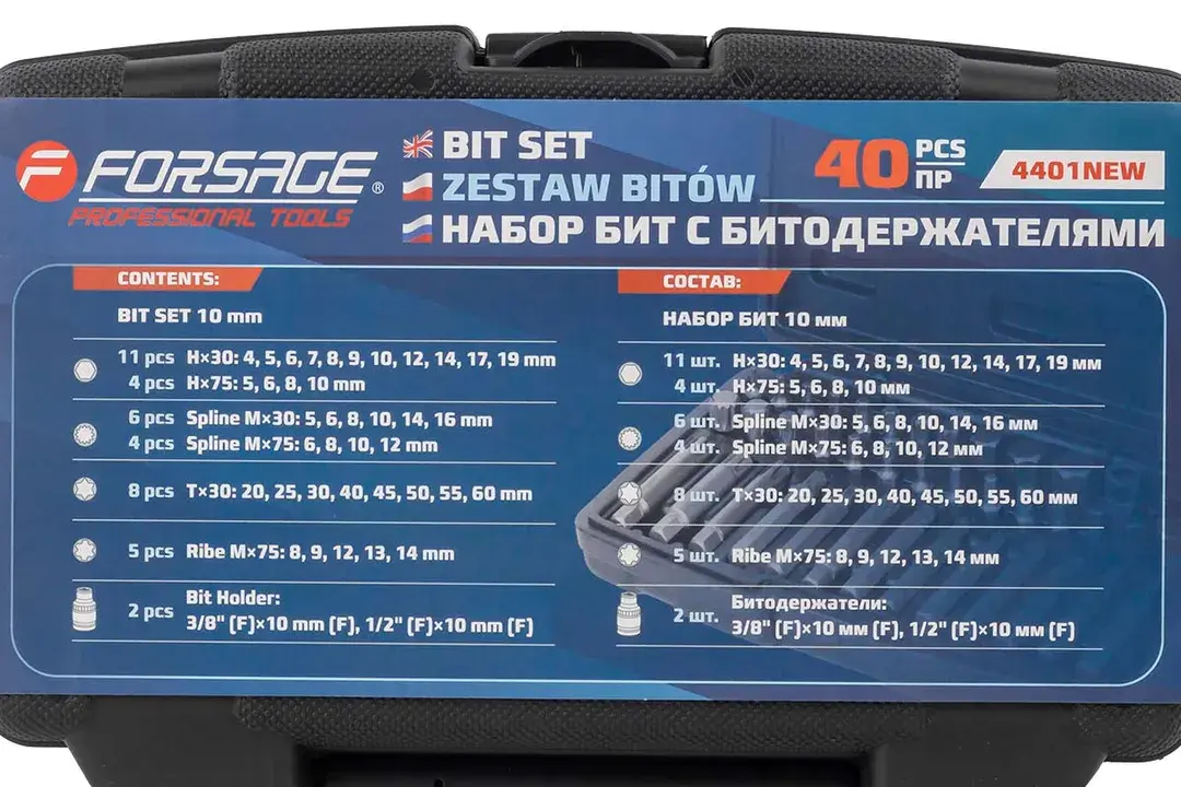 Комплектация: Биты HEX 10 мм: L=30 мм: 4, 5, 6, 7, 8, 9, 10, 12, 14, 17, 19 мм - 11 шт. L=75 мм: 5, 6, 7, 8, 10 мм - 5 шт. Биты Torx 10 мм: L=30 мм: T20, T25, T30, T40, T45, T50, T55, Т60 - 8 шт. Биты Spline 10 мм: L=30 мм: M5, M6, M8, M10, M14, М16 - 6 шт. L=75 мм: M6, M8, M10, M12 - 4 шт. Биты Ribe 10 мм: L=75 мм: М8, М9, М12, М13, М14 - 5шт. Держатель бит: 3/8"х10 мм - 1 шт. 1/2"х10 мм - 1 шт. Пластиковый кейс