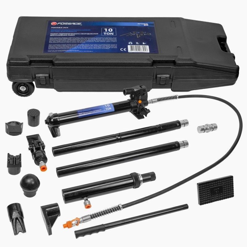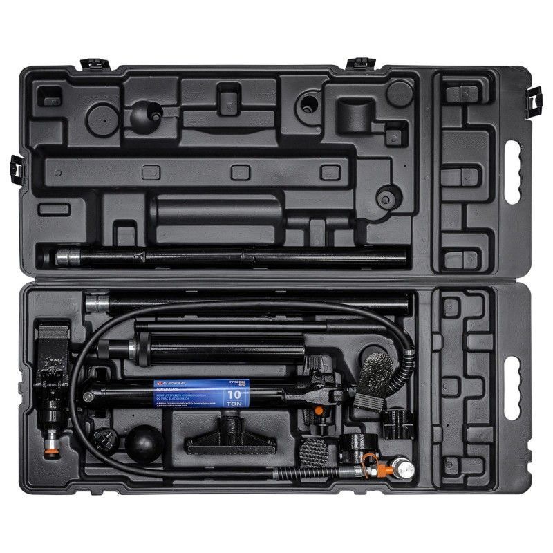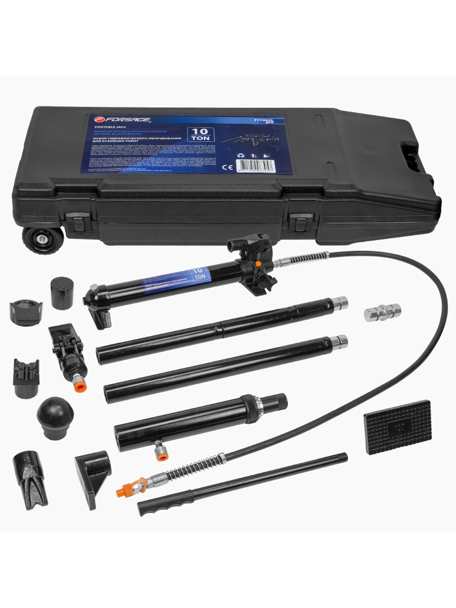 Насос гидравлический 10т 480мм; Цилиндр гидравлический 10т 380мм; Насадки для гидравлического цилиндра 7шт.; Расширитель гидравлический 0,5т; Удлинители для цилиндра гидравлического 100мм, 200мм, 300 мм, 550мм.
