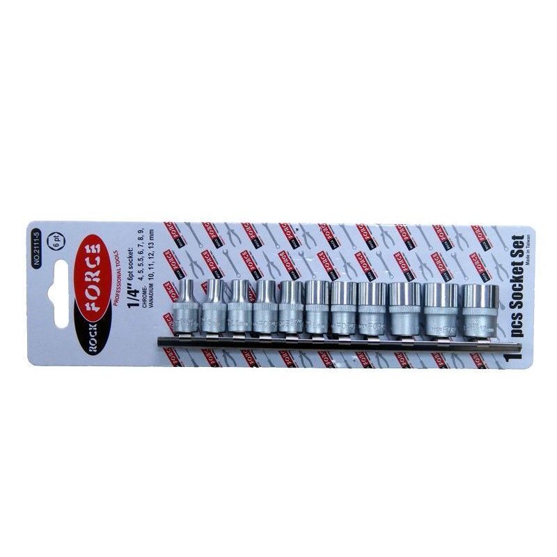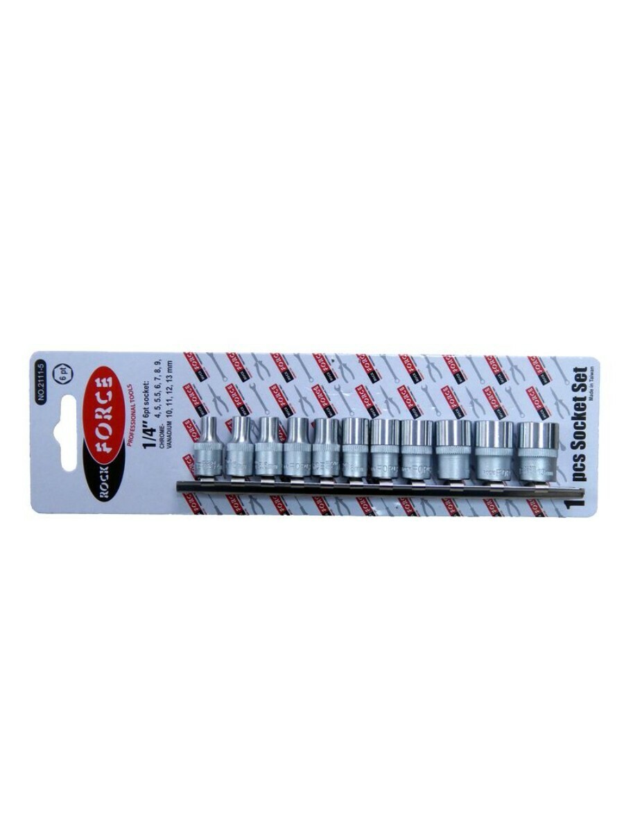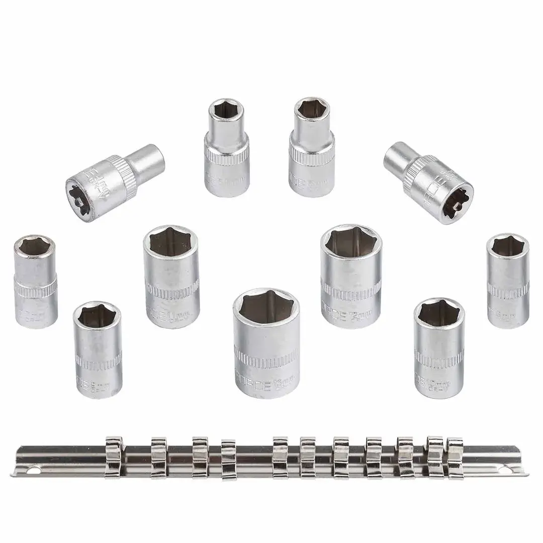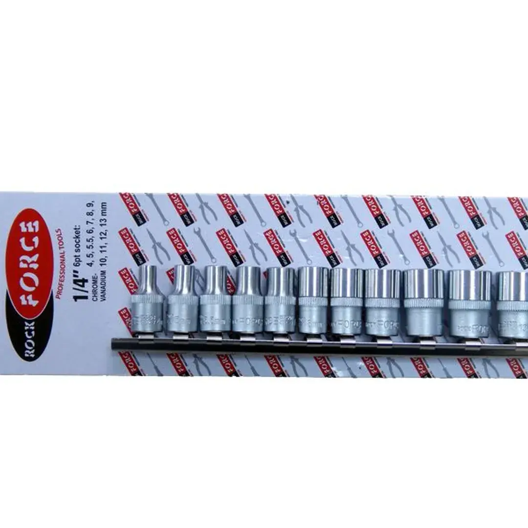Универсальный набор головок для закручивания и откручивания гаек и болтов. Головки изготовлены из прочной хромованадиевой стали (CrV). Головки позволяют быстро и удобно затягивать или ослаблять гайки и болты, обеспечивая достаточное усилие для выполнения задачи. Широко применяются в ремонте и обслуживании автомобилей, велосипедов, строительных работах, работа с крепежными элементами, для бытовых нужд, сантехнике. Используются вместе с трещоткой, воротком, гайковертом, шуруповертом. Посадочный квадрат 1/4". Тип головок: 6 гранные, короткие. Размеры головок: 4, 5, 5.5, 6, 7, 8, 9, 10, 11, 12, 13 мм. На металлической планке.