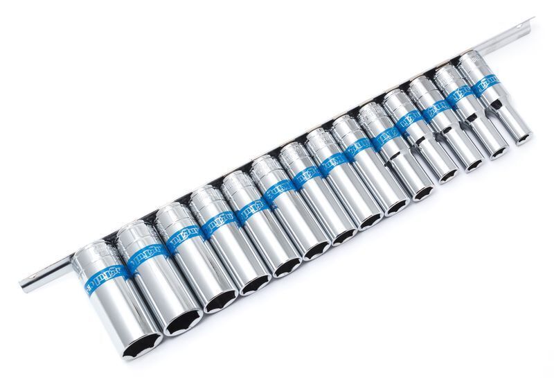 Посадочный квадрат 1/2". Тип головок: 6 гранные, глубокие. Размеры головок: 8, 10, 11, 12, 13, 14, 15, 16,17, 18, 19, 21, 22, 24 мм. На металлической планке.