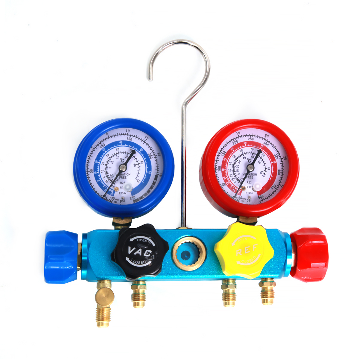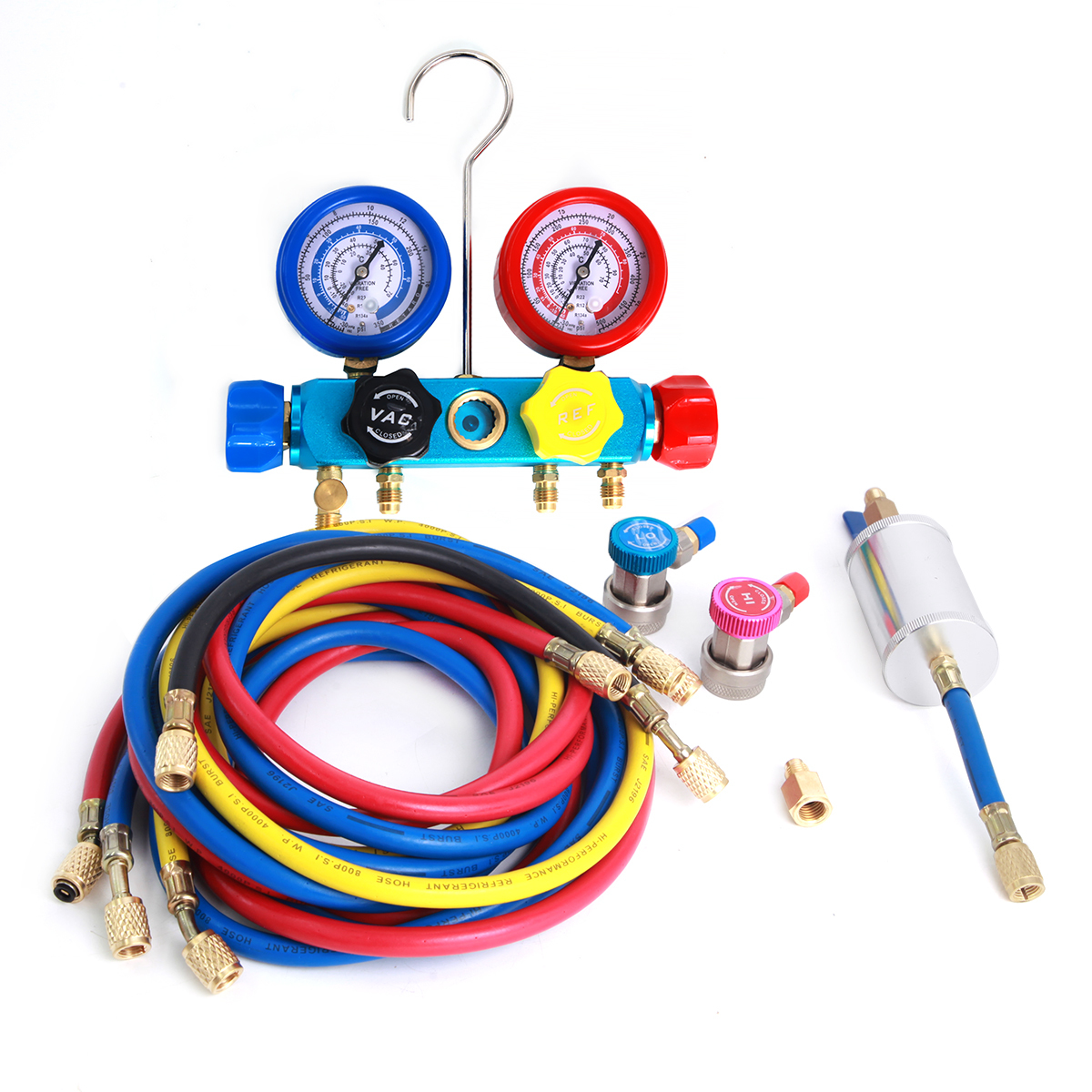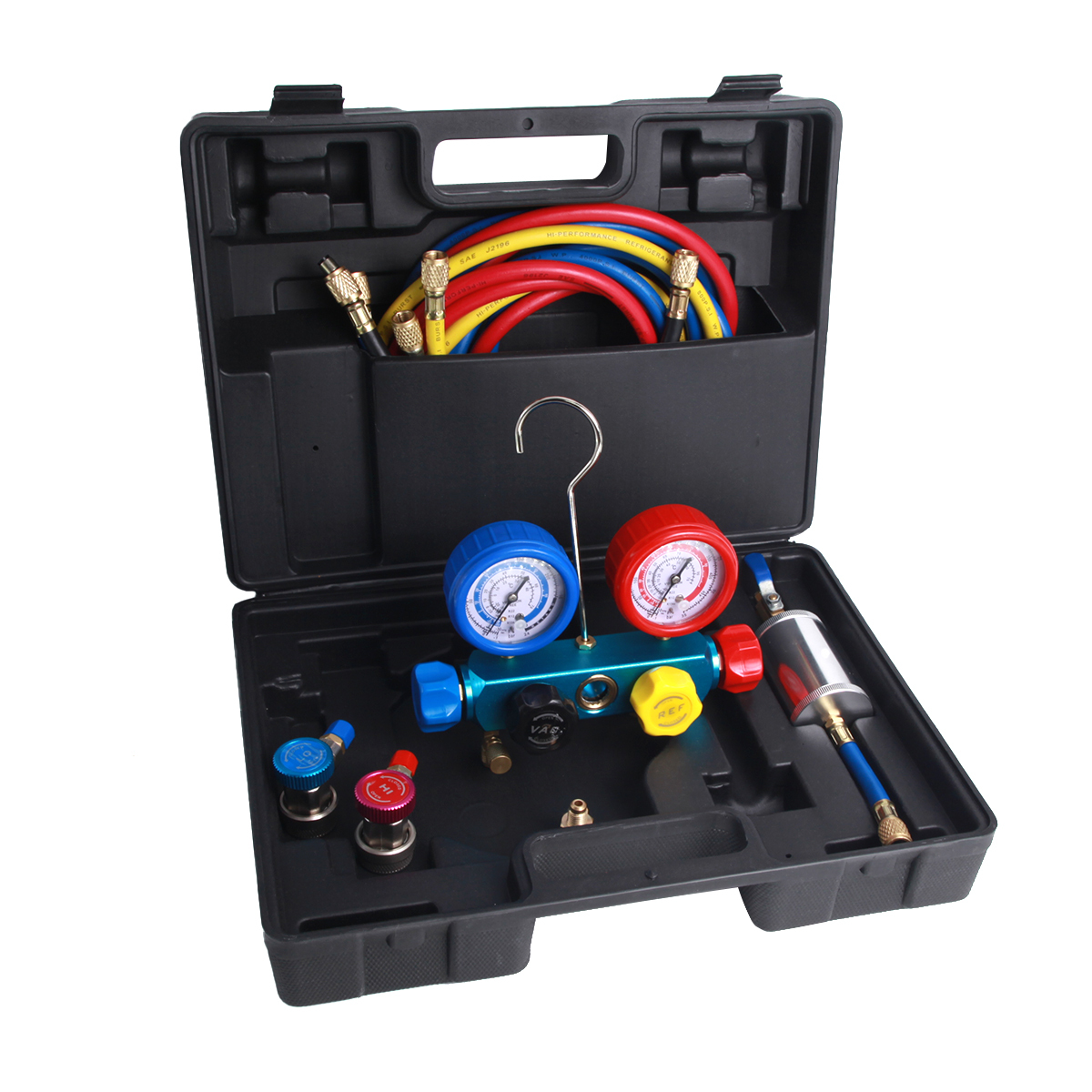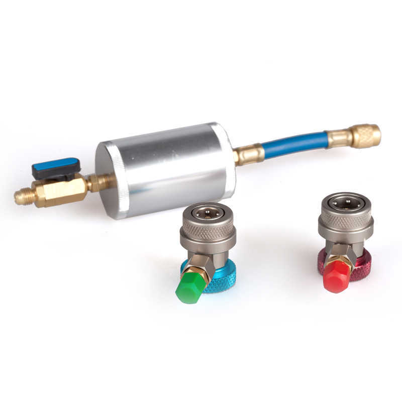 Car-tool CT-M1001 набор для обслуживания систем кондиционирования, работающих на хладагенте R134A, R22 и R12. С его помощью вы сможете проверить в системе давление, утечки и заправить новым хладагентом, маслом и UV красителем. В комплект используется резьба SAE 1/4.