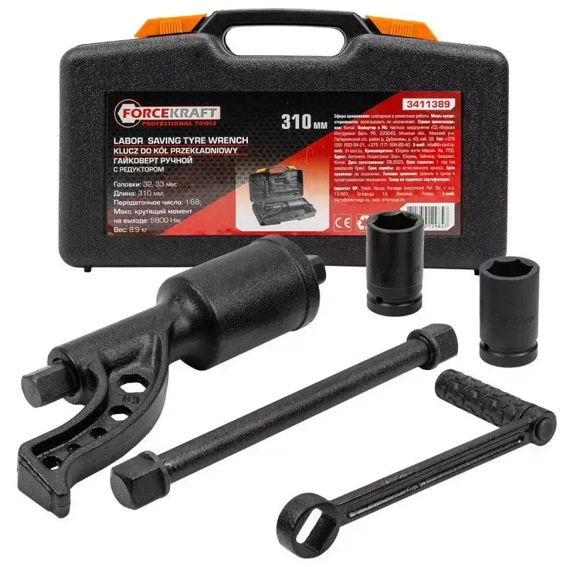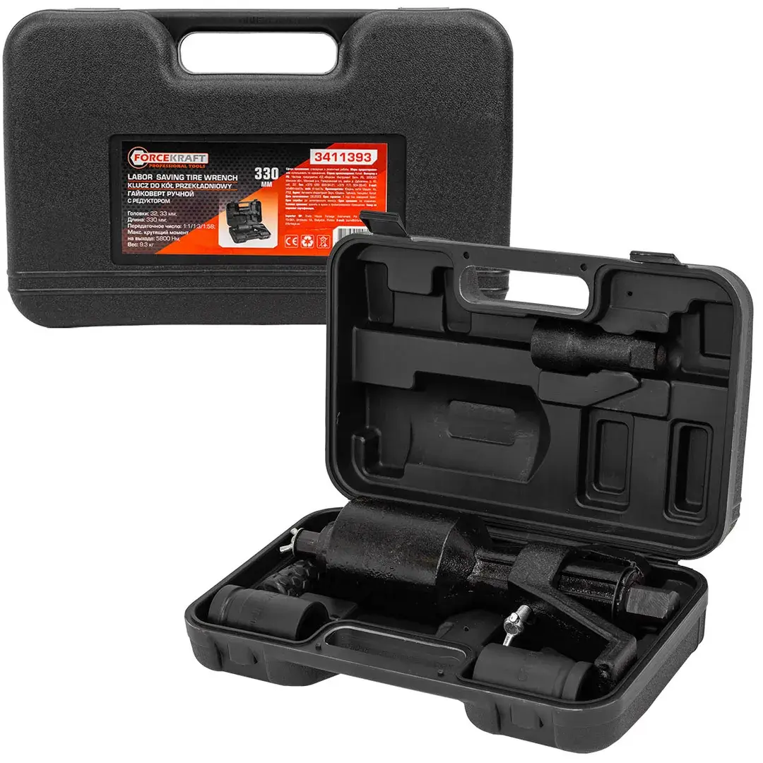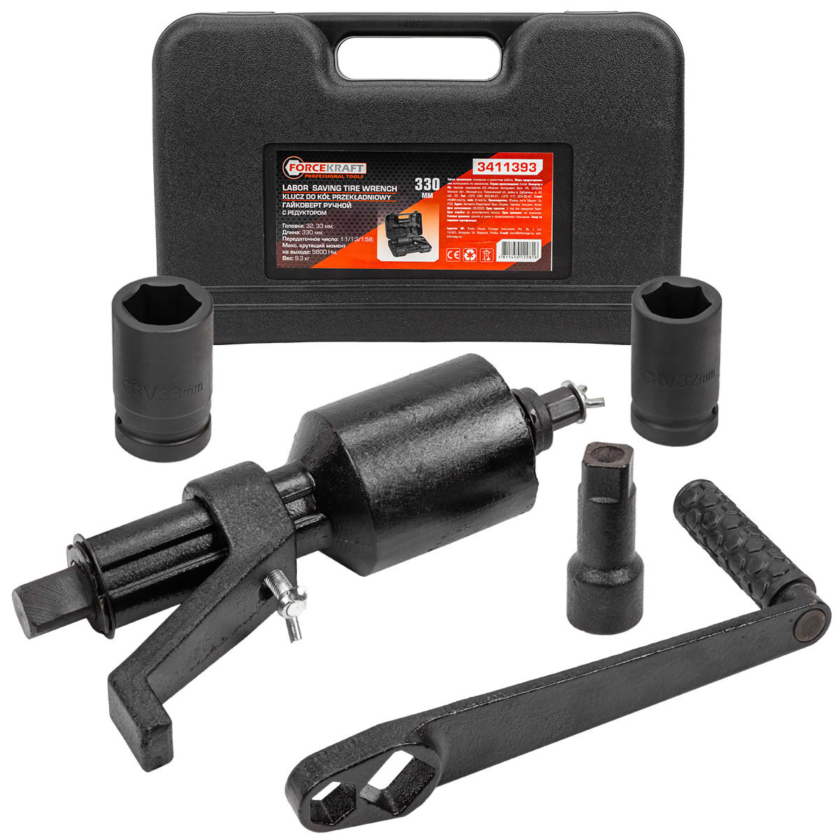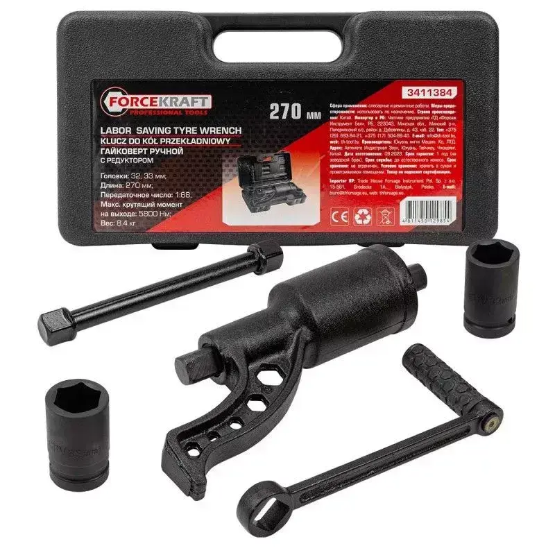 Гайковерт ручной с редуктором в кейсе предназначен для откручивания различных резьбовых соединений на грузовых автомобилях, строительных сооружениях и др. При помощи "мясорубки"можно выполнять работу не прилагая больших усилий. Присоединительный квадрат 1". Передаточное число 1:1/1:3/1:58. Длина 330 мм. Комплектуется головками: 32, 33 мм. Максимальный момент силы 5800 Нм. В пластиковом кейсе.
