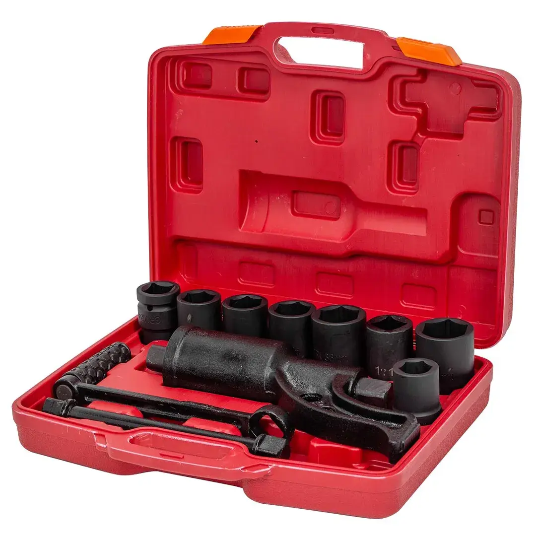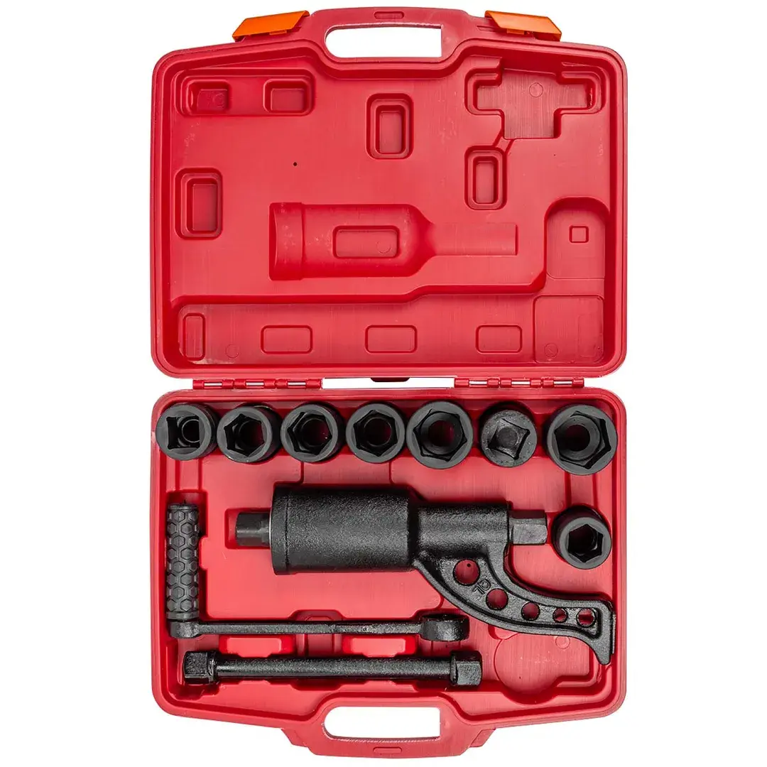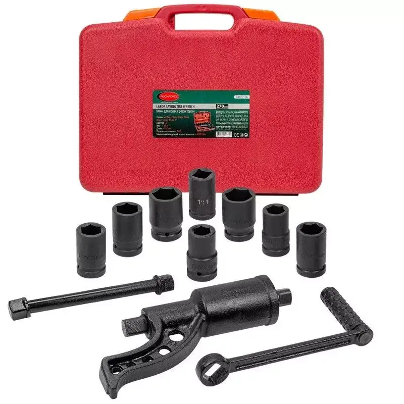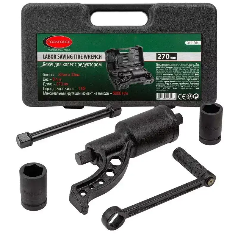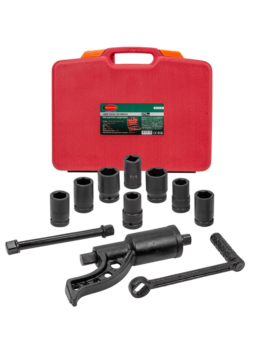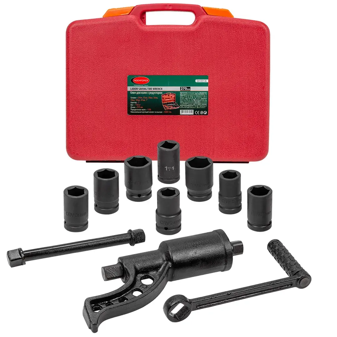 Гайковерт ручной с редуктором в кейсе предназначен для откручивания различных резьбовых соединений на грузовых автомобилях, строительных сооружениях и др. При помощи "мясорубки"можно выполнять работу не прилагая больших усилий. Длина : 270мм; Максимальный крутящий момент 4800 Н/м. Передаточное число 1:58. Посадочный квадрат 1". Размеры головок 24, 27, 30, 32, 33, 38, 41 мм и адаптор 1"в комплекте. Рабочий профиль 6 граней. Для удобства хранения и транспортировки поставляется в прочном пластиковом кейсе.