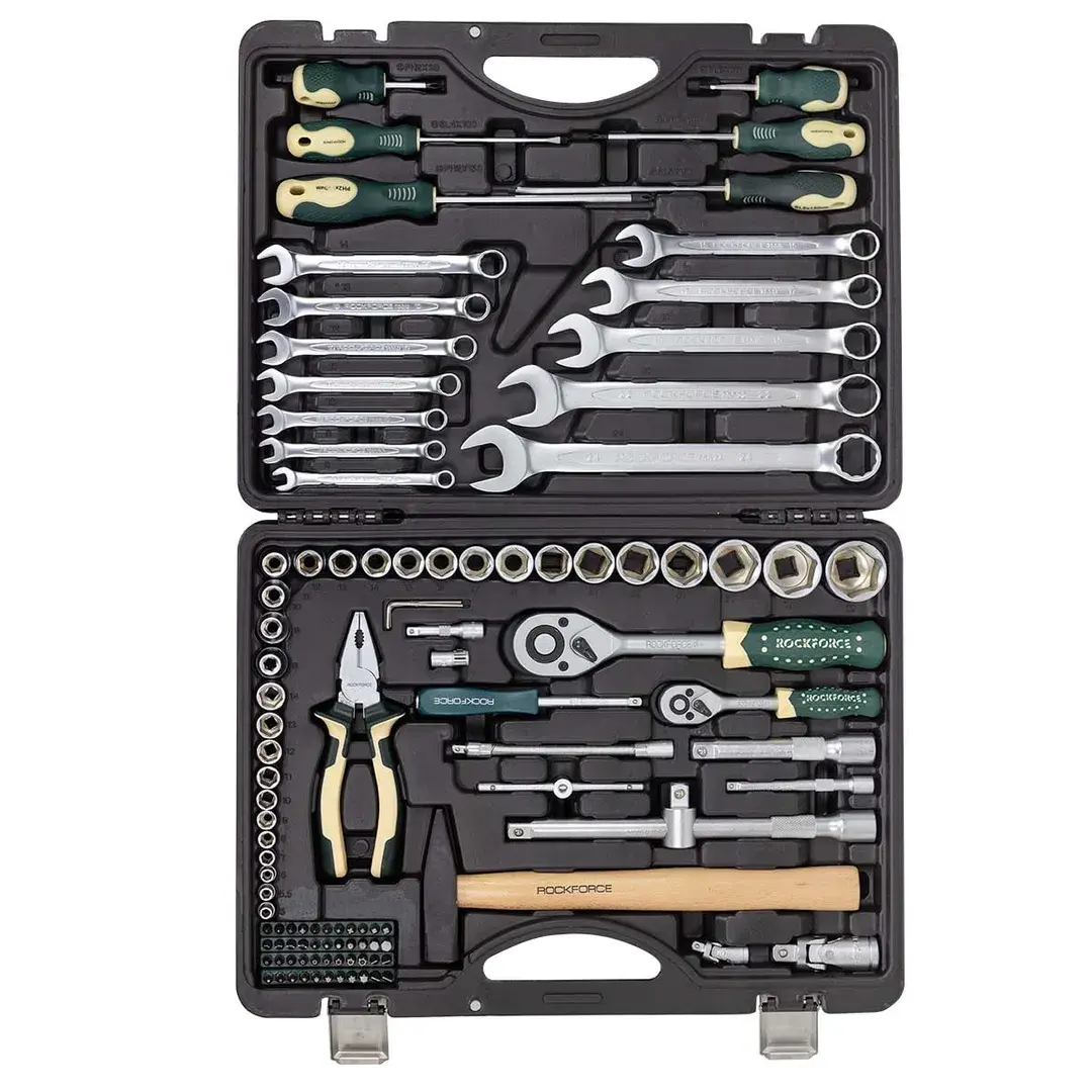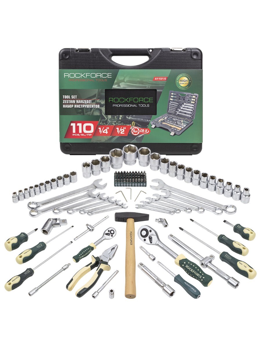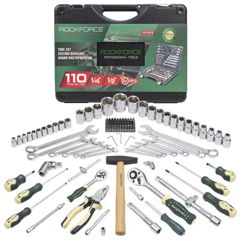 Набор инструментов 110 предметов - это идеальное решение для профессиональных механиков и любителей автомобильных ремонтных работ. Комплектация включает в себя разнообразные инструменты, удовлетворяющие широкий спектр потребностей. В наборе имеются посадочные квадраты 1/4"и 1/2". Материал инструментов прочный и надежный - хромованадиевая сталь (CrV). Этот набор инструментов отличается высоким качеством и разнообразием инструментов, что делает его идеальным выбором для профессиональных механиков и любителей автомобильных ремонтных работ. Комплектация: посадочный квадрат 1/4": головки короткие: (5, 5.5, 6, 7, 8, 9, 10, 11, 12, 13, 14 мм.), удлинители (L-50, L-100 мм.), трещотка 1 шт., битодержатель 1/4 (F) х 1/4 (F), вороток Т-образный 115 мм., кардан шарнирный, рукоятка для бит, вороток шарнирный, биты 44 шт: PH (0, 1, 2, 3 мм.), PZ (0, 1, 2, 3 мм.), SL (4, 5.5, 6, 7 мм.), SLT (4, 6, 8, 10) Н (2, 2.5, 3, 4, 5, 6, 7 мм.), T (8, 9, 10, 15, 20, 25, 27, 30, 40), TT (8, 9, 10, 15, 20, 25, 27, 30, 40), S (1, 2, 3). Посадочный квадрат 1/2": головки короткие (8, 9, 10, 11, 12, 13, 14, 15, 16, 17,18, 19, 21, 22, 24, 27, 30, 32 мм.), трещотка, удлинители (L-125, L-250 мм.), кардан шарнирный, адаптер-переходник 3/8 (F) х1/2 (М), ключи комбинированные: (8, 9, 10, 11, 12, 13, 14, 15, 17, 19, 22, 24 мм.), молоток 300 гр., плоскогубцы комбинированные 180 мм., отвертки (РН2 х 38, РН1 х 100, РН2 х 150; SL6 х 38, SL4 х 100, SL5 х 150), ключи 6-гранные г-образные (1.5, 2, 2.5 мм.), кейс.