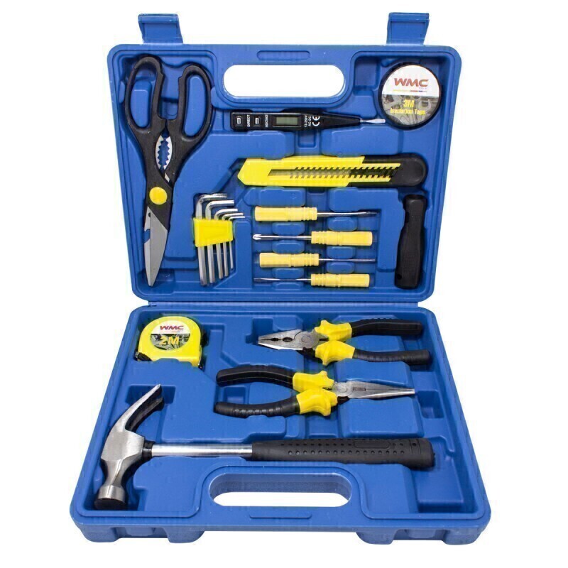 Набор инструментов WMC Tools - это универсальный комплект, который включает в себя все необходимые инструменты для решения бытовых задач. Комплектация: универсальный нож 18 мм., индикаторная отвертка, ключи Г-образные 6 шт. (2, 3, 4, 5, 6мм), изолента ПВХ 3 м., отвертки SL3х55, SL5х55, PH0х55, PH1х55, ножницы 8", рулетка 2 м., молоток-гвоздодер 230 г., длинногубцы 6", комбинированные плоскогубцы 6", кейс.