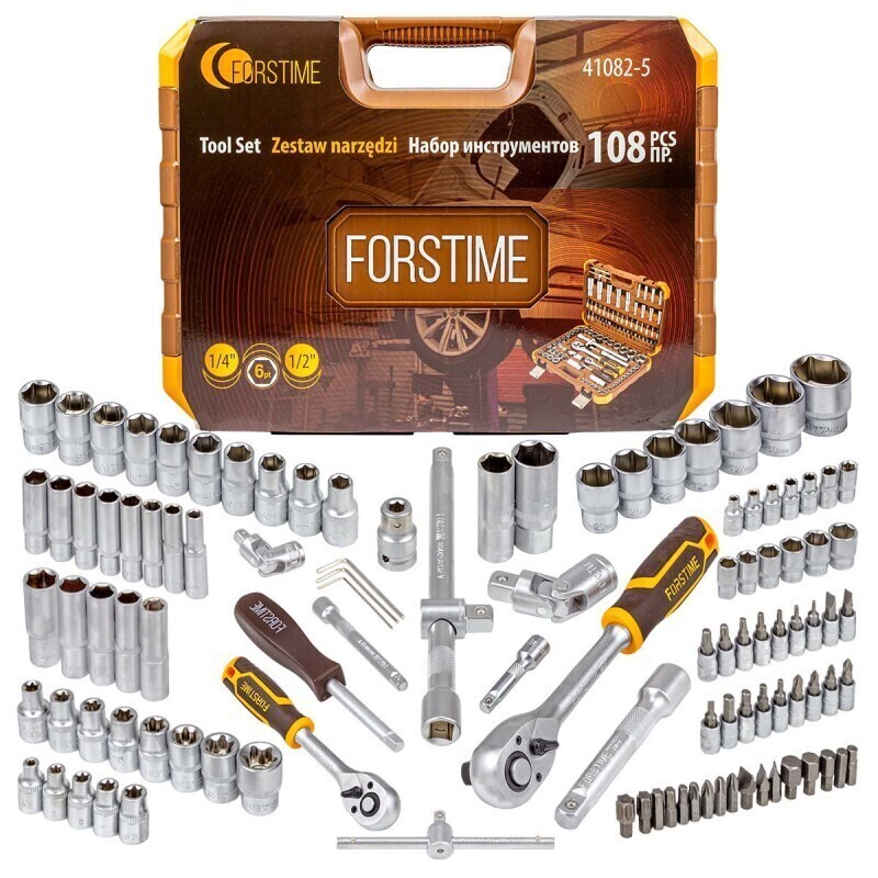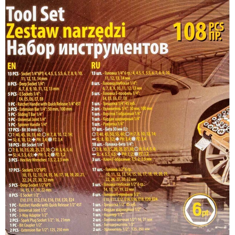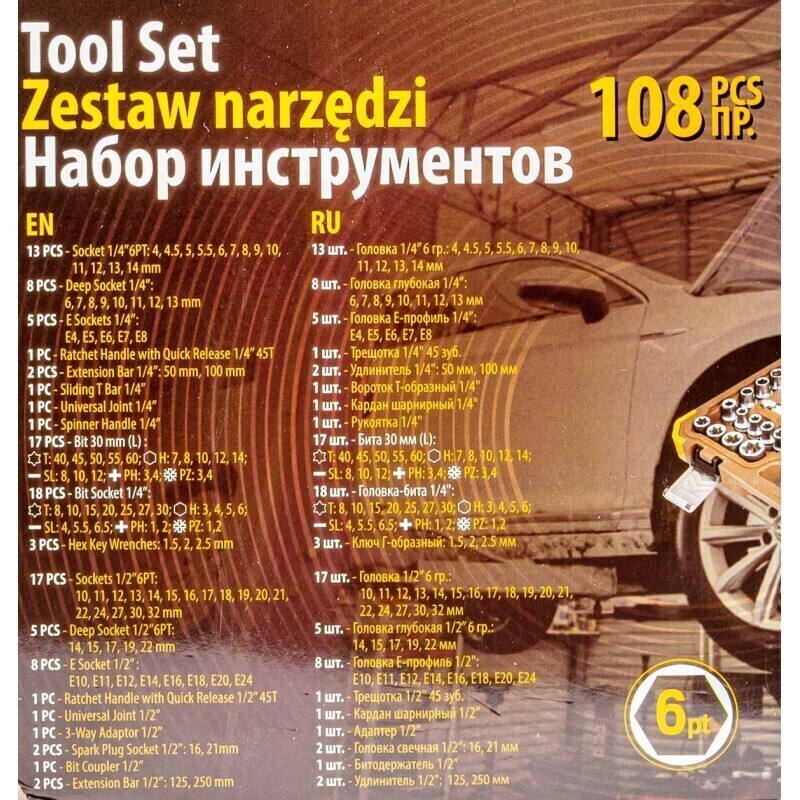 Набор инструментов из 108 предметов в кейсе. Набор инструментов очень удобен для профессионального механика и большинства домашних ремонтных работ. Этот набор инструментов изготовлен из высококачественной хромованадиевой стали. Включает самые необходимые инструменты для любого типа ремонта автомобиля, включая свечи зажигания, тормоза и обслуживание двигателя. Может использоваться для большинства механических операций, включая замену масла и обслуживание автомобилей. Головки и гаечные ключи совместимы с наборами инструментов других производителей. Отличный набор инструментов из 108 предметов, чтобы взять с собой в дорогу. Посадочный квадрат: 1/2"и 1/4". Комплектация: головки 1/4"короткие 25 мм (4, 4.5, 5, 5.5, 6, 7, 8, 9, 10, 11, 12, 13, 14 мм), головки 1/4"глубокие 50 мм (6, 7, 8, 9, 10, 11, 12, 13 мм), головки 1/4"Е-профиль короткие 25 мм (Е4, Е5, Е6, Е7, Е8), головки-биты 1/4"HEX 35 мм (3, 4, 5, 6 мм.), головки-биты 1/4"TORX 35 мм (T8, T10, T15, T20, T25, Т27, T30), головки-биты 1/4"SL 35 мм (4, 5.5, 6,5), головки-биты 1/4"РН 35 мм (РН.1, РН.2), головки-биты 1/4"PZ 35 мм (PZ.1, PZ.2), трещотка 1/4", рукоятка 1/4"150 мм., вороток Т-образный 1/4"115 мм, удлинители 1/4"50 и 100 мм., кардан шарнирный 1/4", биты 5/16"HEX 30 мм (7, 8, 10, 12, 14 мм.), биты 5/16"TORX 30 мм (Т40, Т45, Т50, Т55, Т60), биты 5/16"SL 30 мм (8, 10, 12), биты 5/16"PH 30 мм (PH.3, PH.4), биты 5/16"PZ 30 мм (PZ.3, PZ.4), головки 1/2"короткие 38 мм (10, 11, 12, 13, 14, 15, 16, 17, 18, 19, 20, 21, 22, 24, 27, 30, 32 мм.), головки 1/2"глубокие 77 мм (14, 15, 17, 19, 22 мм.), головки 1/2"Е-профиль короткие 38 мм (Е10, Е11, Е12, Е14, Е16, Е18, Е20, Е24), головки свечные 1/2"(16, 21 мм), трещотка 1/2", удлинители 1/2"125 и 250 мм., кардан шарнирный 1/2", адаптер с отверстием с 3/8"(F)*1/2"(M), битодержатель 1/2"(F)*5/16"(F), ключи Г-образные 6-гранные короткие (1.5, 2, 2.5 мм.), кейс. Все инструменты надежно хранятся в пластиковом кейсе с металлическими защелками, который обеспечивает удобную и компактную транспортировку. Комплектация набора идеально подходит для автолюбителей, автомастерских и сервисных центров.