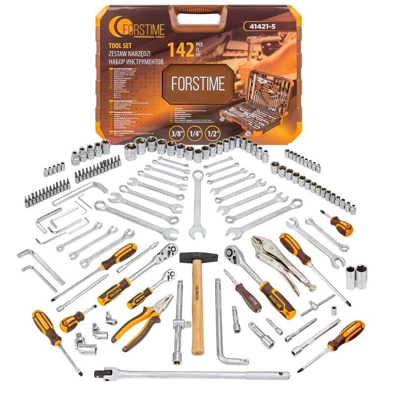 Посадочный квадрат: 1/4", 3/8", 1/2". Тип головок: 6 гранные, 12 гранные, Е-профиль, короткие. Комплектация: головки 1/4"короткие шестигранные 25 мм: 4, 4.5, 5, 5.5, 6, 7, 8, 9, 10 мм; головки 1/4"Е-профиль 25 мм: Е4, Е5, Е6, Е7, Е8; головки-биты 1/4"HEX 35 мм: 2, 3, 4, 5, 6, 7, 8, 10 мм; головки-биты 1/4"TORX 35 мм: T10Н, Т15Н, Т20Н, Т25Н, Т27Н, Т30Н, Т40Н; головки-биты 1/4"SL 35 мм: 4, 5,5, 7 мм; головки-биты 1/4"РН 35 мм РН.0, РН.1, РН.2, РН.3; головки-биты 1/4"PZ 35 мм PZ.0, PZ.1, PZ.2, PZ.3; трещотка 1/4"; вороток 1/4"Т-образный 115 мм; рукоятка 1/4"145 мм; удлинители 1/4"50, 100, 150 мм; гибкий удлинитель 1/4"145 мм; кардан шарнирный 1/4"; головки 3/8"короткие 12-гранные 28 мм: 6, 7, 8, 9, 10, 11, 12, 13, 14, 15, 17, 18, 19, 21, 22 мм; трещотка реверсивная шарнирная 3/8"; удлинители 3/8": 75, 150 мм; кардан щарнирный 3/8"; головки 1/2"короткие шестигранные 38 мм: 8, 10, 12, 13, 14, 15, 16, 17, 18, 20, 21, 22, 23, 24, 25, 27, 30, 32 мм; головки 1/2"Е-профиль 38 мм: Е10, Е12, Е14, Е16, Е20; головки свечные 1/2"16, 21 мм; трещотка 1/2"; вороток 1/2"Г-образный 260 мм; вороток шарнирный 1/2"430 мм; удлинители 1/2"75, 250 мм; кардан шарнирный 1/2"; адаптер с 3/8"(F)*1/2"(M) с отверстием; адаптер с 3/8"(F)*1/4"(M) с отверстием; битодержатель 1/4"(F)*1/4"(F) (HEX); ключи шестигранные Г-образные: 2.5, 3, 4, 5, 6, 7, 8, 10, 12, 14 мм; ключи разрезные: 8*10, 10*12, 11*13, 12*14, 17*19; ключи комбинированные рожково-накидные: 6, 7, 8, 9, 10, 11, 12, 13, 14, 15, 16, 17, 18, 19, 21, 22, 24 мм; отвертки крестовые PН.1*40 мм, PH.2*150 мм; отвертки шлицевые SL.5.5*40мм, SL.6.5*100 мм; отвертки силовые: PH.2*100 мм, SL.6.5*100 мм; плоскогубцы 7"175 мм; захват гейферный 10"250 мм; молоток с деревянной ручкой 300 гр. Пластиковый кейс с металлическими защелками.