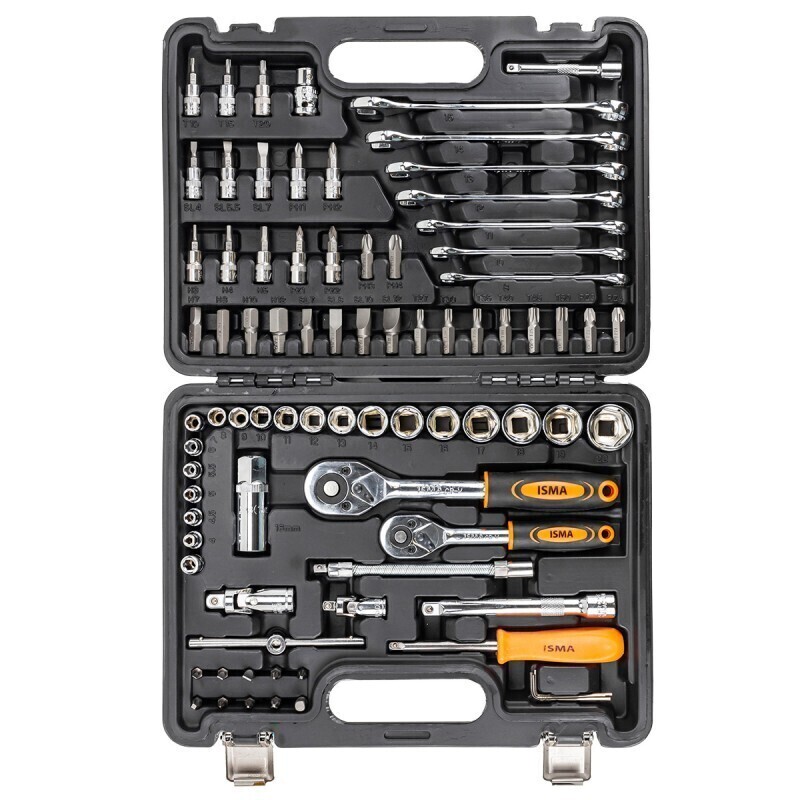 Набор инструментов для выполнения слесарных, ремонтных, монтажных работ. Набор имеет ряд достоинств, которые позволяют значительно облегчить выполнение работ при обслуживании и ремонте автомобильного средства. Все составляющие комплекта упакованы в пластиковый кейс с металлическими защёлками, где у каждого предмета своя ячейка хранения. Инструменты изготовлены из высококачественной хромованадиевой стали, что обеспечивает их прочность, долговечность и надежность. Включает самые необходимые инструменты для любого типа ремонта автомобиля, включая свечи зажигания, тормоза и обслуживание двигателя. Комплектация: головки 1/4"короткие (4, 4.5, 5, 5.5, 6, 7, 8, 9, 10, 11, 12, 13, 14 мм.), головки 3/8"короткие (14, 15, 16, 17, 18, 19, 22 мм.), головка свечная 3/8"16 мм., головки-биты 1/4"HEX 35 мм. (3, 4, 5 мм.), головки-биты 1/4"TORX 35 мм. (T10, T15, T20), головки-биты 1/4"SL (4, 5.5, 7), головки-биты 1/4"РН (РН.1, РН.2), головки-биты 1/4"PZ (PZ.1, PZ.2), биты 5/16"HEX (7, 8, 10, 12 мм.), биты 5/16"TORX (Т27, Т30, Т35, Т40, Т45, Т50), биты 5/16"SL (7, 8, 10, 12), биты 5/16"PH (PH.3, PH.4), биты 5/16"PZ (PZ.3, PZ.4), биты 1/4"SL (3, 4, 6), биты 1/4"PH (PH 1, PH.2, PH.3), биты 1/4"PZ (PZ.0, PZ.1, PZ.2), адаптер, рукоятка для головок, трещотка реверсивная 1/4", кардан 1/4", вороток Т-образный 1/4", удлинитель гибкий 1/4", удлинитель 1/4"75 мм., кардан 3/8", удлинитель 3/8"125 мм., трещотка реверсивная 3/8", битодержатели 1/4"и 3/8", ключи Г-образные шестигранные (1.5, 2, 2.5 мм.), ключи комбинированные (8, 10, 11, 12, 13, 14, 15 мм.), кейс.