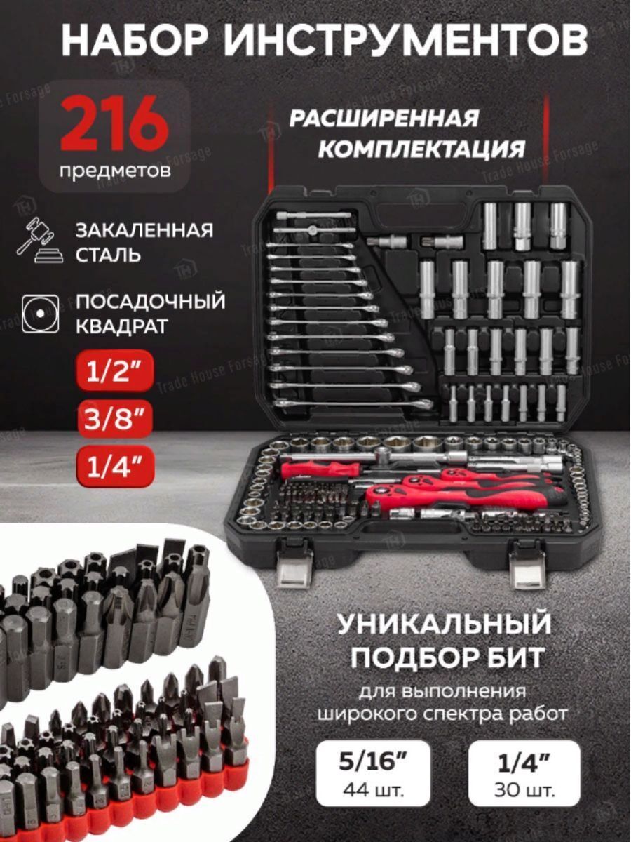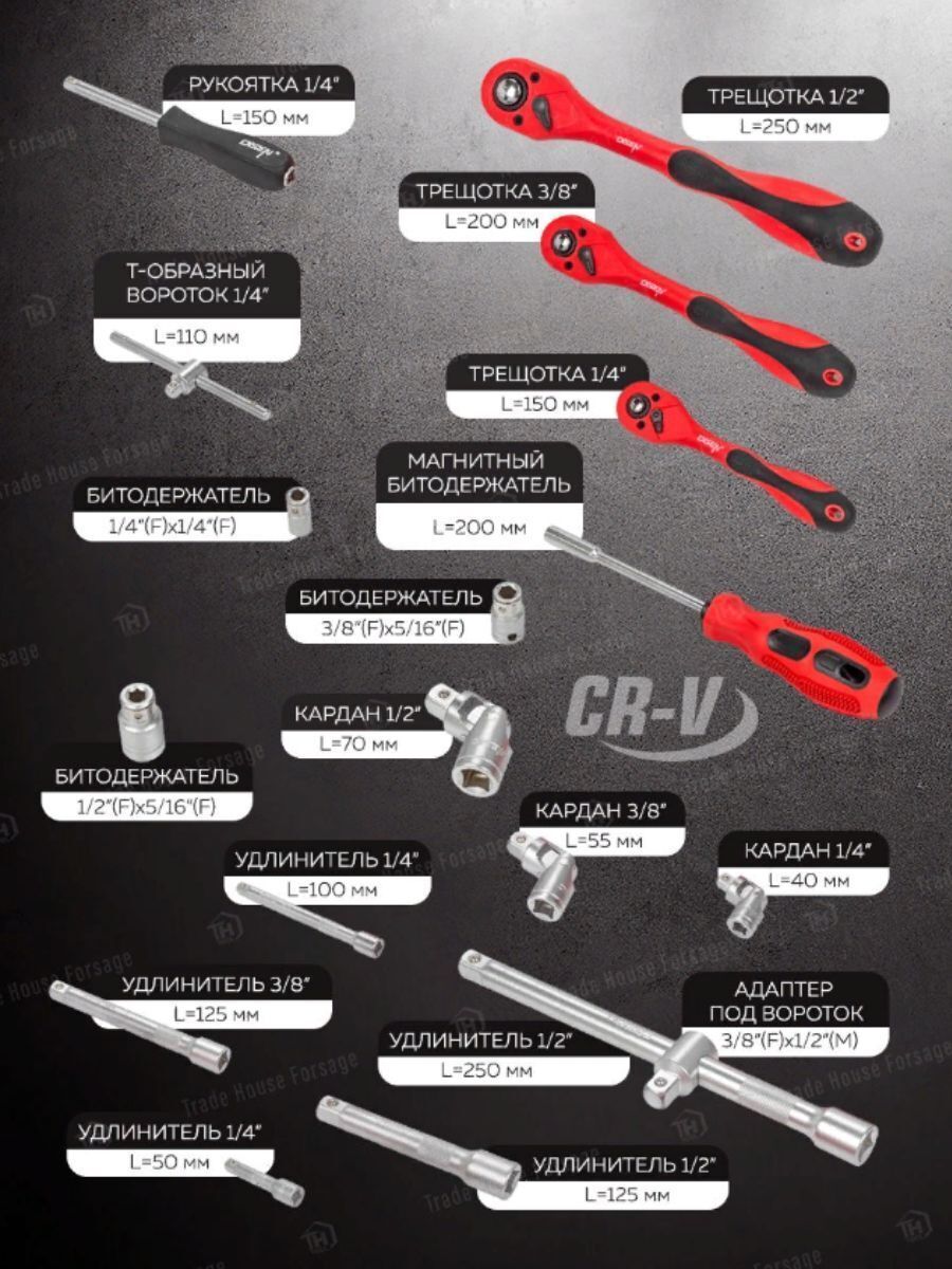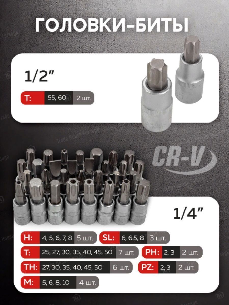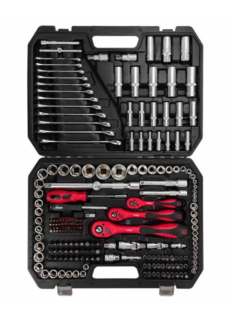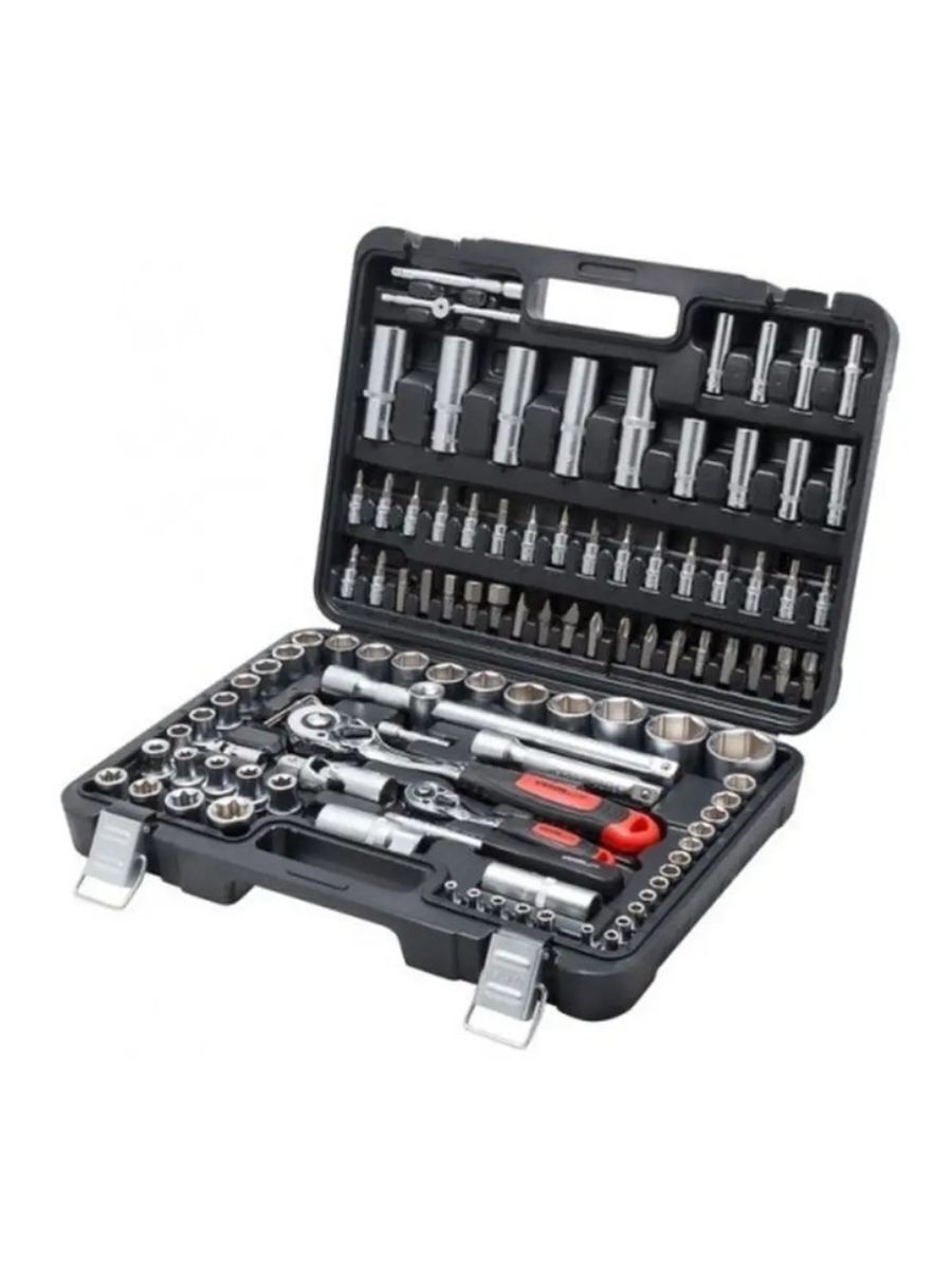 Посадочный квадрат: 1/4", 3/8", 1/2". Тип головок: 6-гранные, 12-гранные, Е-профиль, короткие, глубокие. Комплектация: головки 1/4"короткие 25 мм: 4, 4.5, 5, 5.5, 6, 7, 8, 9, 10, 11, 12, 13, 14 мм; головки 1/4"глубокие 50 мм: 4, 5, 6, 7, 8, 9, 10 мм; головки 1/4"Е-профиль 25 мм: Е4, Е5, Е6, Е7, Е8; головки-биты 1/4"HEX 35 мм: 5.5, 6, 6.5. 7 мм; головки-биты 1/4 TORX 35 мм: T25, T27, T30, T35, T40*2, T45, T50 T27H, T30H, T35H, T40H, T45H, T50H; головки-биты 1/4"Spline 35 мм: M5, M6, M8, M10; головки-биты 1/4"SL 35 мм: 6, 6.5, 8 мм; головки-биты 1/4"РН 35 мм: РН.3, РН.4; головки-биты 1/4"PZ 35 мм: PZ.3, PZ.4; биты 1/4"HEX 25 мм: 3, 4, 5, 6 мм; биты 1/4"TORX 25 мм: T8, Т10, Т15, Т20, Т25, Т8Н, Т10Н*2, Т15Н*2, Т20Н*2, Т25Н*2, Т40Н; биты 1/4"SL 25 мм: 4, 5.5, 6.5 мм; биты 1/4"РН 25 мм: РН.1, РН.2; биты 1/4"PZ 25 мм: PZ.1, PZ.2; биты 1/4"Hex security 25 мм: 3, 4, 5, 6 мм; биты 1/4"Spline 25 мм: М5, М6, М8; биты 1/4"Spanner 25 мм: 4, 6, 8 мм; биты 1/4"Tri-wing 25 мм: 1, 2, 3 мм; биты 1/4"Square bit 25 мм: S1, S2; биты 1/4"Torq set 25 мм: 6, 8, 10; трещотка 1/4"; рукоятка 1/4 150 мм; держатель бит магнитный 1/4"200 мм; вороток 1/4"Т-образный усиленный 115 мм; удлинители 1/4": 50, 100 мм; кардан шарнирный 1/4"; биты 5/16"HEX 30 мм: 5.5, 6, 6.5, 7 мм; биты 5/16"TORX 30 мм: Т25, Т27, Т30, Т35, Т40, Т45, Т50, Т27Н, Т30Н, Т35Н, Т40Н, Т45Н, Т50Н; биты 5/16"SL 30 мм: 6, 6.5, 8 мм; биты 5/16"PH 30 мм: PH.3, PH.4; биты 5/16"PZ 30 мм: PZ.3, PZ.4; биты 5/16"SPLINE 30 мм: М5, М6, М8, М10; головки-биты 1/2"TORX 55 мм: Т55, Т60; головки 3/8"короткие 12-гранные 28 мм: 10, 11, 12, 13, 14, 15, 16, 17, 18, 19 мм; головки 3/8"глубокие 63 мм: 10, 11, 12, 13, 14, 15 мм; головки 3/8"Е-профиль 28 мм: Е10, Е11, Е12, Е14, Е16, Е18; головка 3/8"свечная 18 мм; трещотка 3/8"; удлинитель 3/8"125 мм; кардан щарнирный 3/8"; головки 1/2"короткие 38 мм: 10, 11, 12, 13, 14, 15, 17, 19, 20, 21, 22, 24, 27, 30, 32 мм; головки 1/2"глубокие 77 мм: 16, 17, 18, 19, 22 мм; головки 1/2"Е-профиль 38 мм: Е20, Е22, Е24; головки свечные 1/2": 16, 21 мм; трещотка 1/2"; удлинители 1/2": 125, 250 мм; кардан шарнирный 1/2"; вороток 1/2"Т-образный 250 мм; битодержатель 1/4"(F)*1/4"(F) (HEX); битодержатель 3/8"(F)*5/16"(F) (HEX); битодержатель 1/2"(F)*5/16"(F) (HEX); ключи комбинированные рожково-накидные: 8, 10, 11, 12, 13, 14, 15, 16, 17, 18, 19, 22 мм; ключи шестигранные Г-образные: 1.27, 1.5, 2, 2.5, 3, 4, 5 мм; Пластиковый кейс с металлическими защелками.