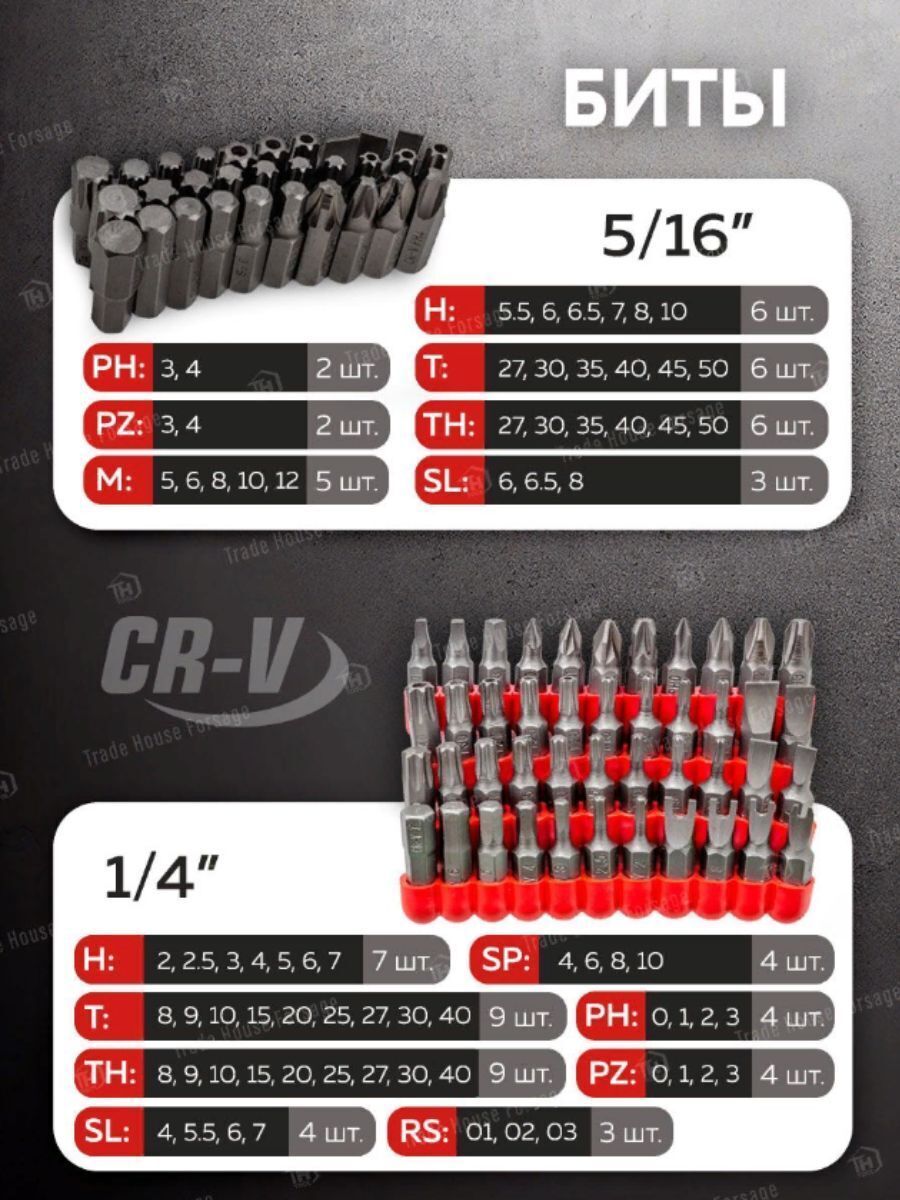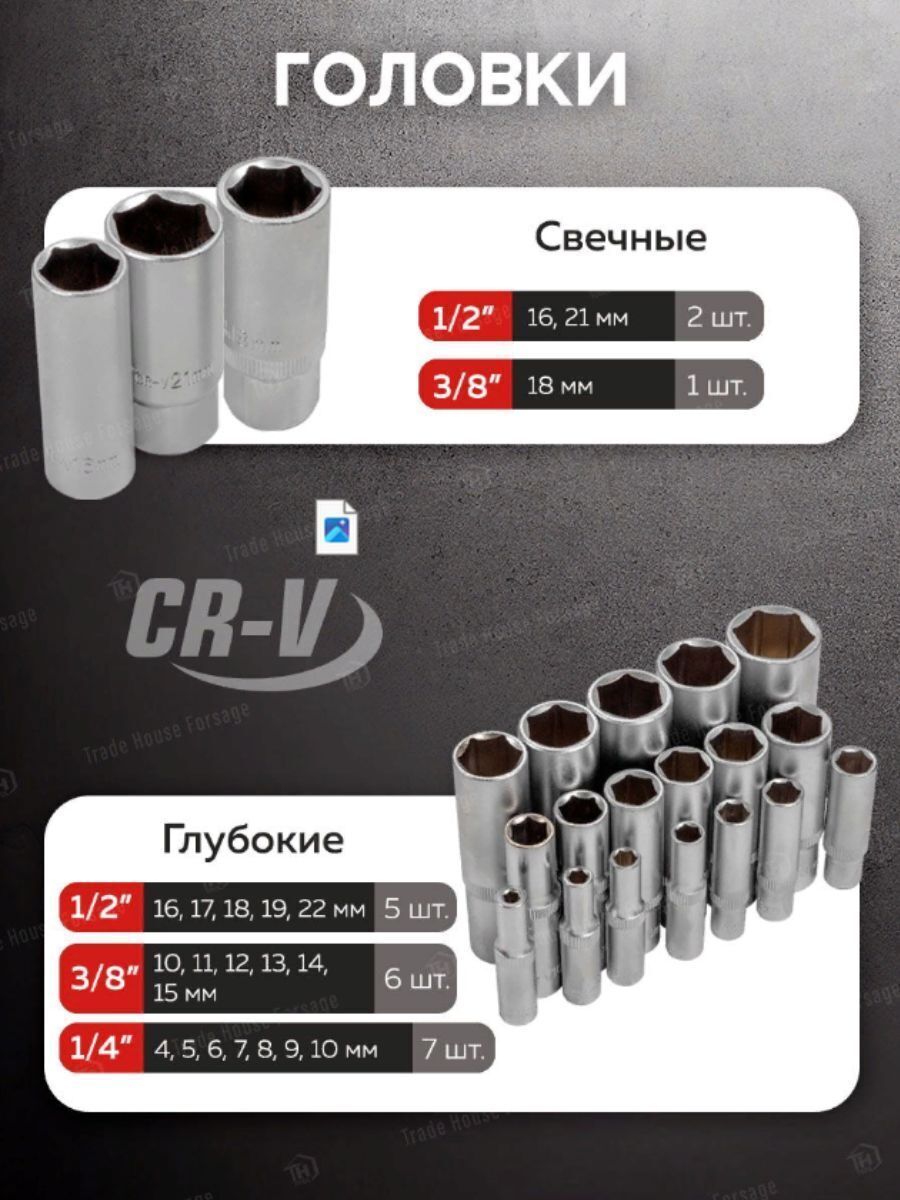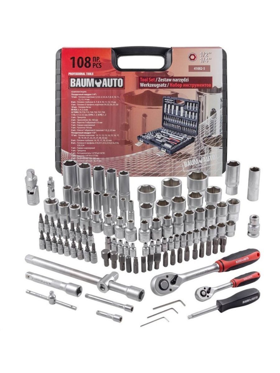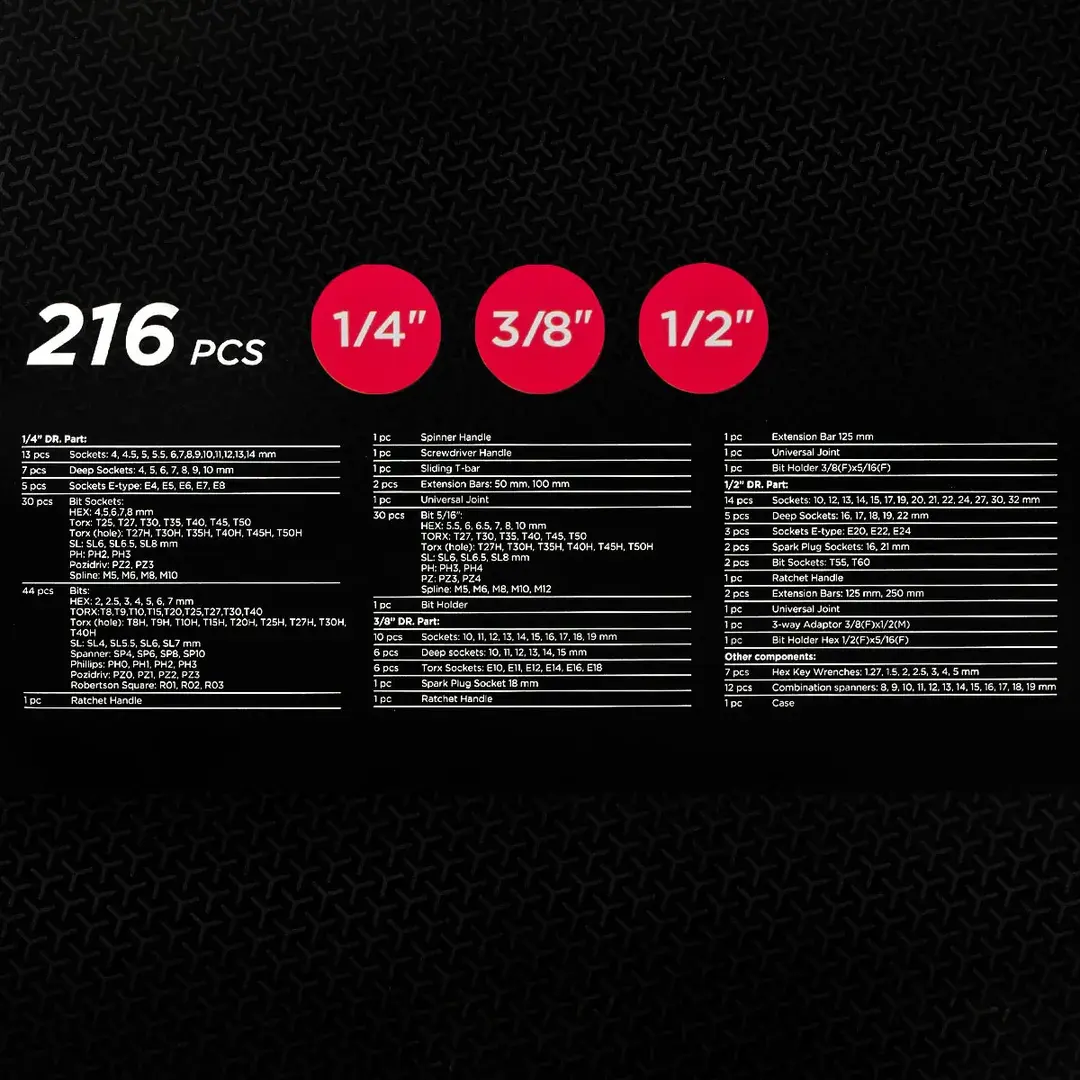 Посадочный квадрат: 1/4", 3/8", 1/2". Тип головок: 6-гранные, 12-гранные, Е-профиль, короткие, глубокие. Комплектация: головки 1/4"короткие 25 мм: 4, 4.5, 5, 5.5, 6, 7, 8, 9, 10, 11, 12, 13, 14 мм; головки 1/4"глубокие 50 мм: 4, 5, 6, 7, 8, 9, 10 мм; головки 1/4"Е-профиль 25 мм: Е4, Е5, Е6, Е7, Е8; головки-биты 1/4"HEX 35 мм: 5.5, 6, 6.5. 7 мм; головки-биты 1/4 TORX 35 мм: T25, T27, T30, T35, T40*2, T45, T50 T27H, T30H, T35H, T40H, T45H, T50H; головки-биты 1/4"Spline 35 мм: M5, M6, M8, M10; головки-биты 1/4"SL 35 мм: 6, 6.5, 8 мм; головки-биты 1/4"РН 35 мм: РН.3, РН.4; головки-биты 1/4"PZ 35 мм: PZ.3, PZ.4; биты 1/4"HEX 25 мм: 3, 4, 5, 6 мм; биты 1/4"TORX 25 мм: T8, Т10, Т15, Т20, Т25, Т8Н, Т10Н*2, Т15Н*2, Т20Н*2, Т25Н*2, Т40Н; биты 1/4"SL 25 мм: 4, 5.5, 6.5 мм; биты 1/4"РН 25 мм: РН.1, РН.2; биты 1/4"PZ 25 мм: PZ.1, PZ.2; биты 1/4"Hex security 25 мм: 3, 4, 5, 6 мм; биты 1/4"Spline 25 мм: М5, М6, М8; биты 1/4"Spanner 25 мм: 4, 6, 8 мм; биты 1/4"Tri-wing 25 мм: 1, 2, 3 мм; биты 1/4"Square bit 25 мм: S1, S2; биты 1/4"Torq set 25 мм: 6, 8, 10; трещотка 1/4"; рукоятка 1/4 150 мм; держатель бит магнитный 1/4"200 мм; вороток 1/4"Т-образный усиленный 115 мм; удлинители 1/4": 50, 100 мм; кардан шарнирный 1/4"; биты 5/16"HEX 30 мм: 5.5, 6, 6.5, 7 мм; биты 5/16"TORX 30 мм: Т25, Т27, Т30, Т35, Т40, Т45, Т50, Т27Н, Т30Н, Т35Н, Т40Н, Т45Н, Т50Н; биты 5/16"SL 30 мм: 6, 6.5, 8 мм; биты 5/16"PH 30 мм: PH.3, PH.4; биты 5/16"PZ 30 мм: PZ.3, PZ.4; биты 5/16"SPLINE 30 мм: М5, М6, М8, М10; головки-биты 1/2"TORX 55 мм: Т55, Т60; головки 3/8"короткие 12-гранные 28 мм: 10, 11, 12, 13, 14, 15, 16, 17, 18, 19 мм; головки 3/8"глубокие 63 мм: 10, 11, 12, 13, 14, 15 мм; головки 3/8"Е-профиль 28 мм: Е10, Е11, Е12, Е14, Е16, Е18; головка 3/8"свечная 18 мм; трещотка 3/8"; удлинитель 3/8"125 мм; кардан щарнирный 3/8"; головки 1/2"короткие 38 мм: 10, 11, 12, 13, 14, 15, 17, 19, 20, 21, 22, 24, 27, 30, 32 мм; головки 1/2"глубокие 77 мм: 16, 17, 18, 19, 22 мм; головки 1/2"Е-профиль 38 мм: Е20, Е22, Е24; головки свечные 1/2": 16, 21 мм; трещотка 1/2"; удлинители 1/2": 125, 250 мм; кардан шарнирный 1/2"; вороток 1/2"Т-образный 250 мм; битодержатель 1/4"(F)*1/4"(F) (HEX); битодержатель 3/8"(F)*5/16"(F) (HEX); битодержатель 1/2"(F)*5/16"(F) (HEX); ключи комбинированные рожково-накидные: 8, 10, 11, 12, 13, 14, 15, 16, 17, 18, 19, 22 мм; ключи шестигранные Г-образные: 1.27, 1.5, 2, 2.5, 3, 4, 5 мм; Пластиковый кейс с металлическими защелками.