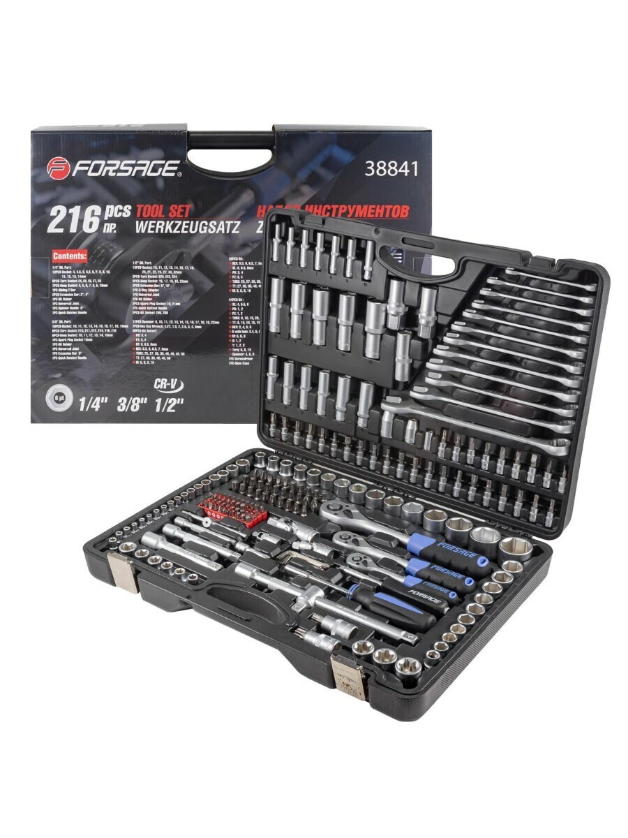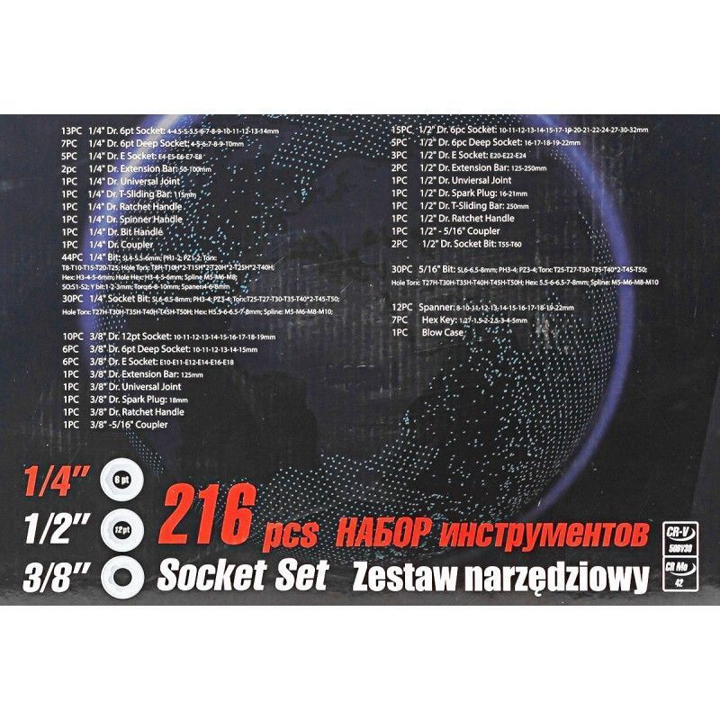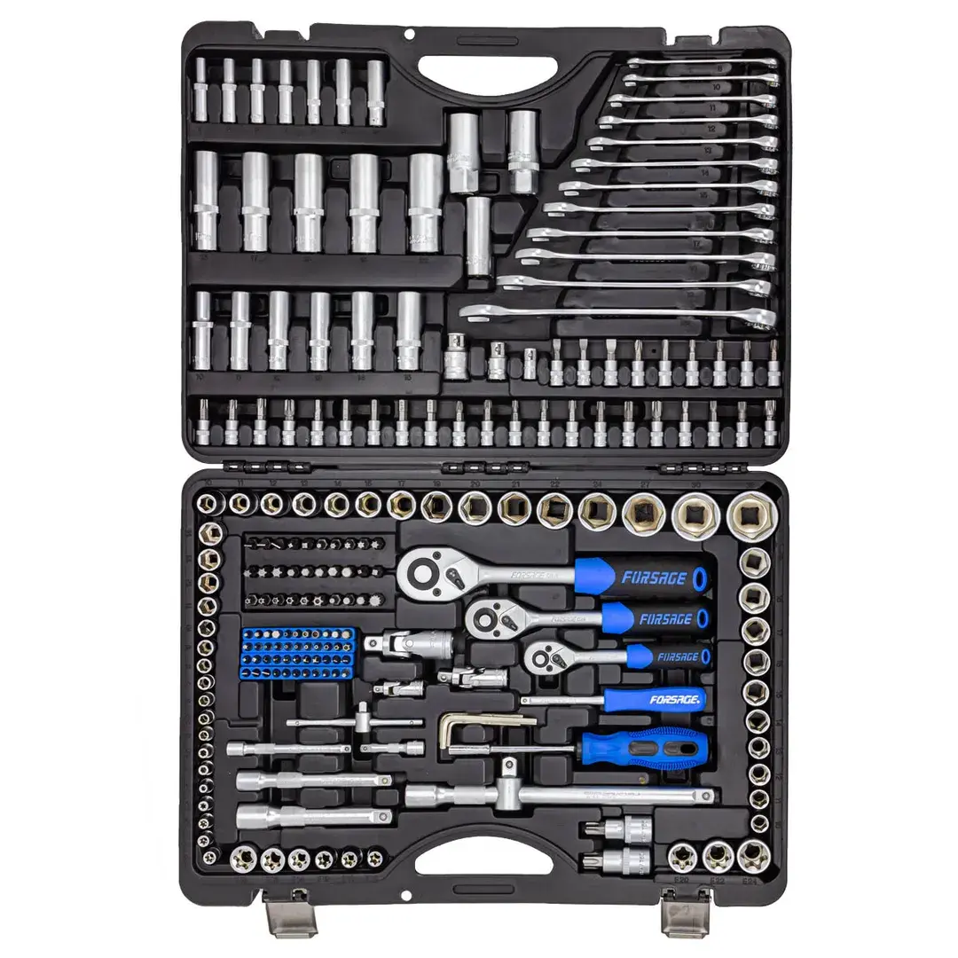 Посадочный квадрат: 1/4", 3/8", 1/2". Тип головок: 6-гранные, 12-гранные, Е-профиль, короткие, глубокие. Комплектация: головки 1/4"короткие 25 мм: 4, 4.5, 5, 5.5, 6, 7, 8, 9, 10, 11, 12, 13, 14 мм; головки 1/4"глубокие 50 мм: 4, 5, 6, 7, 8, 9, 10 мм; головки 1/4"Е-профиль 25 мм: Е4, Е5, Е6, Е7, Е8; головки-биты 1/4"HEX 35 мм: 5.5, 6, 6.5. 7 мм; головки-биты 1/4 TORX 35 мм: T25, T27, T30, T35, T40*2, T45, T50 T27H, T30H, T35H, T40H, T45H, T50H; головки-биты 1/4"Spline 35 мм: M5, M6, M8, M10; головки-биты 1/4"SL 35 мм: 6, 6.5, 8 мм; головки-биты 1/4"РН 35 мм: РН.3, РН.4; головки-биты 1/4"PZ 35 мм: PZ.3, PZ.4; биты 1/4"HEX 25 мм: 3, 4, 5, 6 мм; биты 1/4"TORX 25 мм: T8, Т10, Т15, Т20, Т25, Т8Н, Т10Н*2, Т15Н*2, Т20Н*2, Т25Н*2, Т40Н; биты 1/4"SL 25 мм: 4, 5.5, 6.5 мм; биты 1/4"РН 25 мм: РН.1, РН.2; биты 1/4"PZ 25 мм: PZ.1, PZ.2; биты 1/4"Hex security 25 мм: 3, 4, 5, 6 мм; биты 1/4"Spline 25 мм: М5, М6, М8; биты 1/4"Spanner 25 мм: 4, 6, 8 мм; биты 1/4"Tri-wing 25 мм: 1, 2, 3 мм; биты 1/4"Square bit 25 мм: S1, S2; биты 1/4"Torq set 25 мм: 6, 8, 10; трещотка 1/4"; рукоятка 1/4 150 мм; держатель бит магнитный 1/4"200 мм; вороток 1/4"Т-образный усиленный 115 мм; удлинители 1/4": 50, 100 мм; кардан шарнирный 1/4"; биты 5/16"HEX 30 мм: 5.5, 6, 6.5, 7 мм; биты 5/16"TORX 30 мм: Т25, Т27, Т30, Т35, Т40, Т45, Т50, Т27Н, Т30Н, Т35Н, Т40Н, Т45Н, Т50Н; биты 5/16"SL 30 мм: 6, 6.5, 8 мм; биты 5/16"PH 30 мм: PH.3, PH.4; биты 5/16"PZ 30 мм: PZ.3, PZ.4; биты 5/16"SPLINE 30 мм: М5, М6, М8, М10; головки-биты 1/2"TORX 55 мм: Т55, Т60; головки 3/8"короткие 12-гранные 28 мм: 10, 11, 12, 13, 14, 15, 16, 17, 18, 19 мм; головки 3/8"глубокие 63 мм: 10, 11, 12, 13, 14, 15 мм; головки 3/8"Е-профиль 28 мм: Е10, Е11, Е12, Е14, Е16, Е18; головка 3/8"свечная 18 мм; трещотка 3/8"; удлинитель 3/8"125 мм; кардан щарнирный 3/8"; головки 1/2"короткие 38 мм: 10, 11, 12, 13, 14, 15, 17, 19, 20, 21, 22, 24, 27, 30, 32 мм; головки 1/2"глубокие 77 мм: 16, 17, 18, 19, 22 мм; головки 1/2"Е-профиль 38 мм: Е20, Е22, Е24; головки свечные 1/2": 16, 21 мм; трещотка 1/2"; удлинители 1/2": 125, 250 мм; кардан шарнирный 1/2"; вороток 1/2"Т-образный 250 мм; битодержатель 1/4"(F)*1/4"(F) (HEX); битодержатель 3/8"(F)*5/16"(F) (HEX); битодержатель 1/2"(F)*5/16"(F) (HEX); ключи комбинированные рожково-накидные: 8, 10, 11, 12, 13, 14, 15, 16, 17, 18, 19, 22 мм; ключи шестигранные Г-образные: 1.27, 1.5, 2, 2.5, 3, 4, 5 мм; Пластиковый кейс с металлическими защелками.