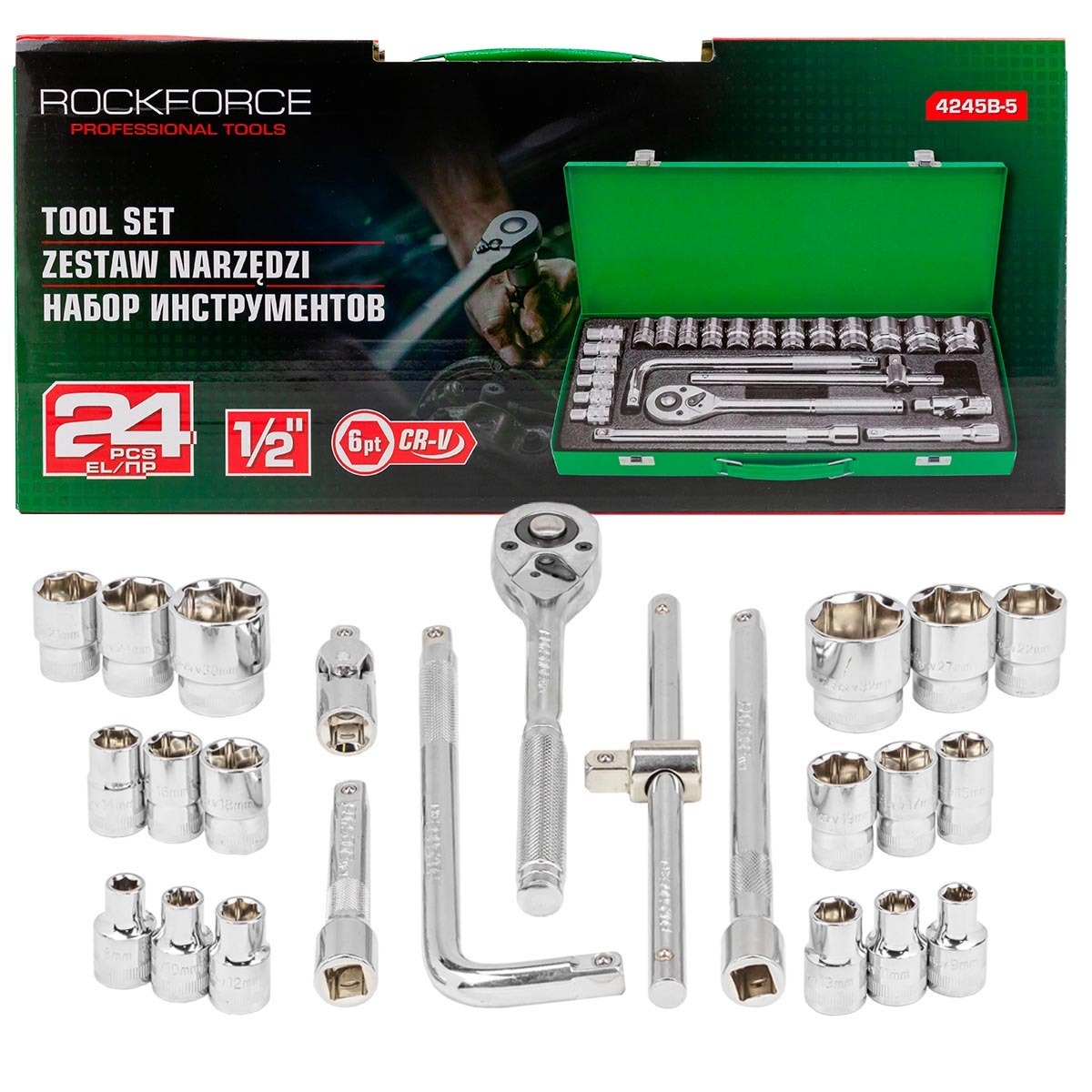 Набор инструментов 1/2"" на 24 пр. (6гр.) включает в себя широкий ассортимент головок и бит, предназначенных для работы с крепежными элементами большого размера. Набор изготовлен из высококачественной хром-ванадиевой стали Cr-V, что обеспечивает долговечность и надежность инструмента. Головки имеют шестигранный профиль, что обеспечивает лучшее сцепление с крепежом и уменьшает вероятность его повреждения в процессе работы. Комплектация: 1шт. Трещотка реверсивная 245мм 24 зуба; 2шт. Удлинители 125 и 250мм; 1шт. Вороток Г-образный двухсторонний 250мм; 1шт. Вороток Т-образный 250мм; 1шт. Кардан шарнирный; 1шт. Головки короткие 6-р.: 8-9-10-11-12-13-14-15-1617-18-19-20-21-22-24-27-30-32мм.