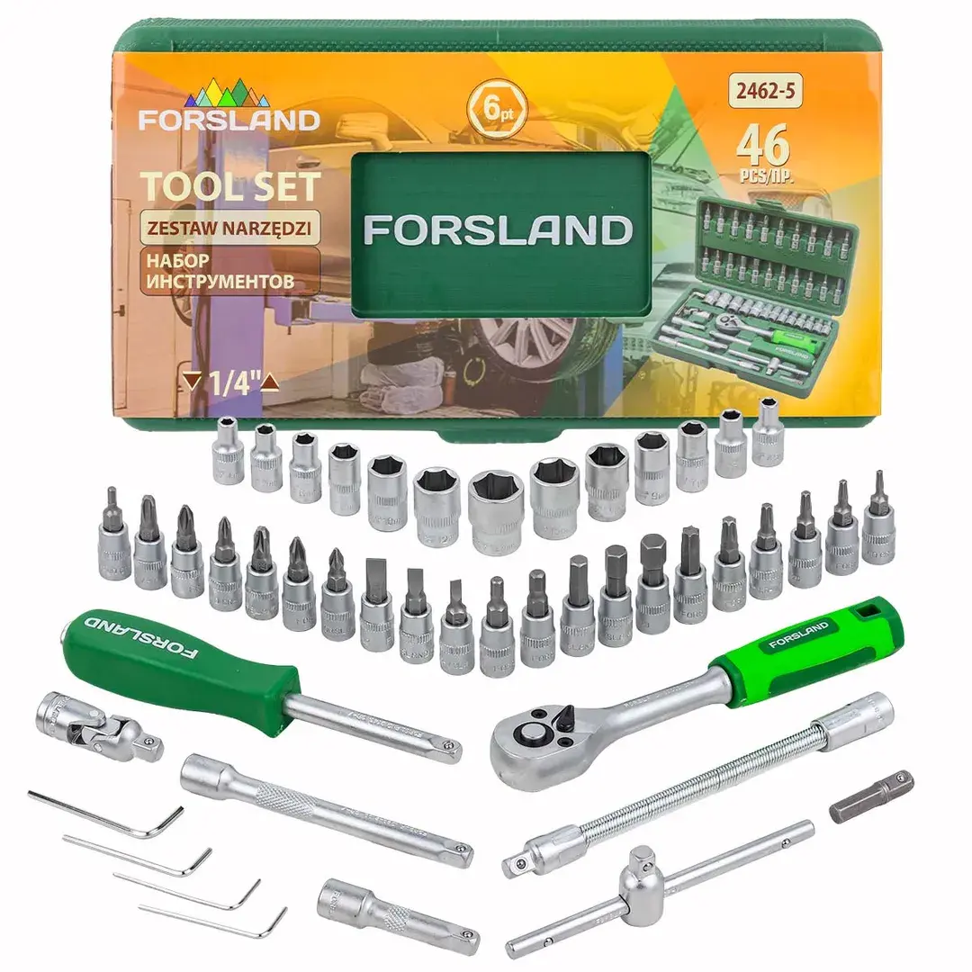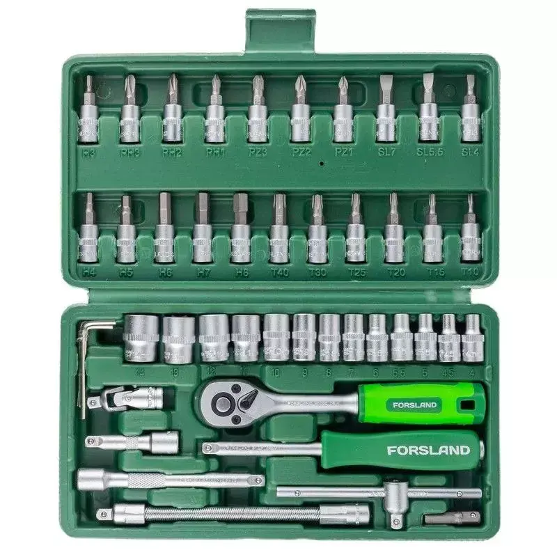 Посадочный квадрат 1/4". Тип головок: 6-гранные, короткие. Комплектация: головки 1/4"короткие 25 мм: 4, 4.5, 5, 5.5, 6, 7, 8, 9, 10, 11, 12, 13, 14 мм; головки-биты 1/4"HEX 35 мм: 3, 4, 5, 6, 7, 8 мм; головки-биты 1/4"TORX 35 мм: T10, T15, T20, T25, T30, Т40; головки-биты 1/4"SL 35 мм: 4, 5.5, 7; головки-биты 1/4"РН 35 мм: РН.1, РН.2, РН.3; головки-биты 1/4"PZ 35 мм: PZ.1, PZ.2, PZ.3; трещотка 1/4"; рукоятка 1/4"150 мм; вороток усиленный Т-образный 1/4"115 мм удлинители 1/4": 50, 100 мм; гибкий удлинитель 1/4"145 мм; кардан шарнирный 1/4"; адаптер-переходник под шуруповерт 1/4(F)"*1/4"(F) 30 мм; ключи 6-гранные Г-образные: 1.5, 2, 2.5, 3. Пластиковый кейс.