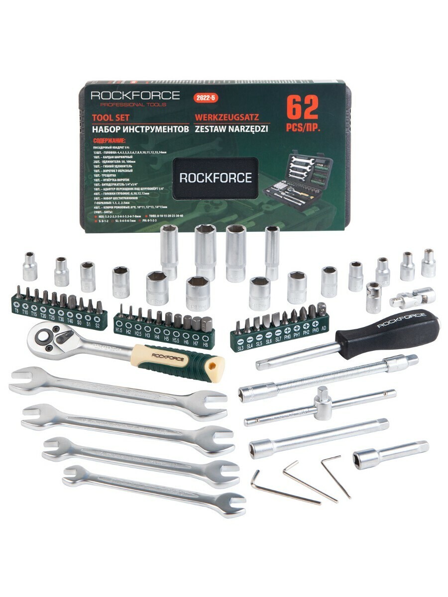 Универсальный набор инструментов из 57 предметов в кейсе. Посадочный квадрат 1/4". Изготовлен из хром ванадия CR-V - прочный и надежный инструмент. Набор применяется для мелкого ремонта на СТО, в гараже, в дороге, на даче и дома в быту. Комплектация: головки шестигранные (4, 4.5, 5, 5.5, 6, 7, 8, 9, 10, 11, 12, 13, 14 мм.), кардан шарнирный, удлинители 50 и 100 мм., гибкий удлинитель, вороток Т-образный, трещотка, отвертка-вороток, битодержатель 1/4” х 1/4”, адаптер-переходник под шуруповерт, головки глубокие (8, 10, 12, 13 мм.), ключи шестигранные Г-образный (1,5, 2, 2.5 мм.), ключи рожковые (8х9, 10х11, 12х13, 14х15 мм.), биты (HEX: 1.5, 2, 2.5, 3, 4, 5, 5.5, 6, 7, 8 мм., TORX: 8, 10, 15, 20, 25, 30, 40, S: 0, 1, 2, SL: 3, 4, 5, 6, 7 мм., РН: 0, 1, 2, 3), кейс.
